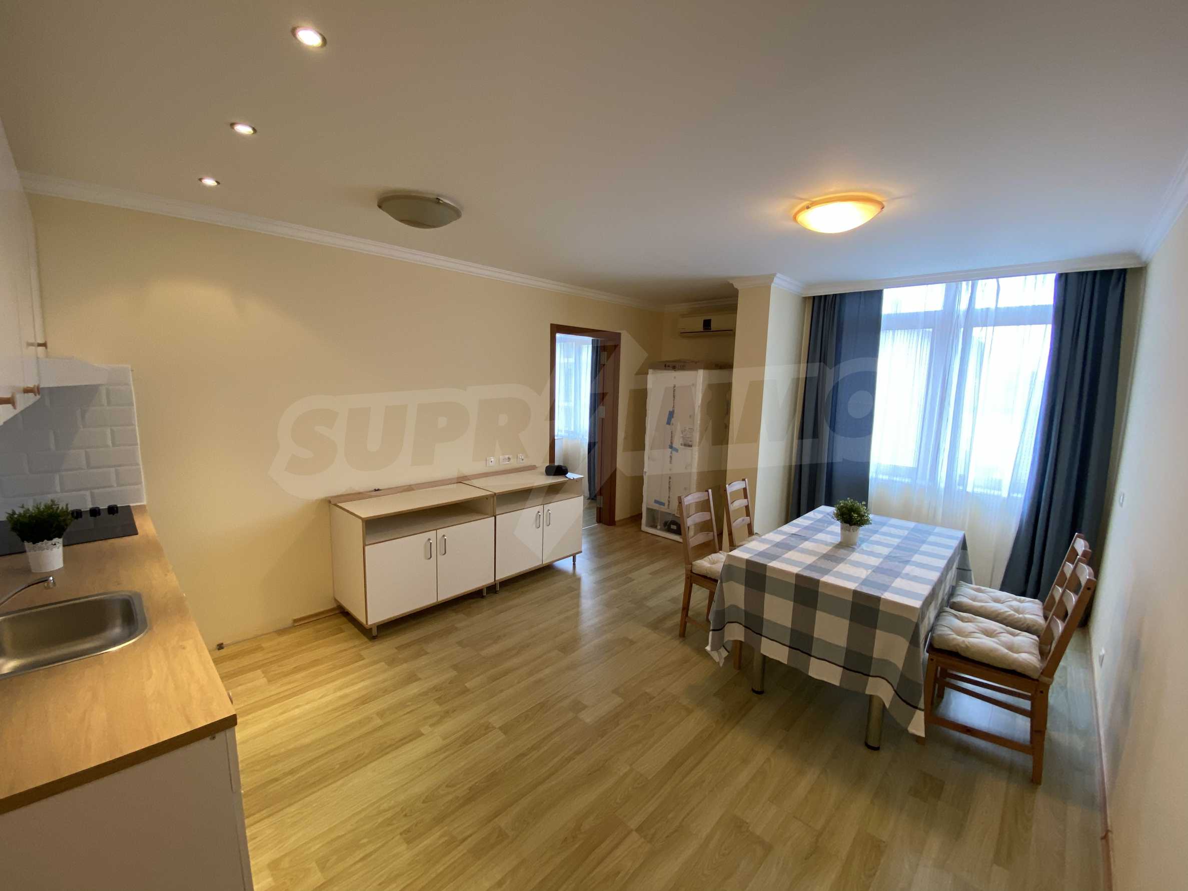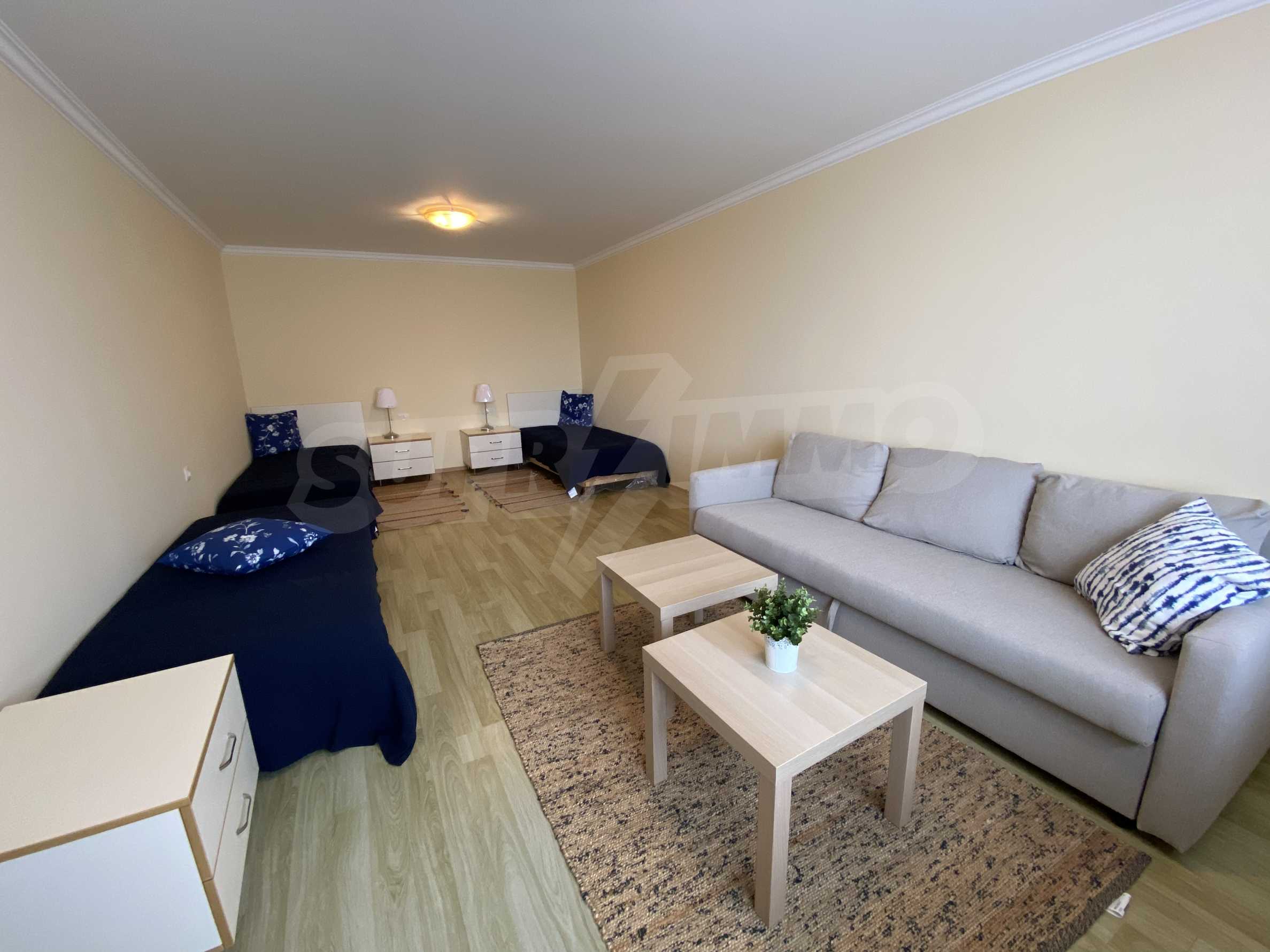 The living room allows for functional zoning: a kitchen area and a dining area, with a table for four. The flooring in the property is high-quality laminate flooring. The kitchen equipment is from IKEA and includes: built-in hobs, refrigerator, sink with mixer tap and kitchen cabinets. The bedroom is cozy and spacious, with three beds and three bedside tables, a TV chest of drawers and coffee tables, a comfortable sofa. Air conditioning, cable TV and Internet are available. The property has a fully equipped bathroom with a shower cabin.