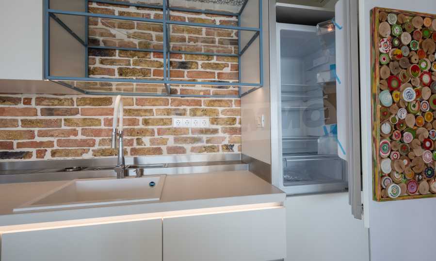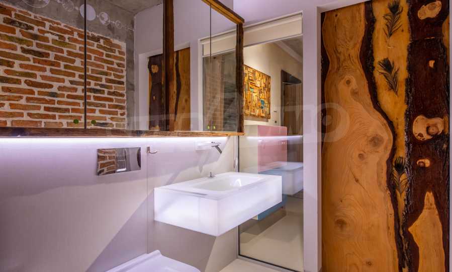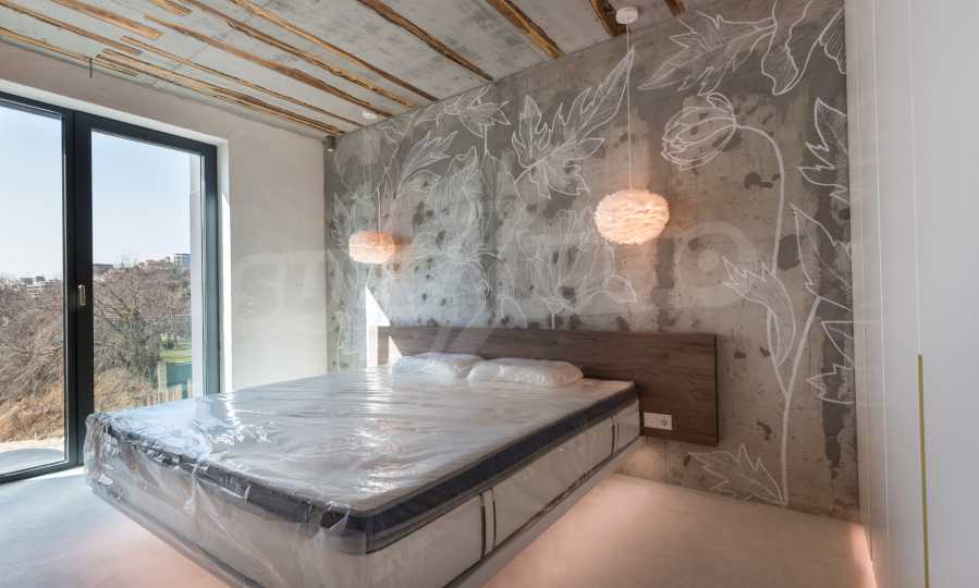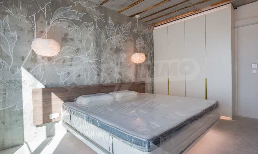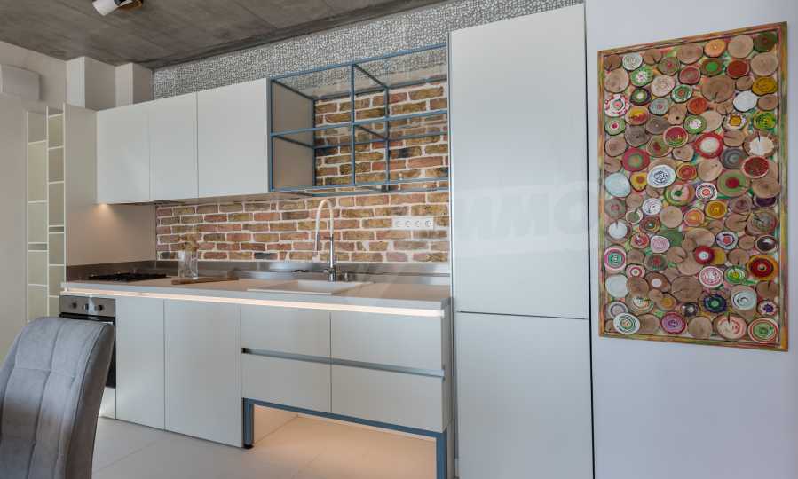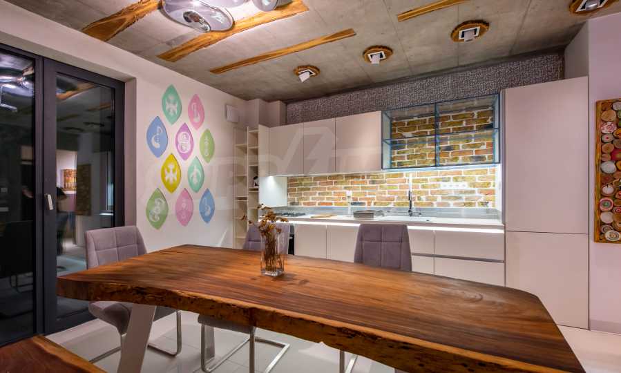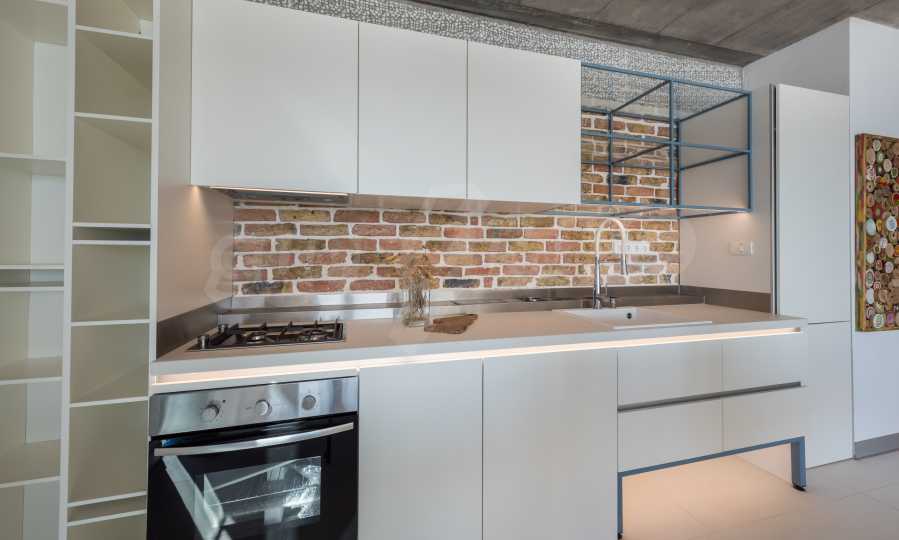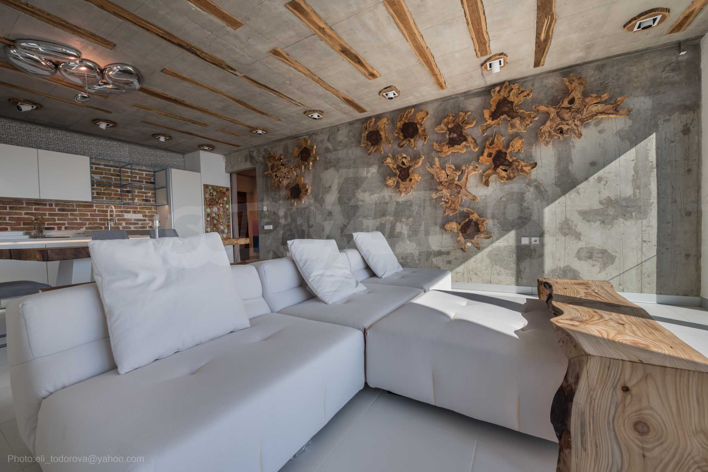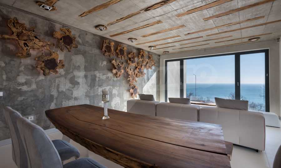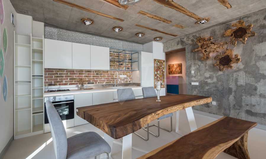 The design is unique - natural and modern, challenging and bright, carrying the message of autonomy, relaxation and sea atmosphere. Natural concrete acacia ornaments are built into the concrete slabs on the ceiling of the apartment. Brick walls and concrete are used for natural decoration, as they are additionally treated, impregnated and primed. Luxuriously furnished, with furniture, kitchen, mattresses and sofas, attractive tiles, lighting fixtures - all of famous Italian brands.
