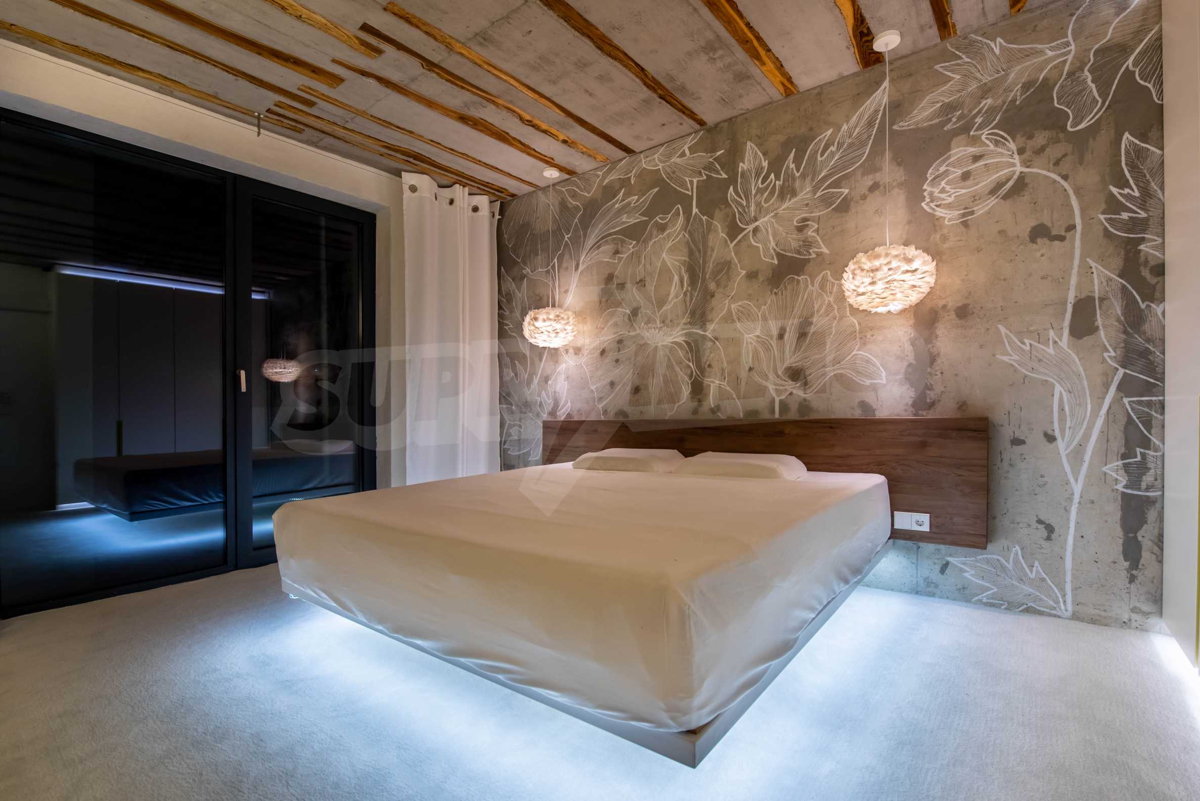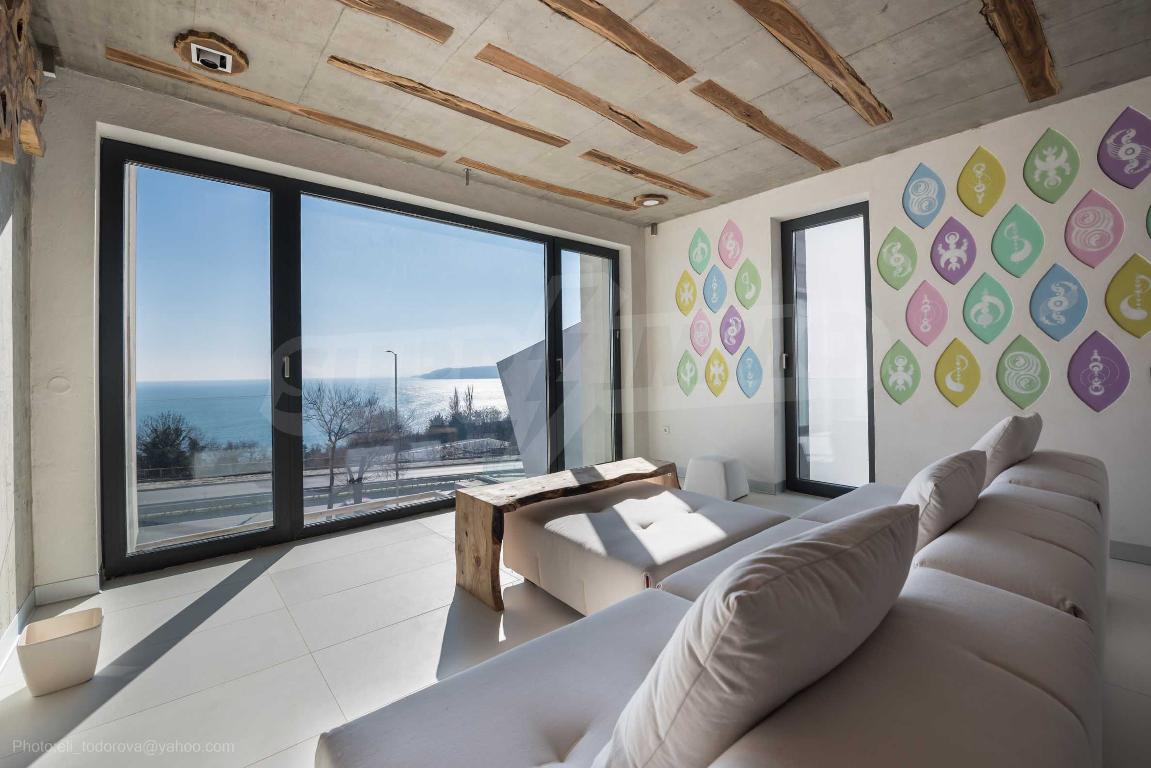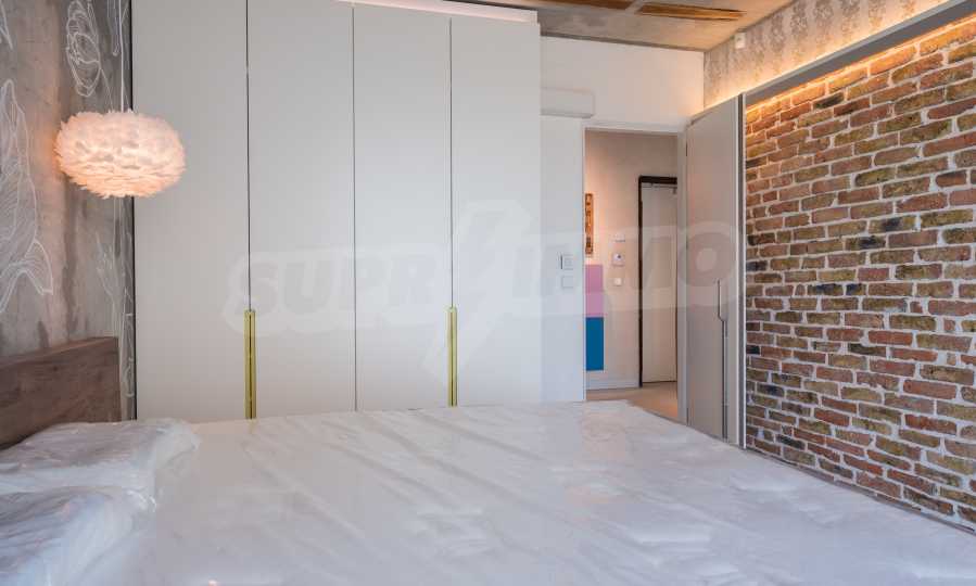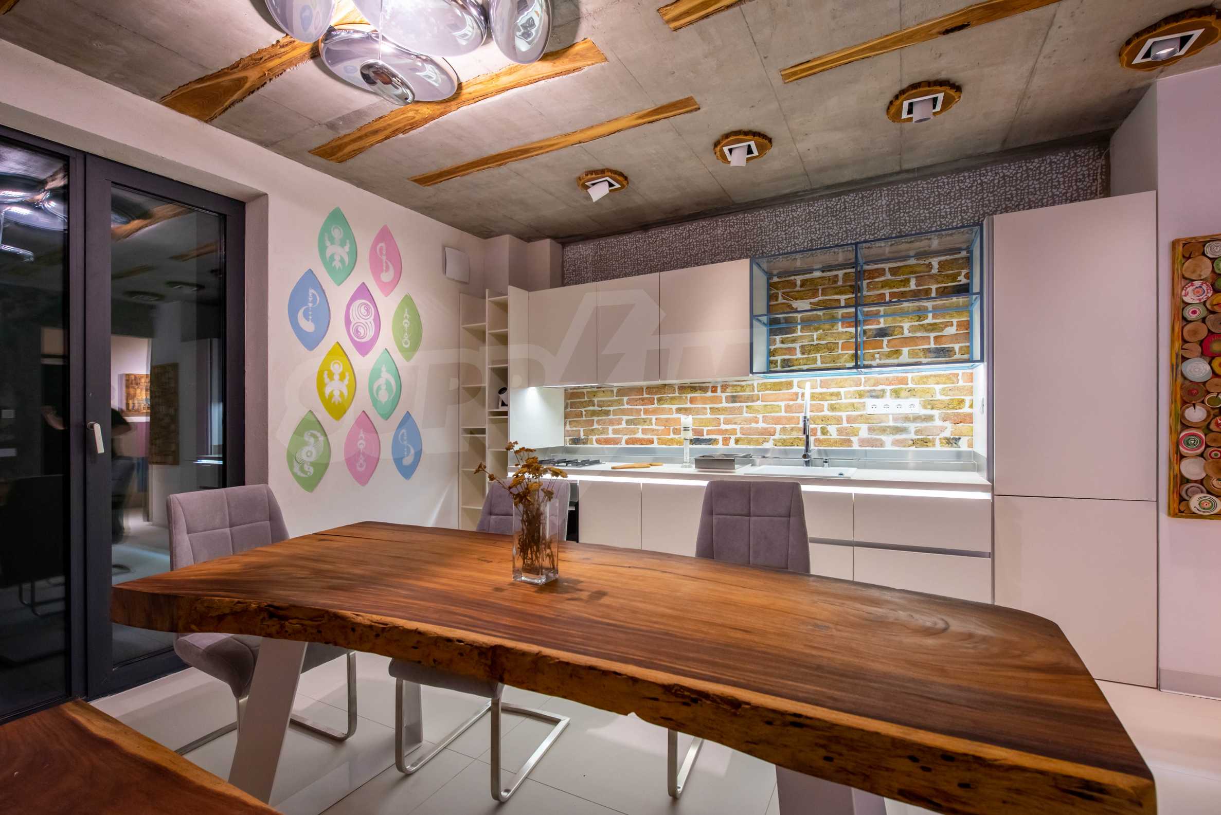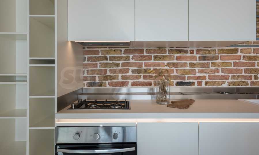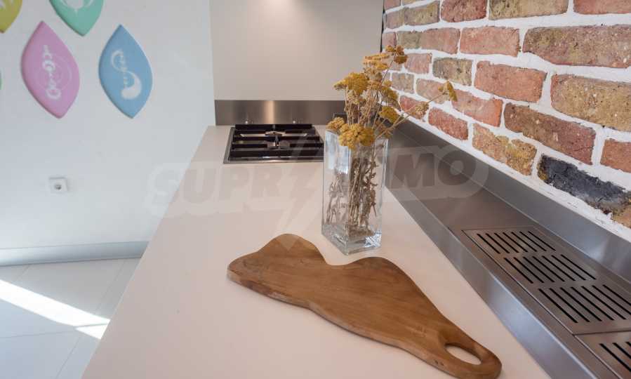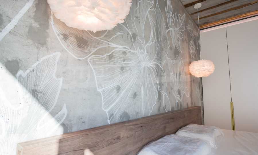 The design is unique - natural and modern, challenging and bright, carrying the message of autonomy, relaxation and sea atmosphere. Natural concrete acacia ornaments are built into the concrete slabs on the ceiling of the apartment. Brick walls and concrete are used for natural decoration, as they are additionally treated, impregnated and primed. Luxuriously furnished, with furniture, kitchen, mattresses and sofas, attractive tiles, lighting fixtures - all of famous Italian brands.