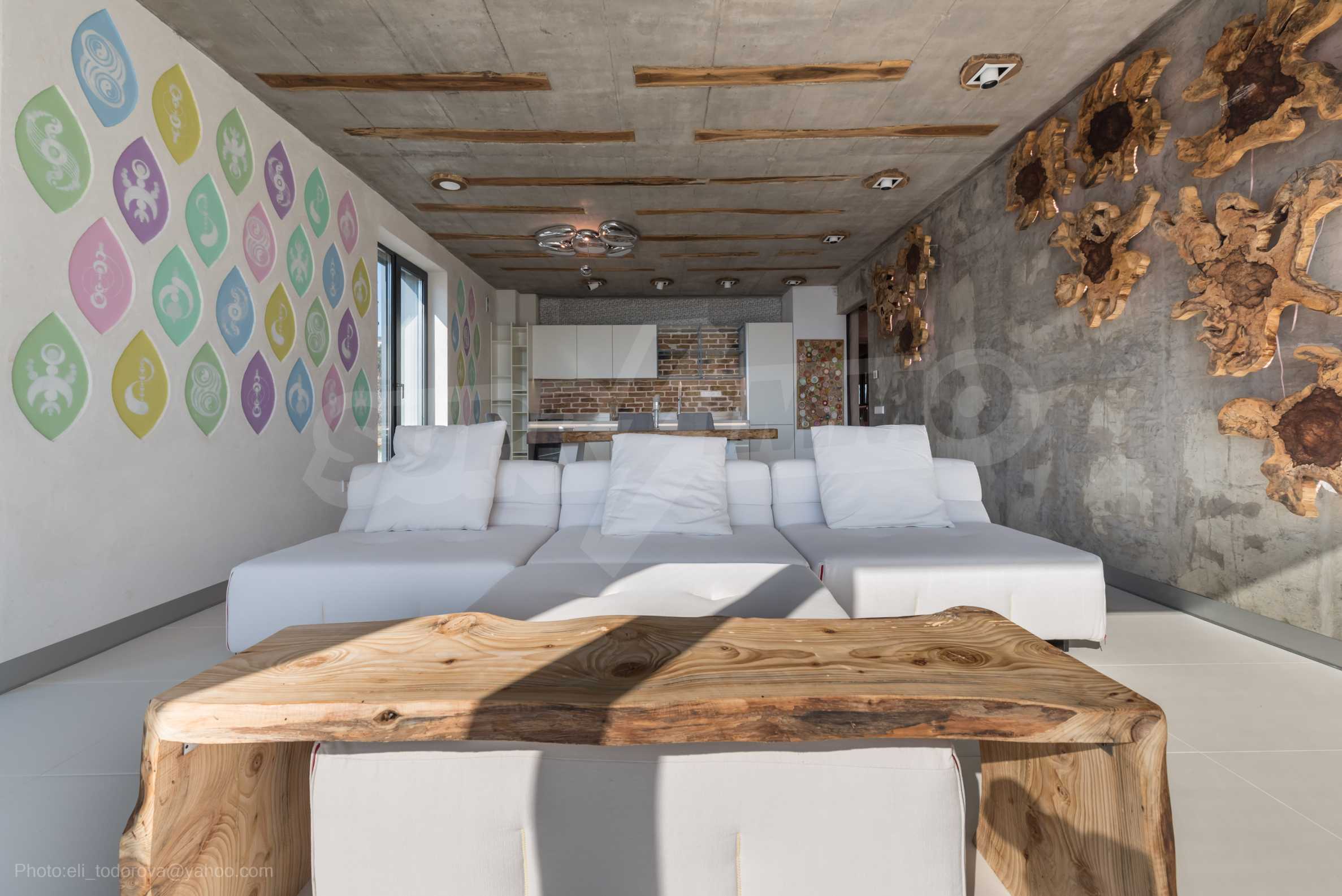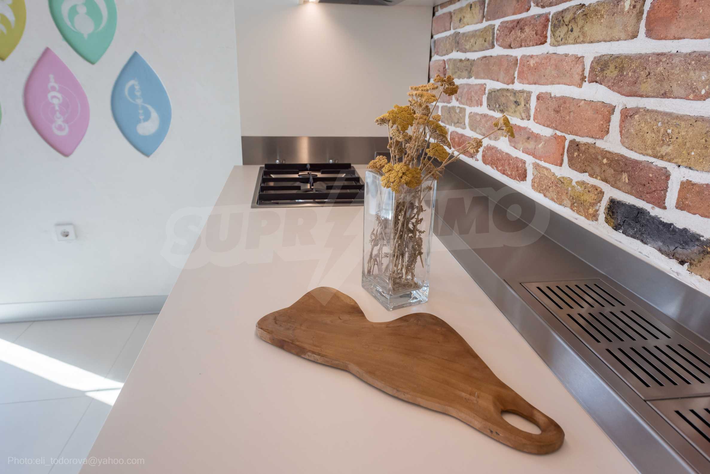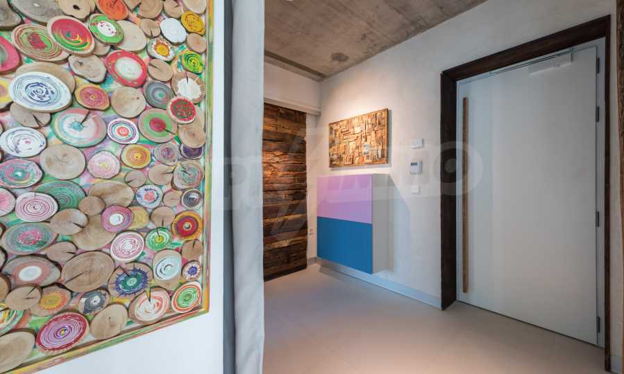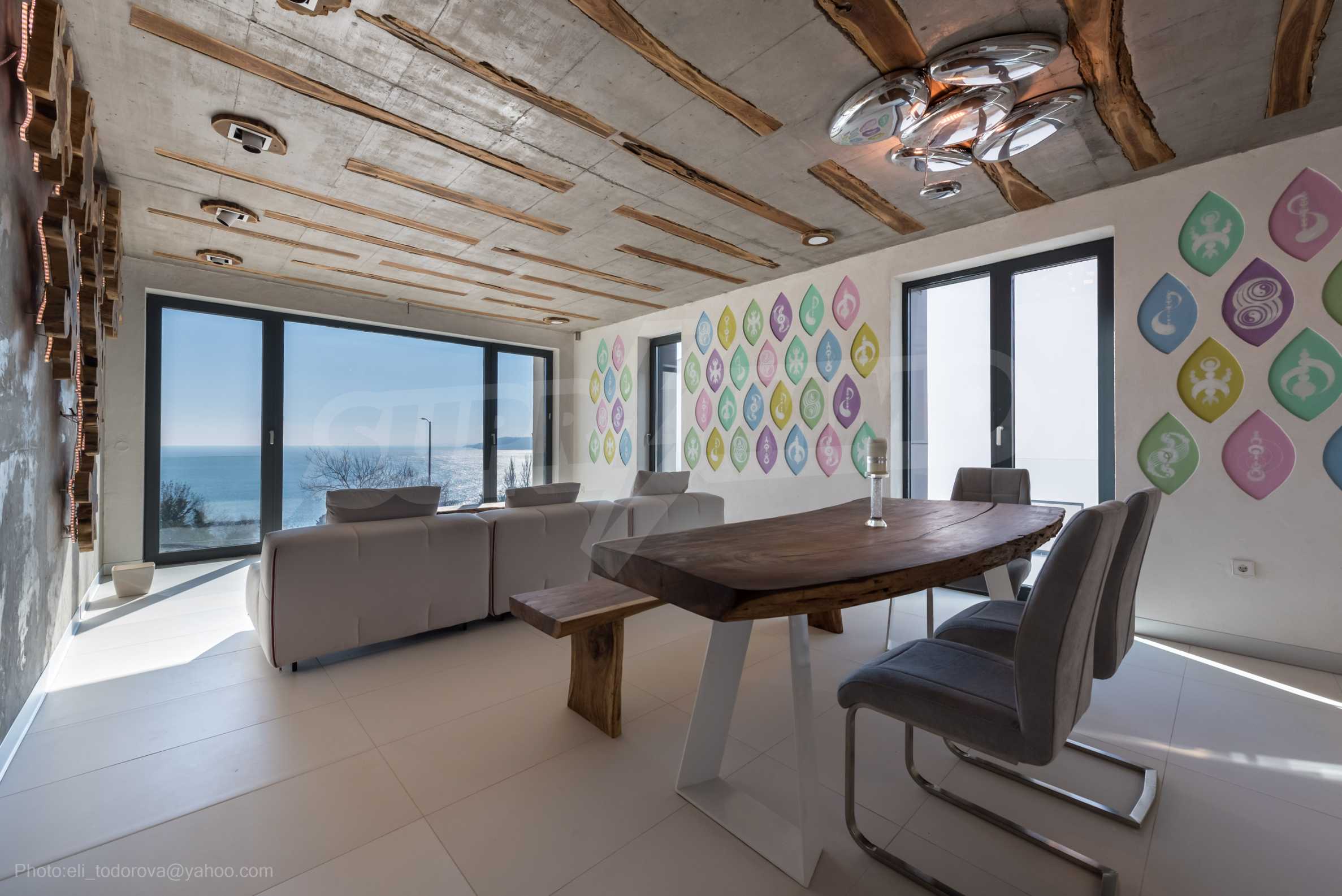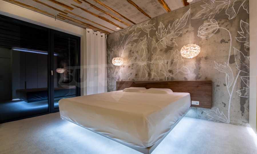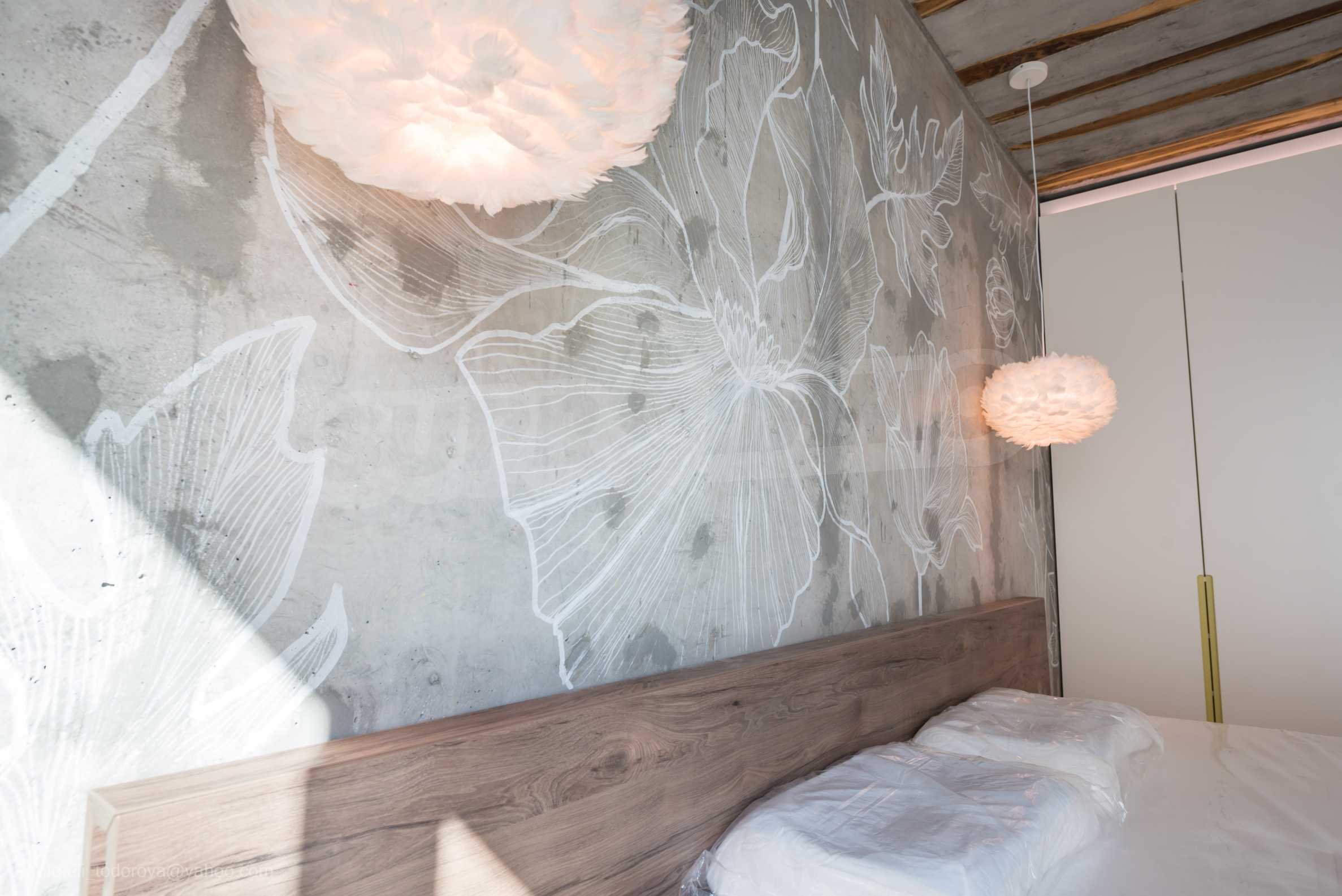 The design is unique - natural and modern, challenging and bright, carrying the message of autonomy, relaxation and sea atmosphere. Natural concrete acacia ornaments are built into the concrete slabs on the ceiling of the apartment. Brick walls and concrete are used for natural decoration, as they are additionally treated, impregnated and primed. Luxuriously furnished, with furniture, kitchen, mattresses and sofas, attractive tiles, lighting fixtures - all of famous Italian brands.