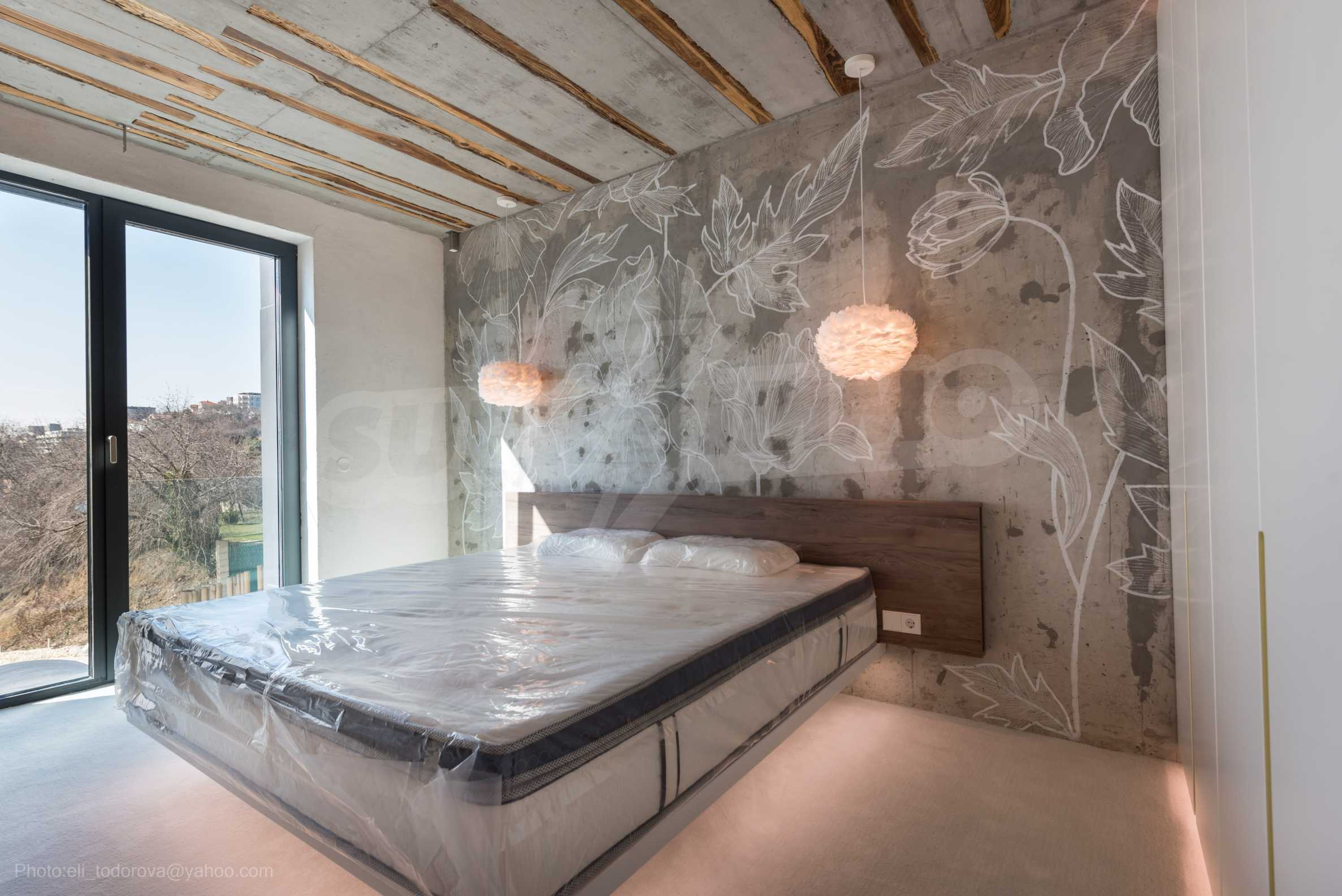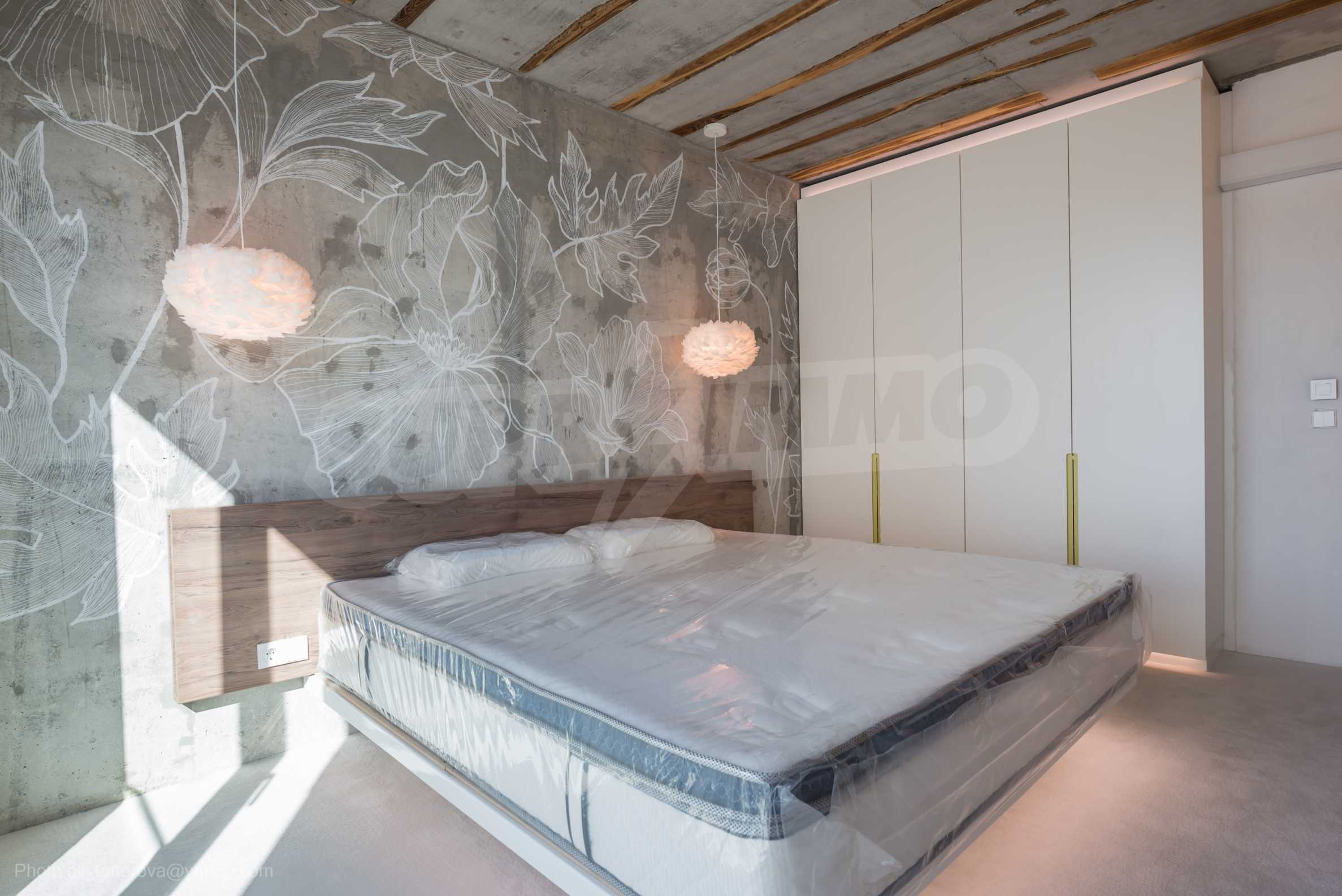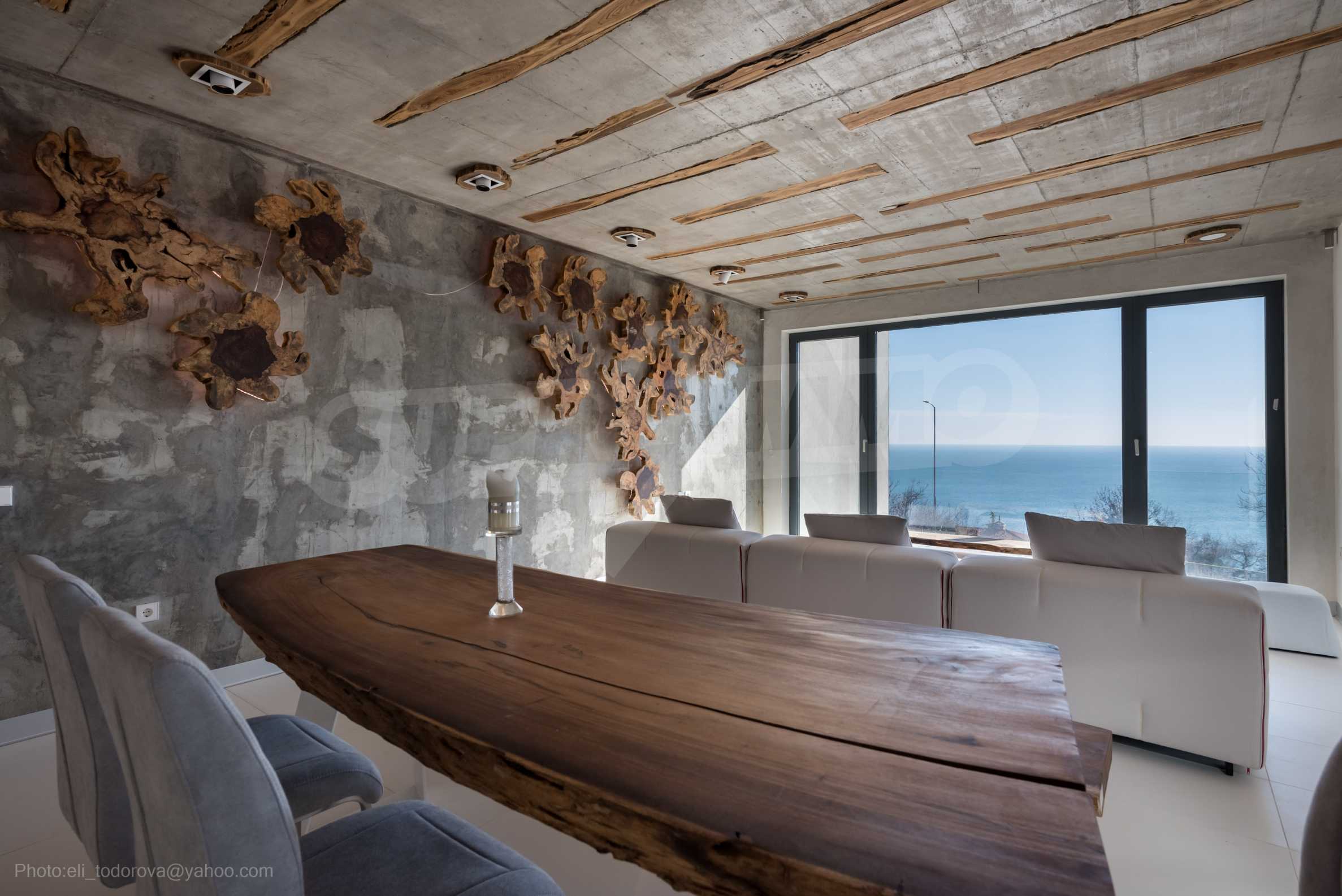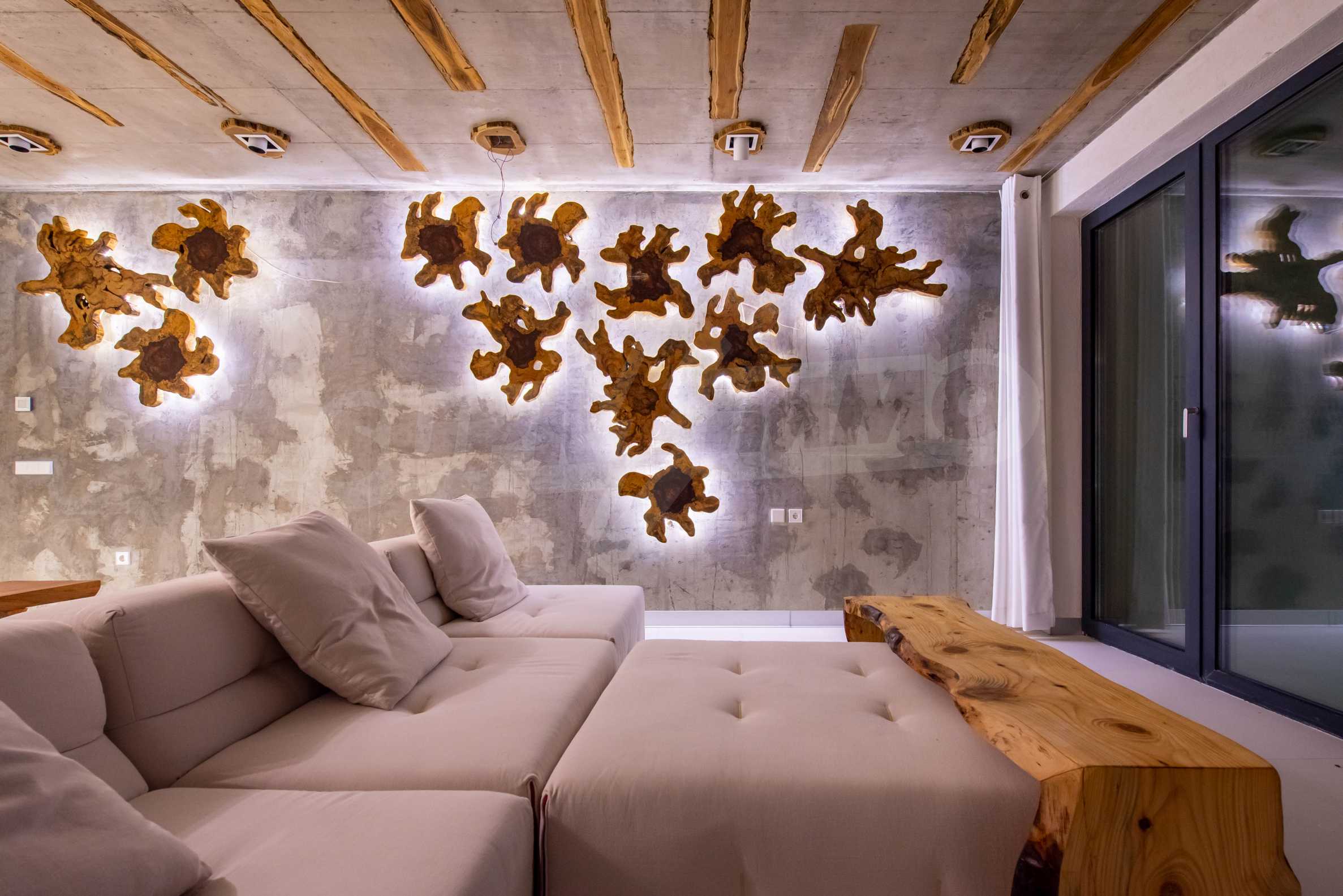 The design is unique - natural and modern, challenging and bright, carrying the message of autonomy, relaxation and sea atmosphere. Natural concrete acacia ornaments are built into the concrete slabs on the ceiling of the apartment. Brick walls and concrete are used for natural decoration, as they are additionally treated, impregnated and primed. Luxuriously furnished, with furniture, kitchen, mattresses and sofas, attractive tiles, lighting fixtures - all of famous Italian brands.
