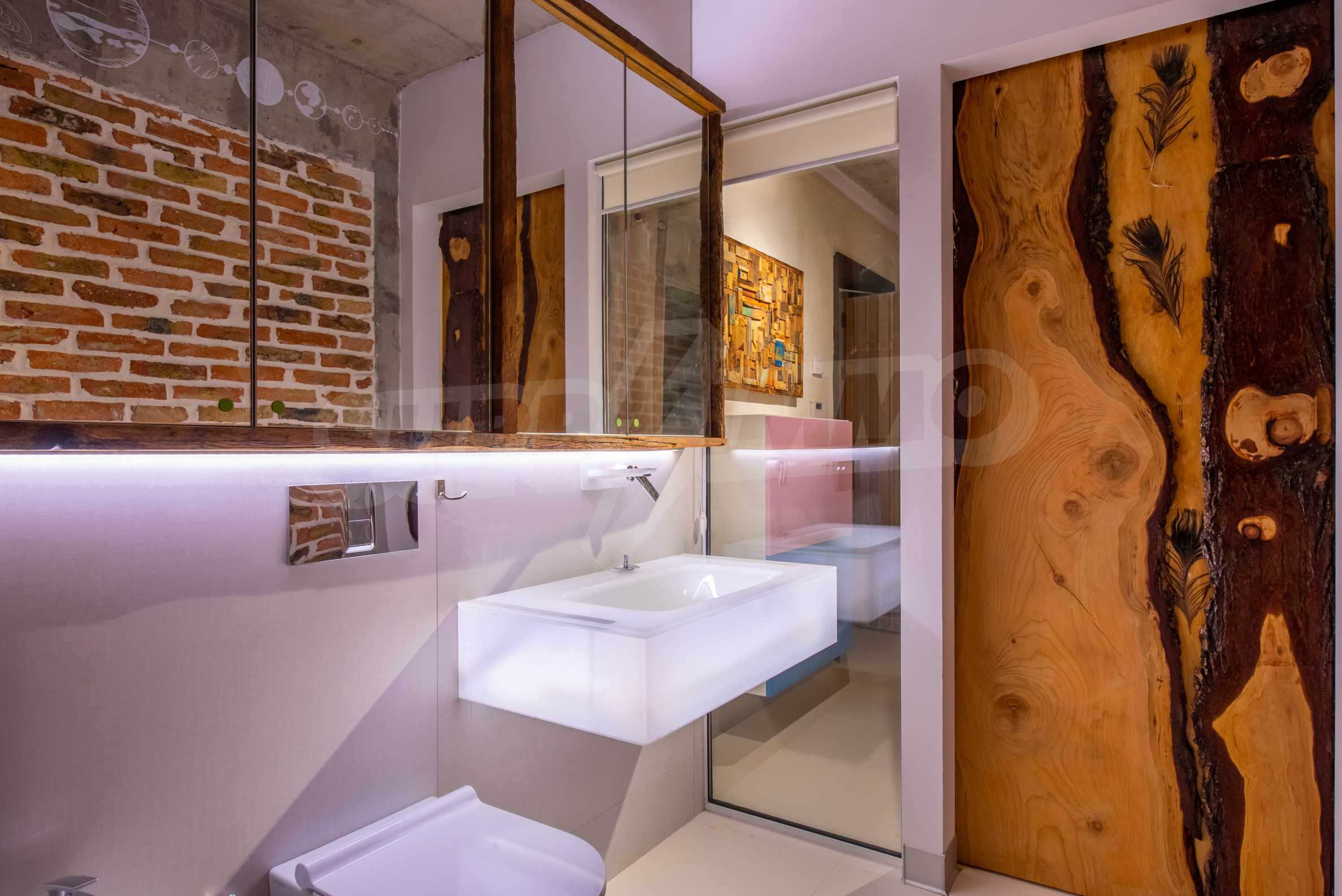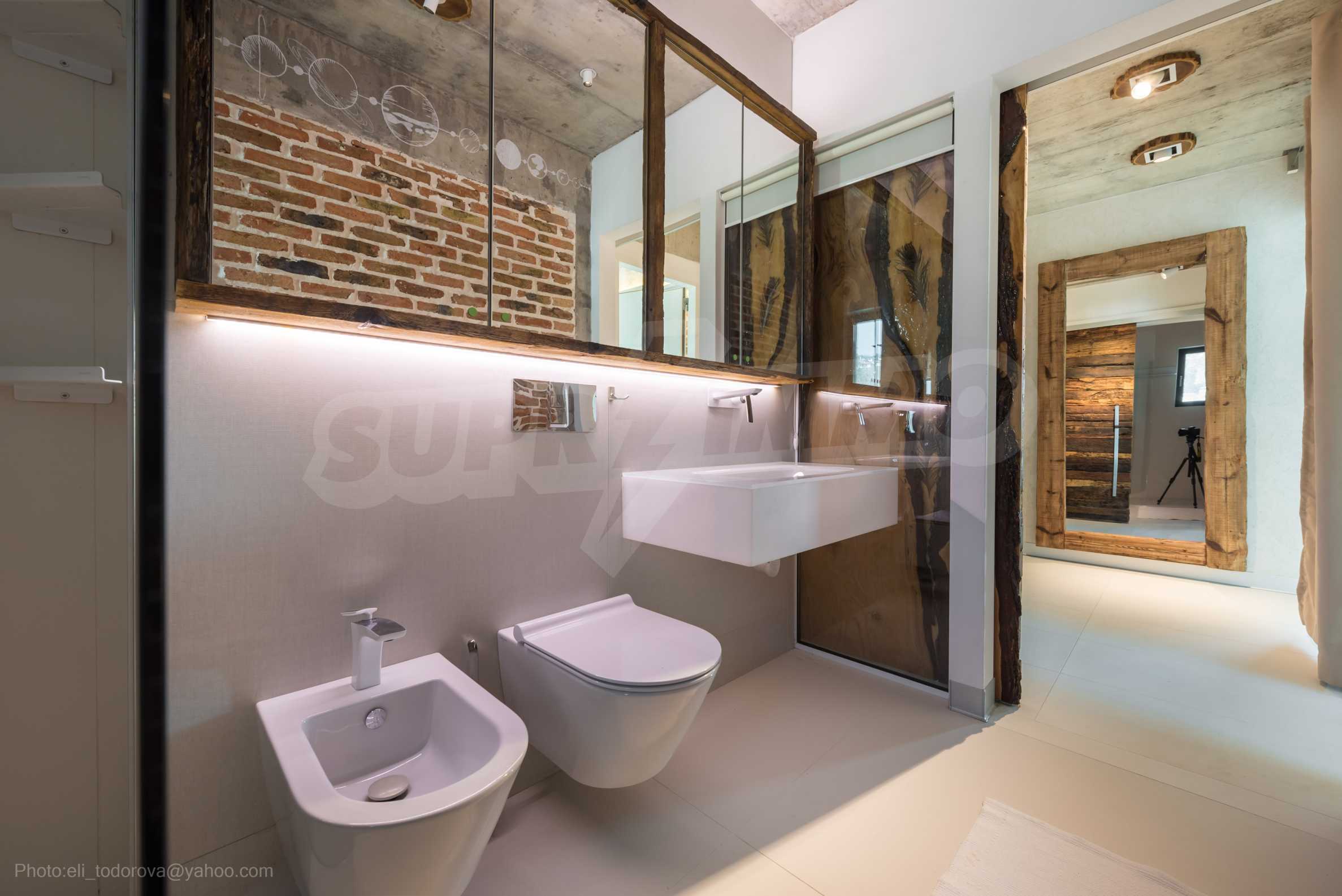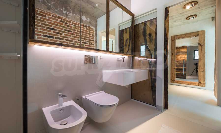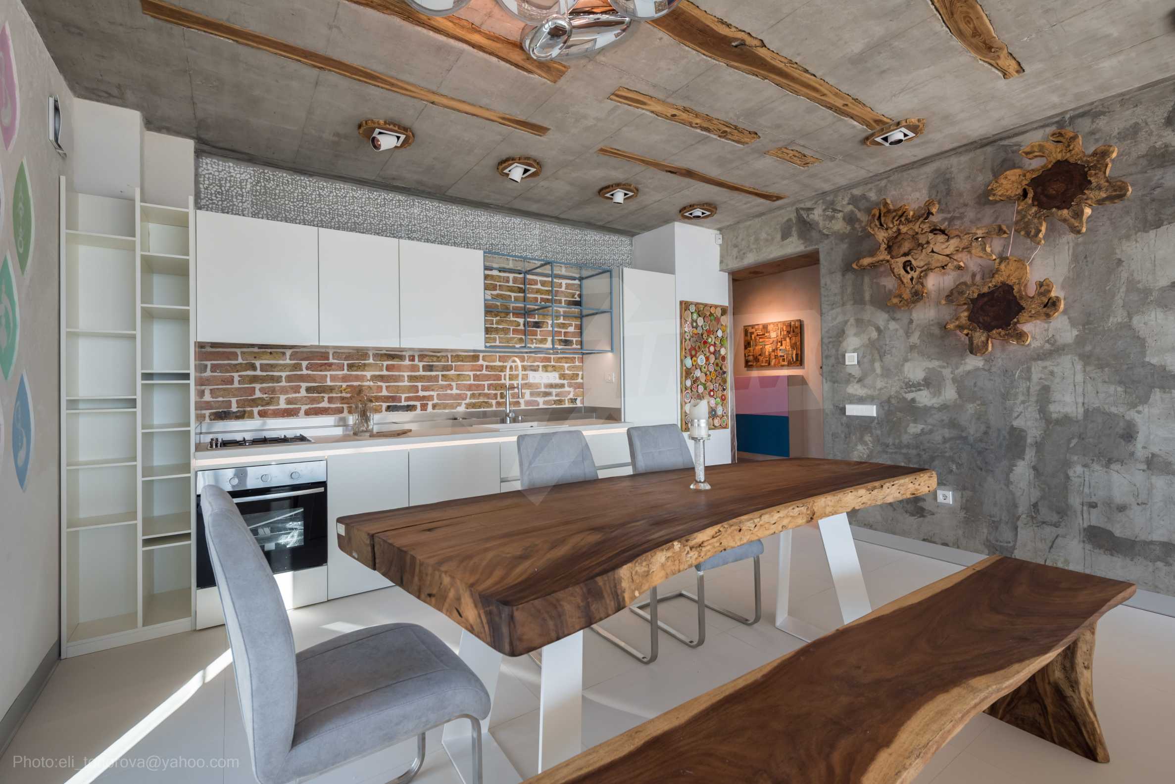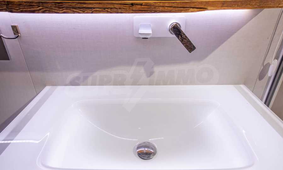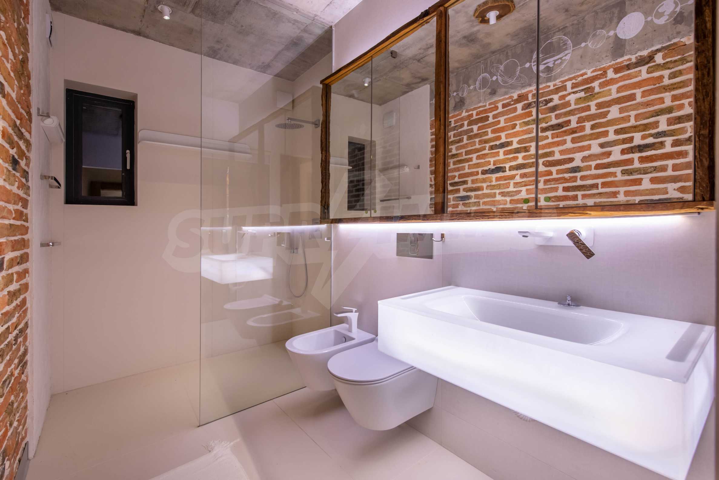 The design is unique - natural and modern, challenging and bright, carrying the message of autonomy, relaxation and sea atmosphere. Natural concrete acacia ornaments are built into the concrete slabs on the ceiling of the apartment. Brick walls and concrete are used for natural decoration, as they are additionally treated, impregnated and primed. Luxuriously furnished, with furniture, kitchen, mattresses and sofas, attractive tiles, lighting fixtures - all of famous Italian brands.