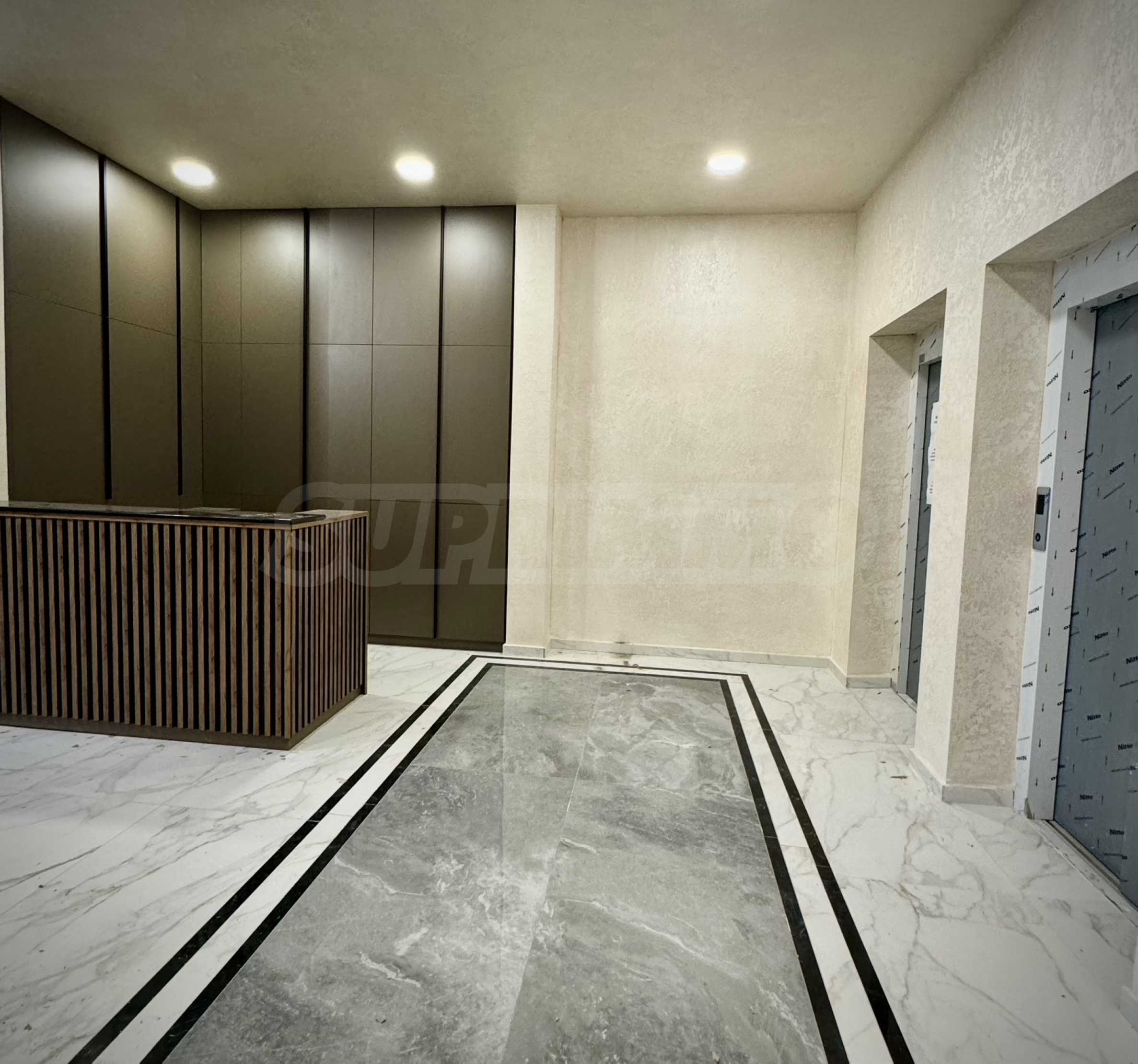 - luxuriously furnished lobby with a reception desk;