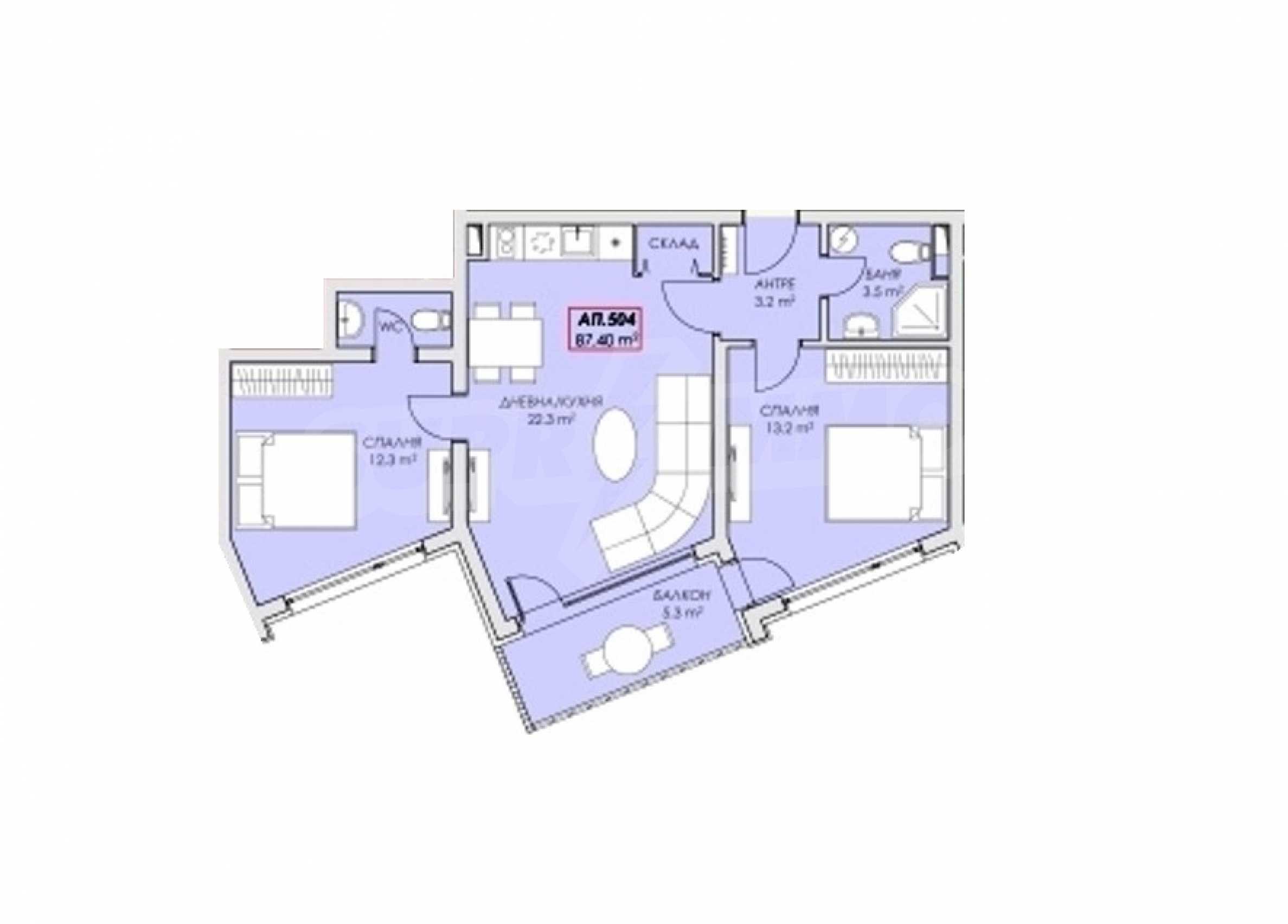 The property is located on 5 floors and offers 87.40 m2 of total area with functionally distributed rooms: living room, bedroom with private toilet, second bedroom, bathroom with toilet, balcony. It is offered turnkey.