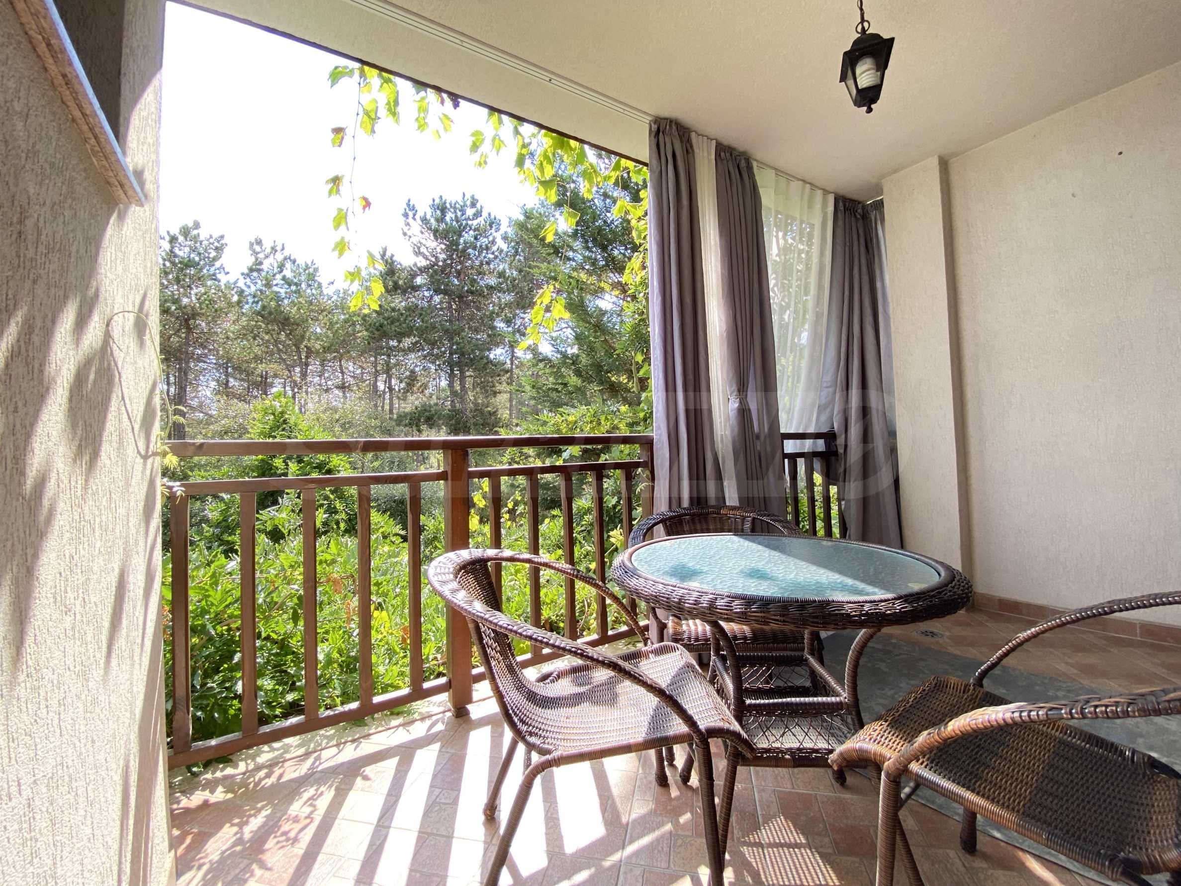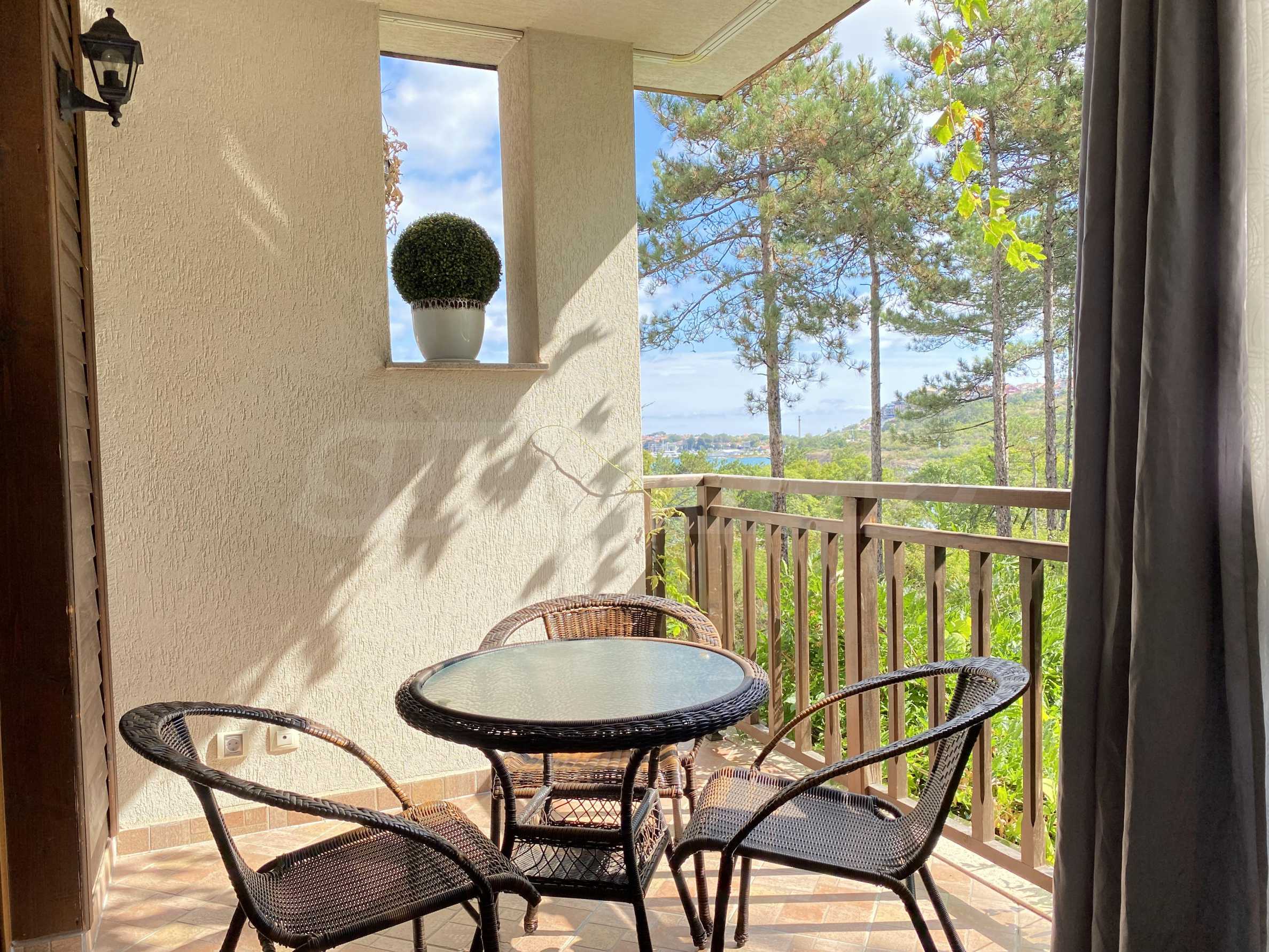 - The most pleasant part of the apartment is the romantic terrace with a hammock and a view of the bay and the park. It is furnished with rattan furniture and curtains.