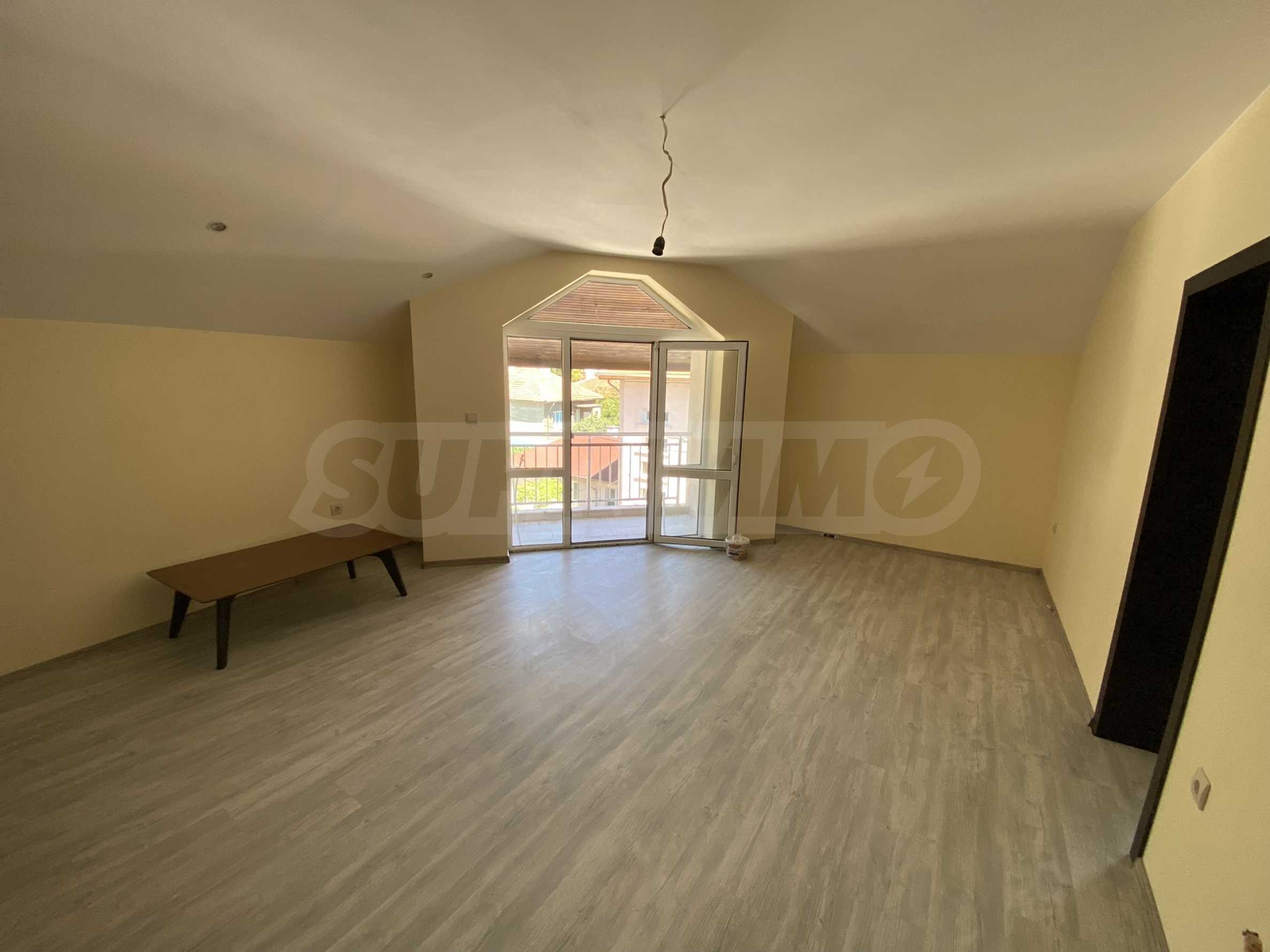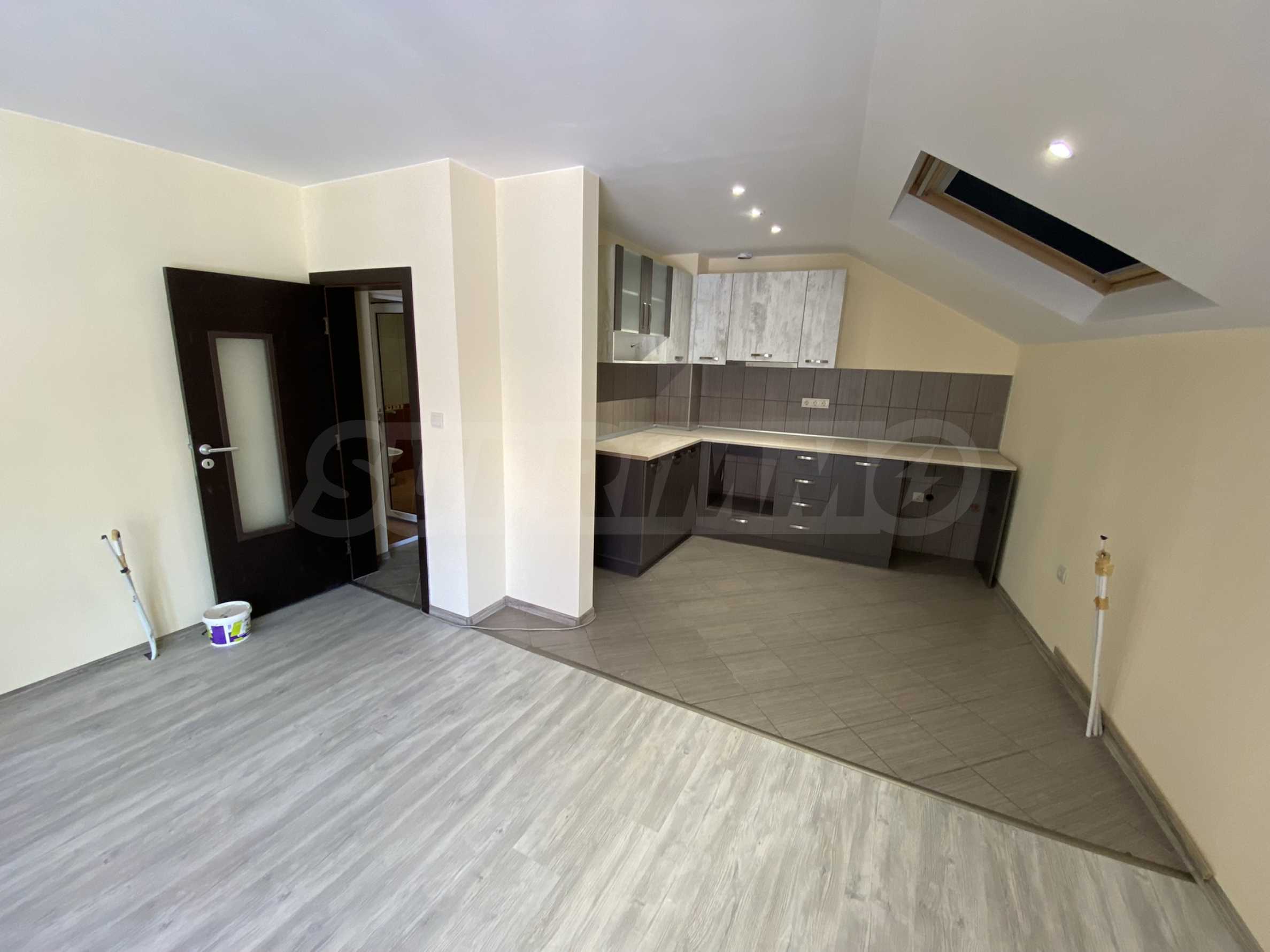 The apartment is finished with floorings, the walls are painted with latex, kitchen cabinets are installed and the bathroom and toilet are fully equipped.