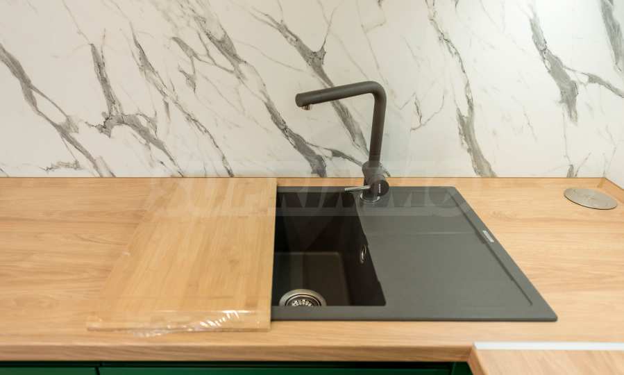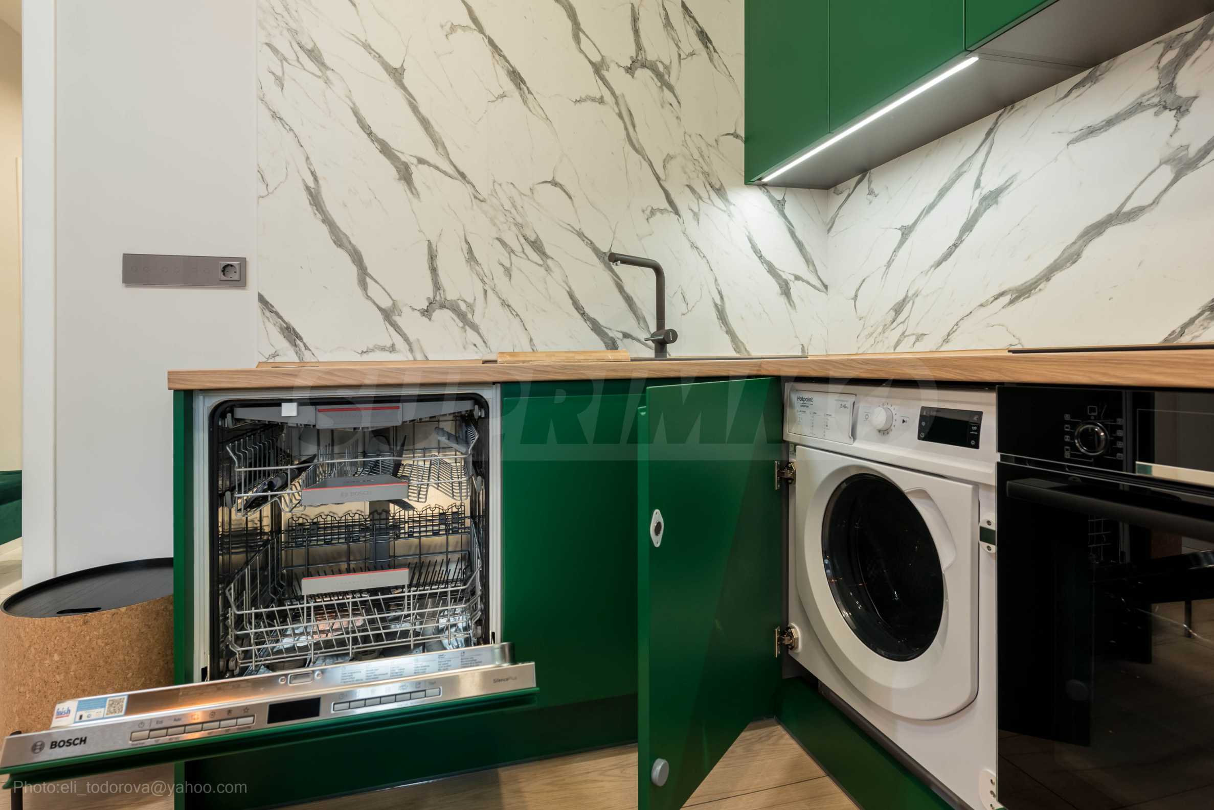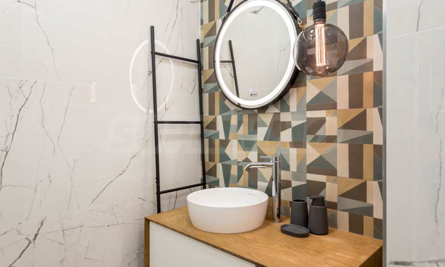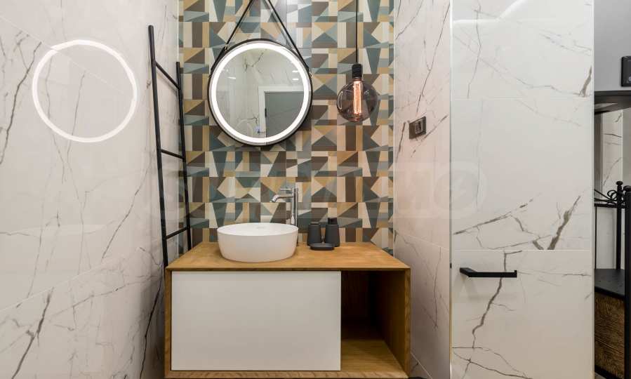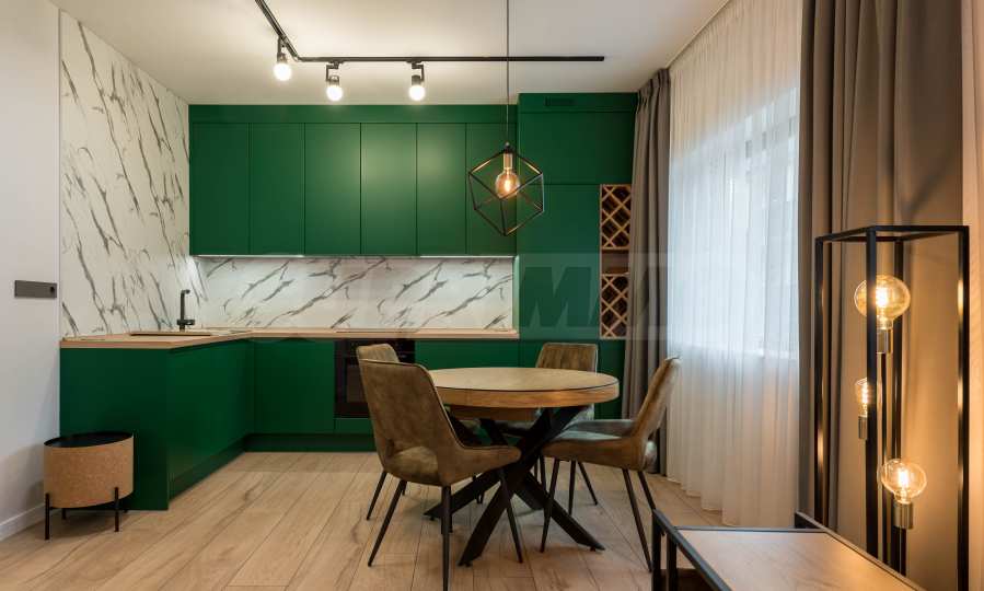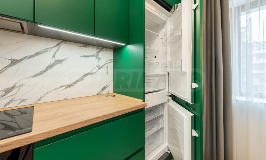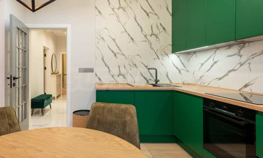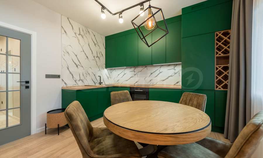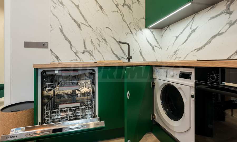 The kitchen is filled with high-quality materials and the electrical appliances are from reputable companies. It is equipped with a built-in washing machine, ceramic hob, extractor hood, dishwasher, oven and refrigerator.