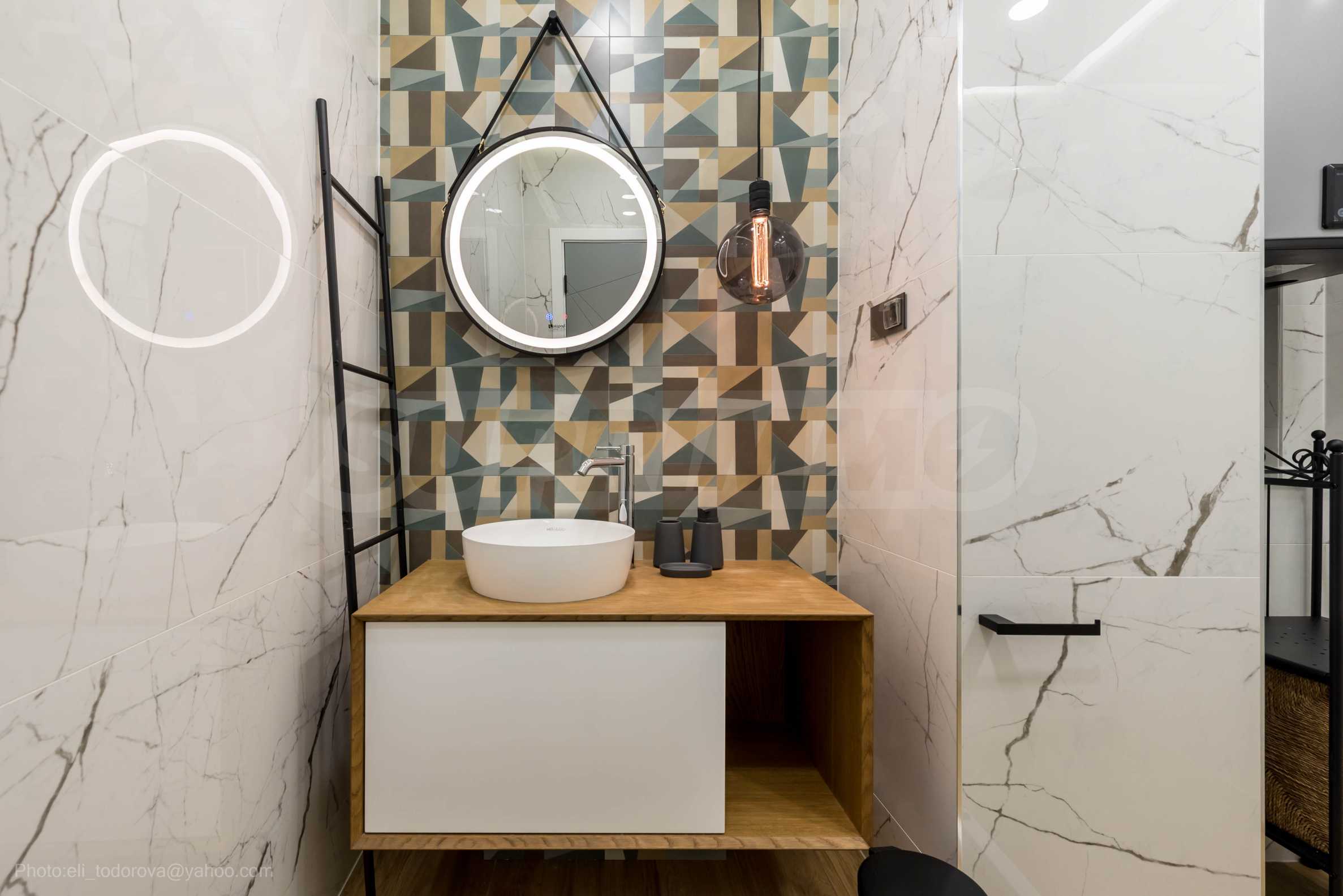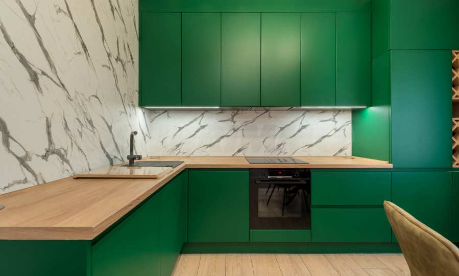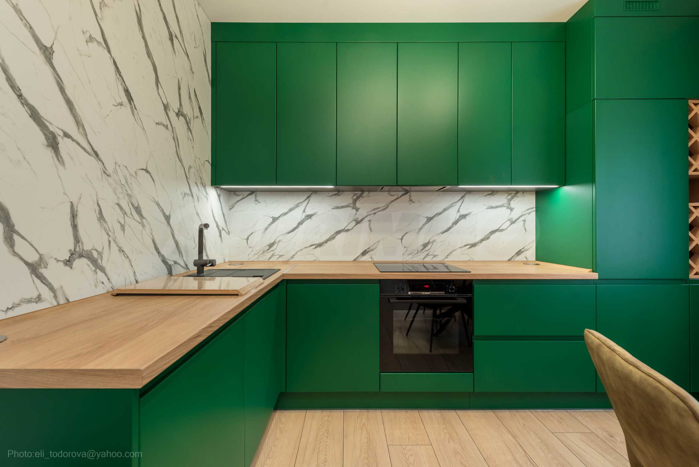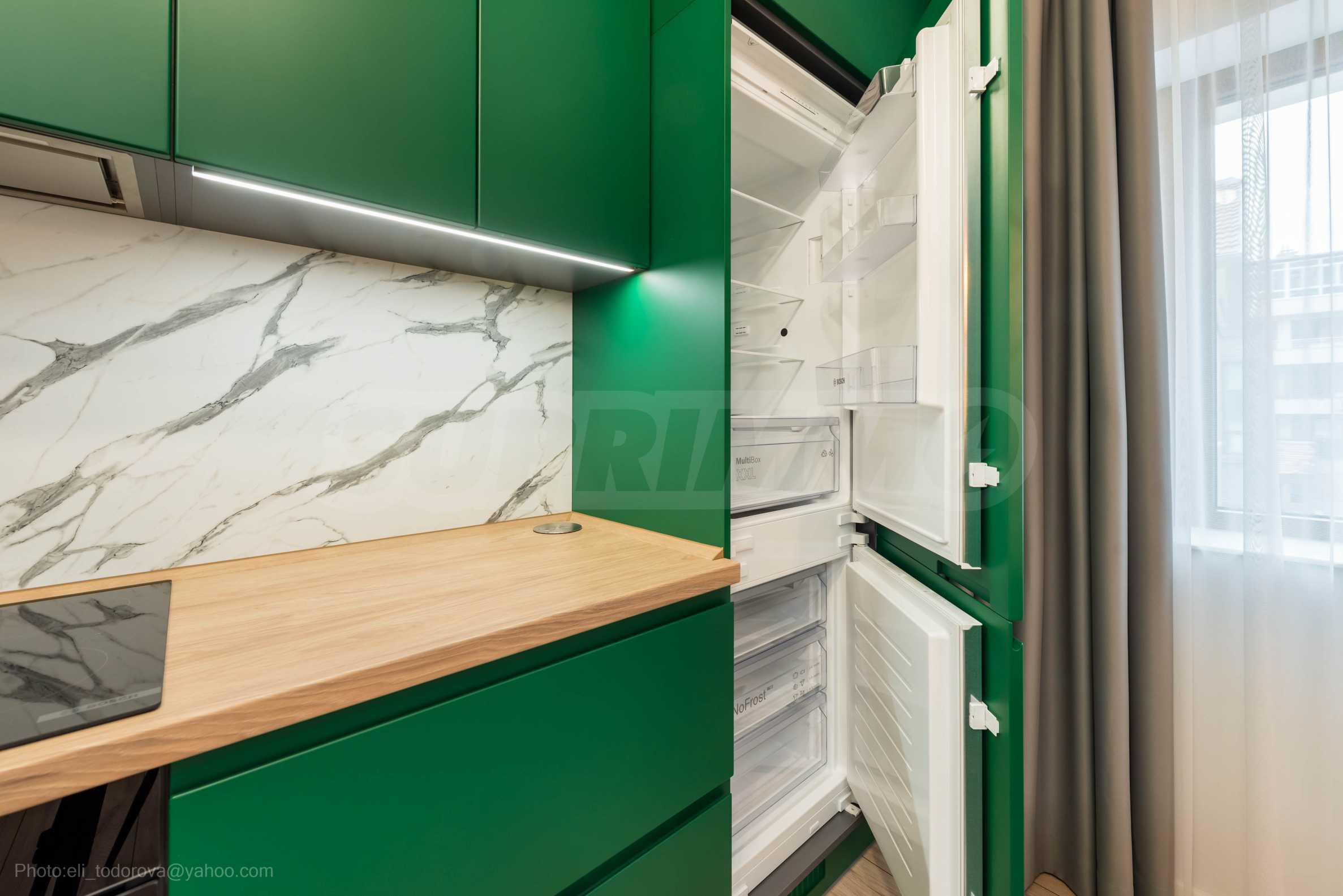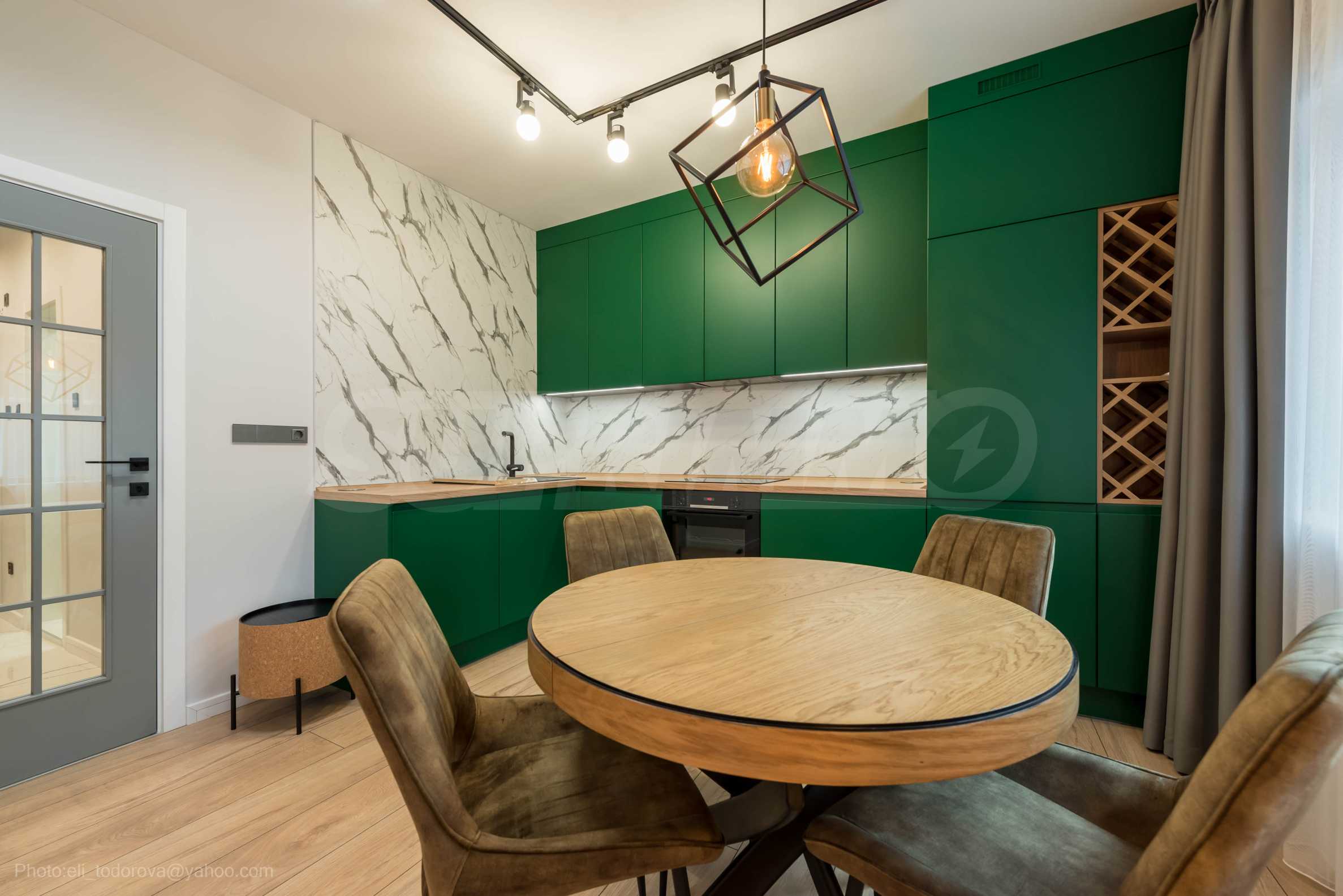The kitchen is filled with high-quality materials and the electrical appliances are from reputable companies. It is equipped with a built-in washing machine, ceramic hob, extractor hood, dishwasher, oven and refrigerator.
