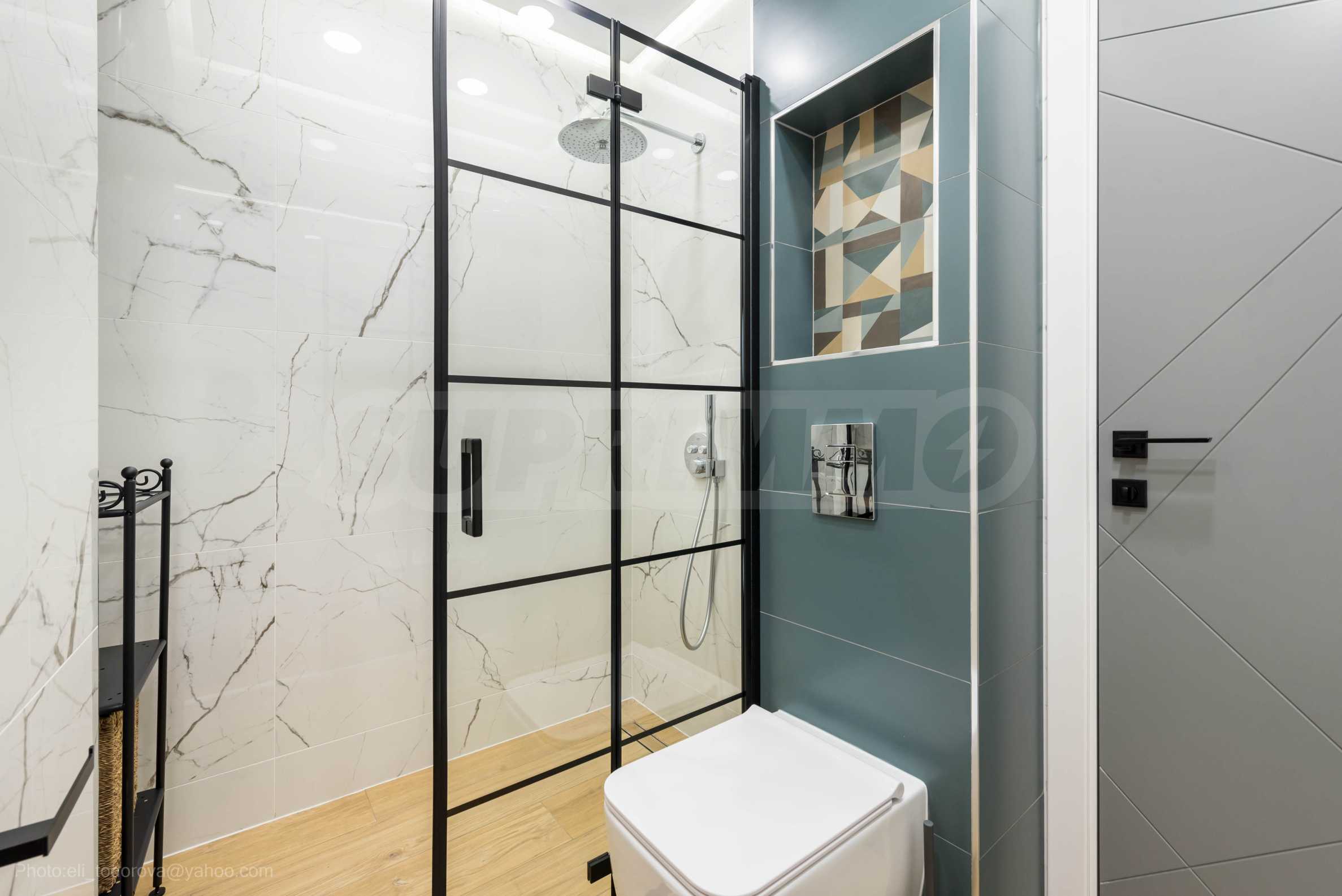 The bathroom is filled with quality finishing works and has a shower cabin and a toilet.