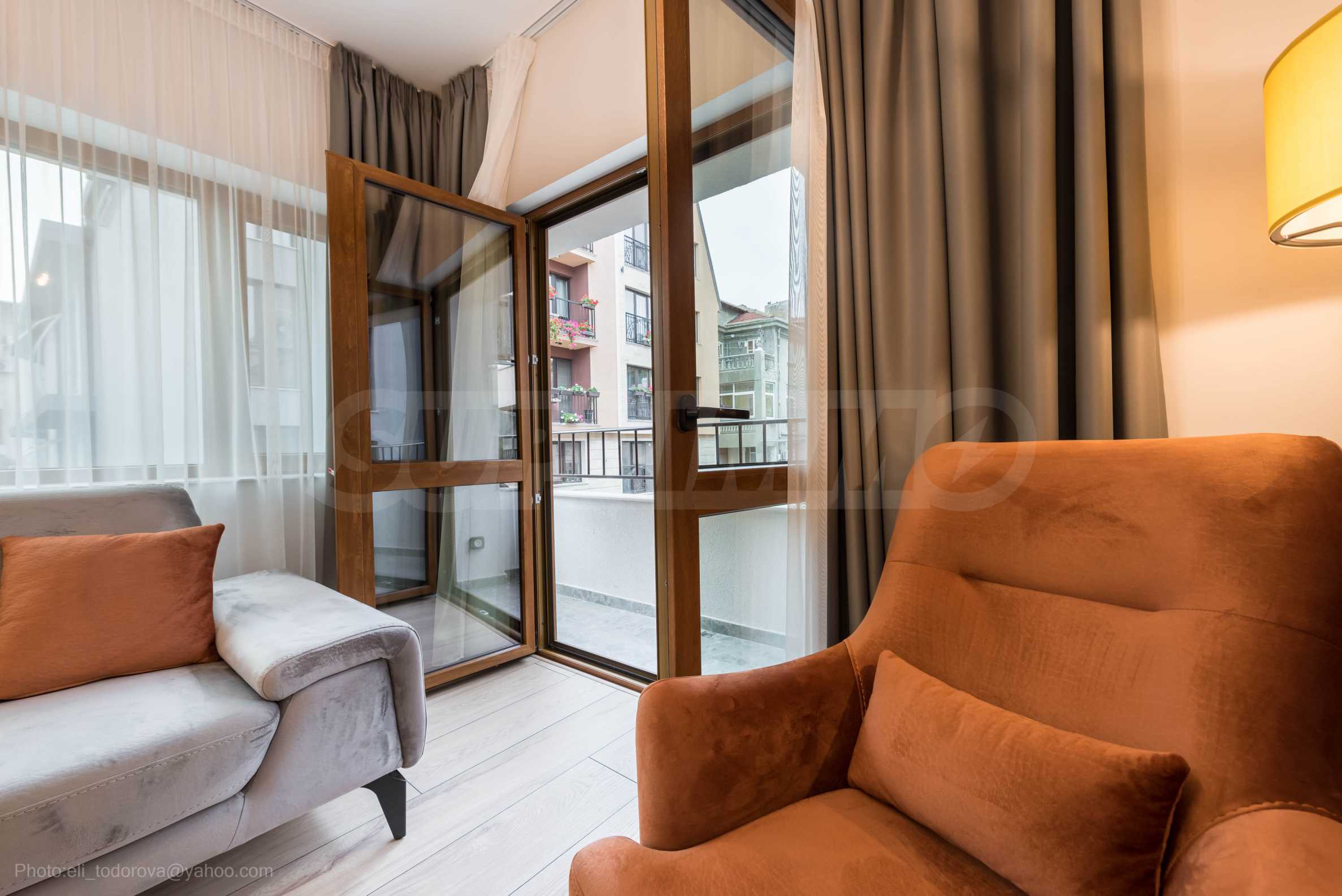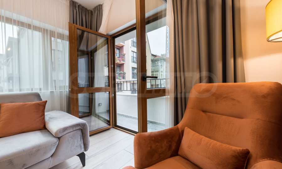 The apartment has narrow terraces to the living room and one bedroom.