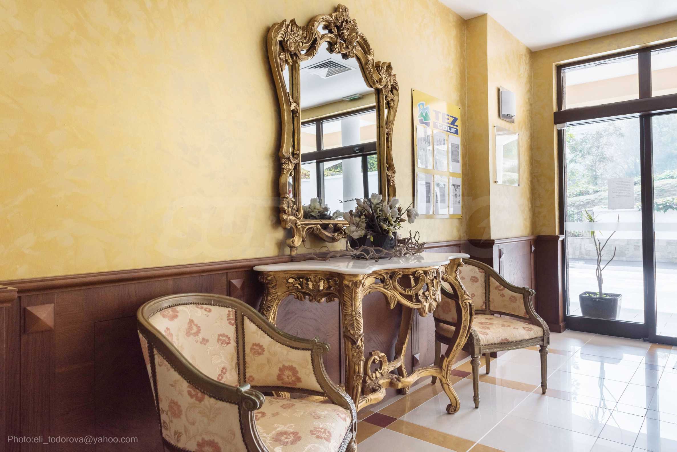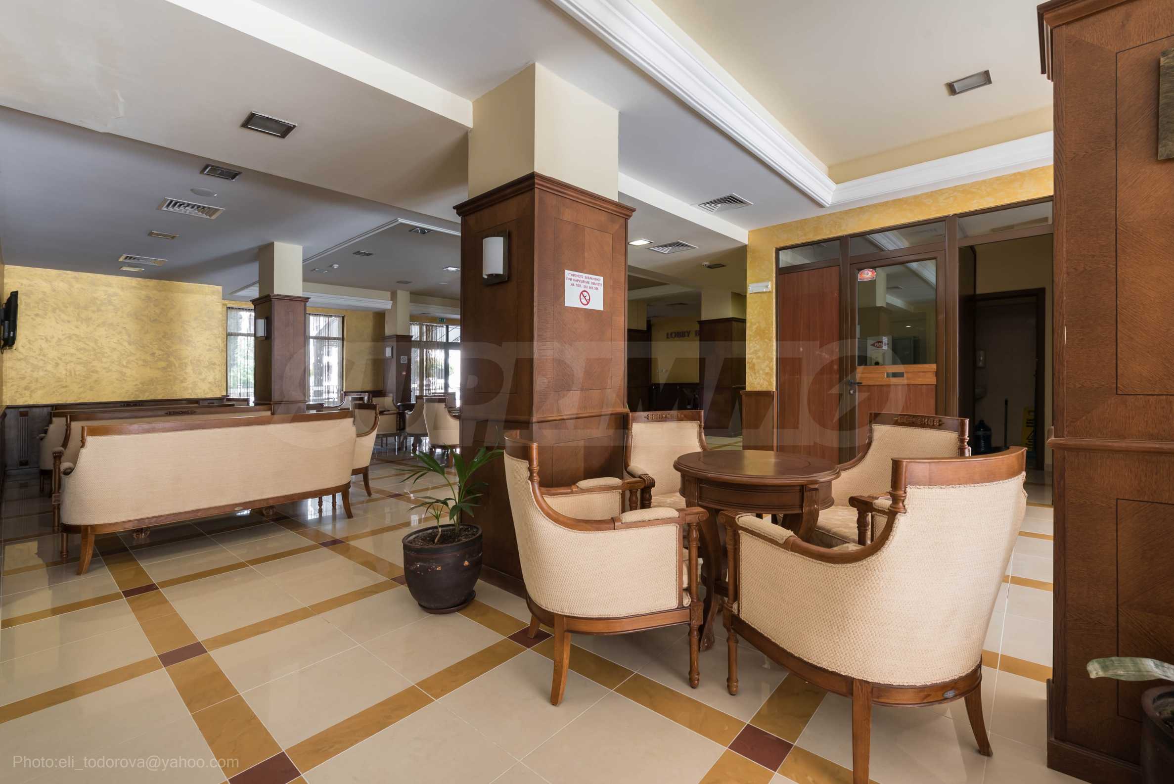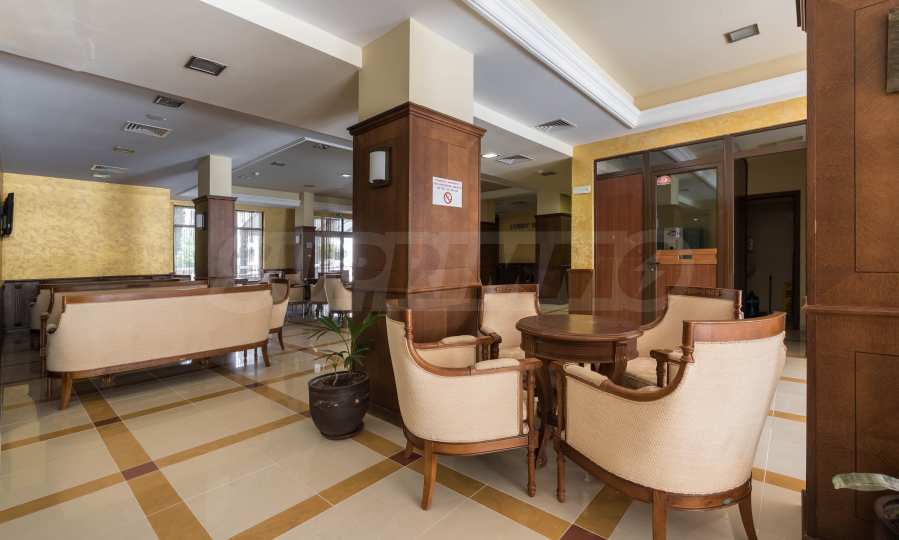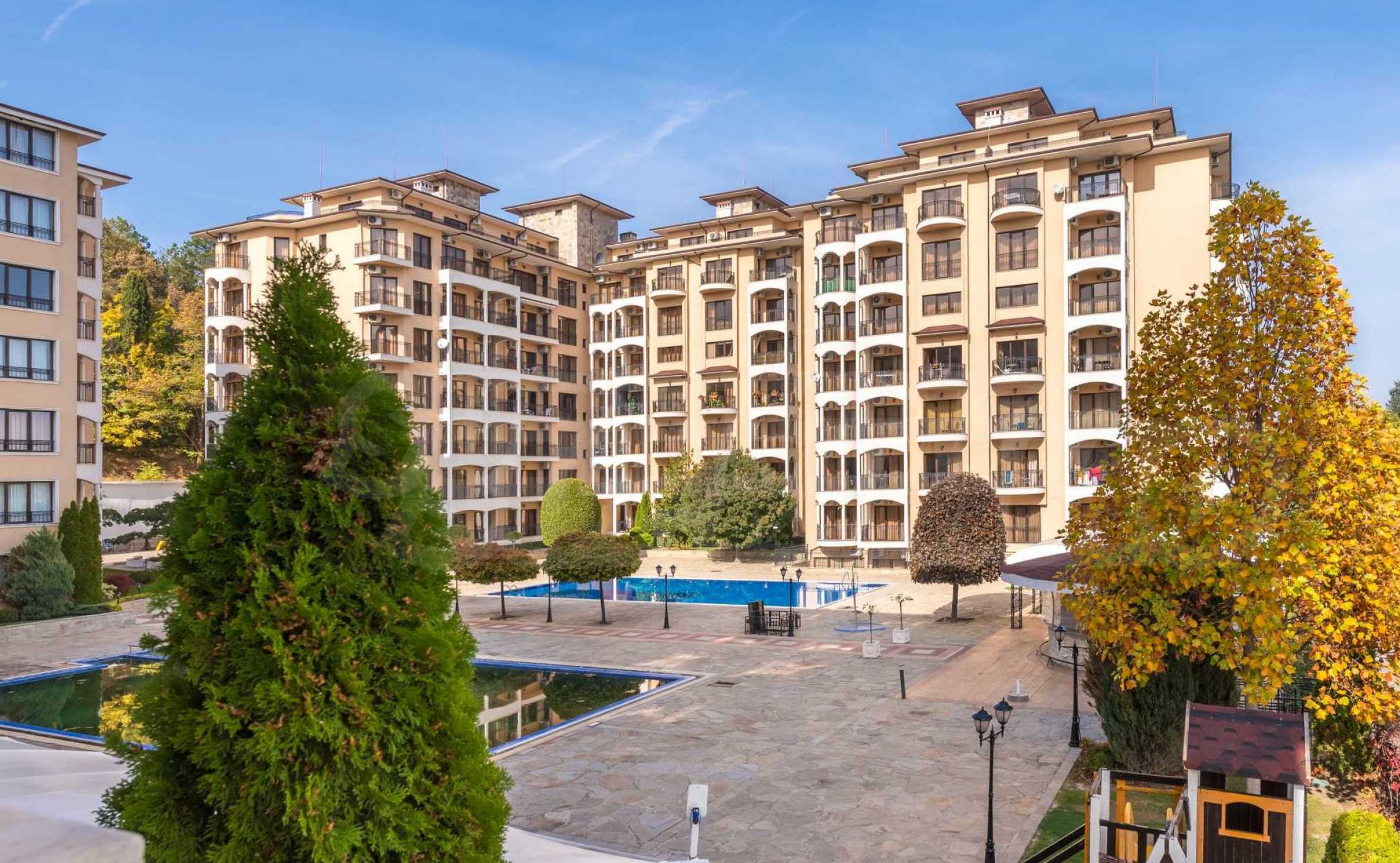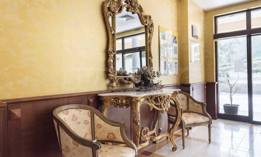 The Golden Sands Resort is located in the Golden Sands National Park, which means there is a lot of greenery. The resort has extensive park areas where construction is prohibited and is also surrounded by a forest fund. The beach is known all over the world for its wide sandy strip and clear sea water. Close by there are restaurants, cafes, grocery stores, banks, children's and sports playgrounds, water and children's attractions, a gas station and public transport stops.