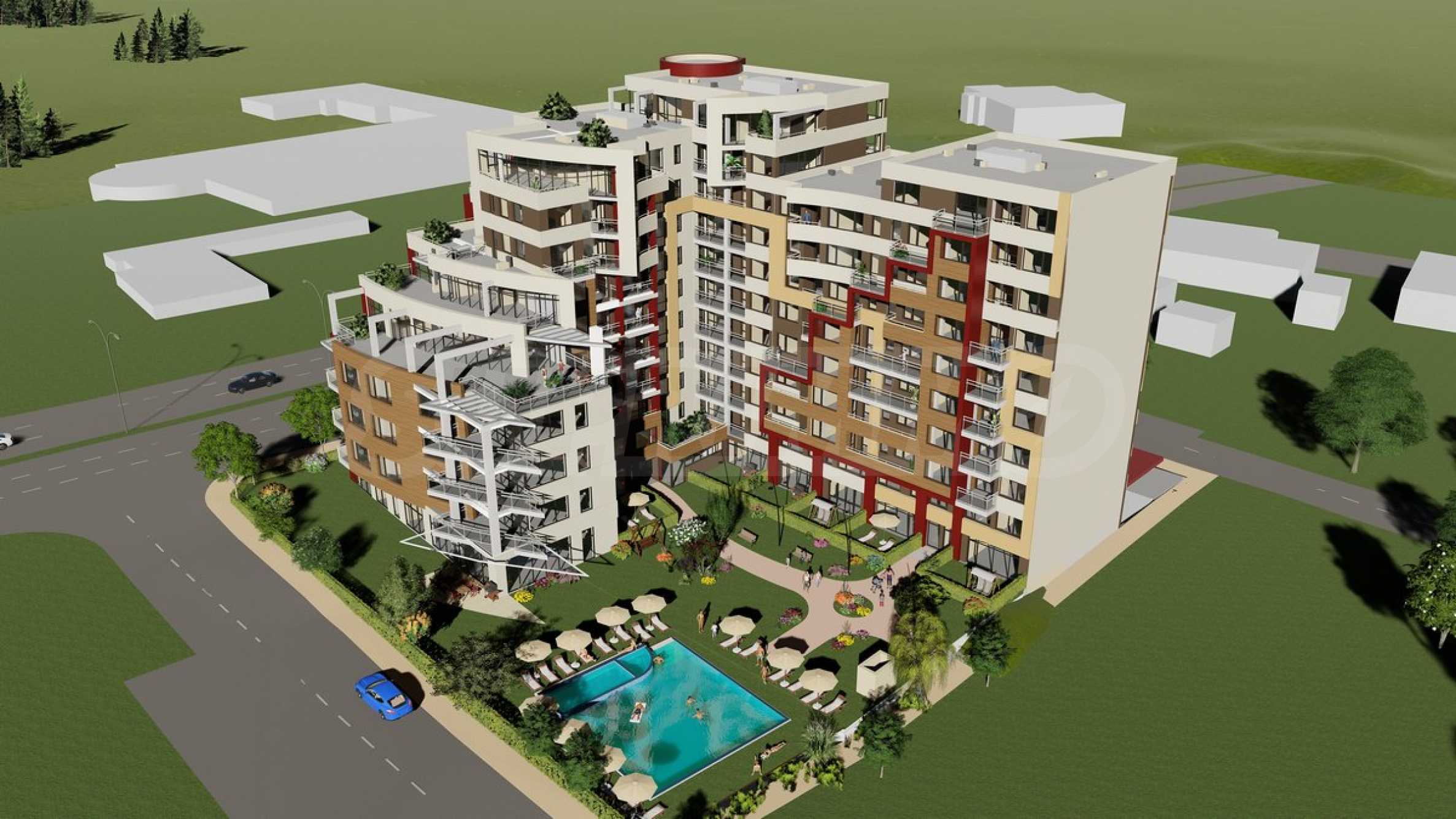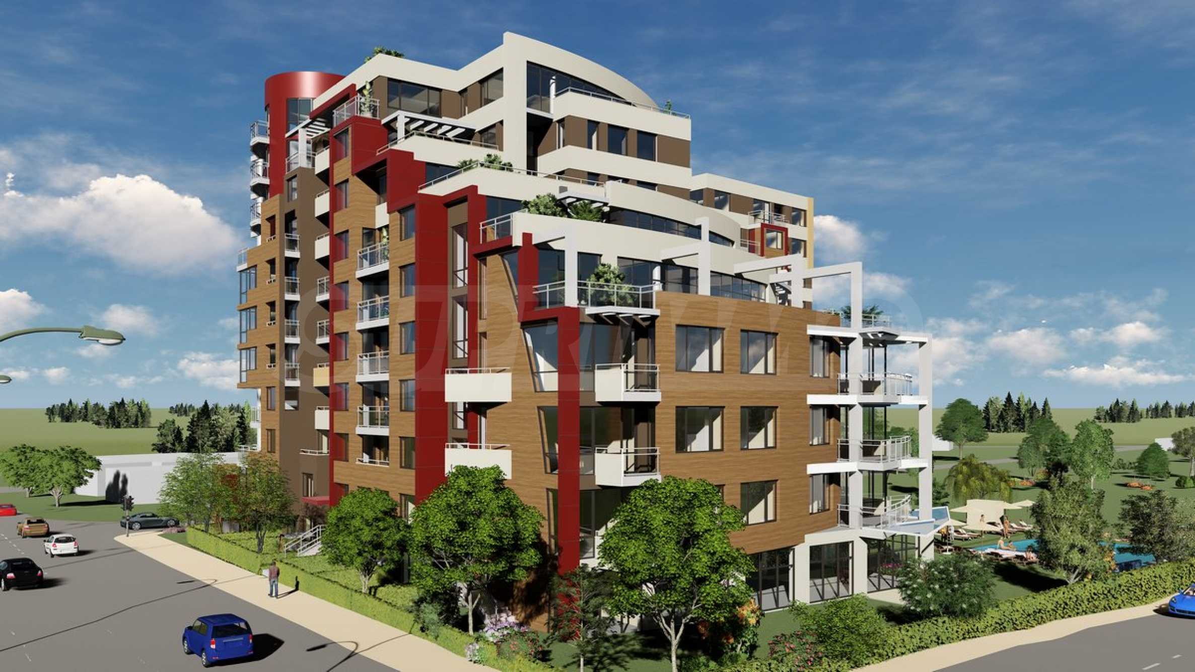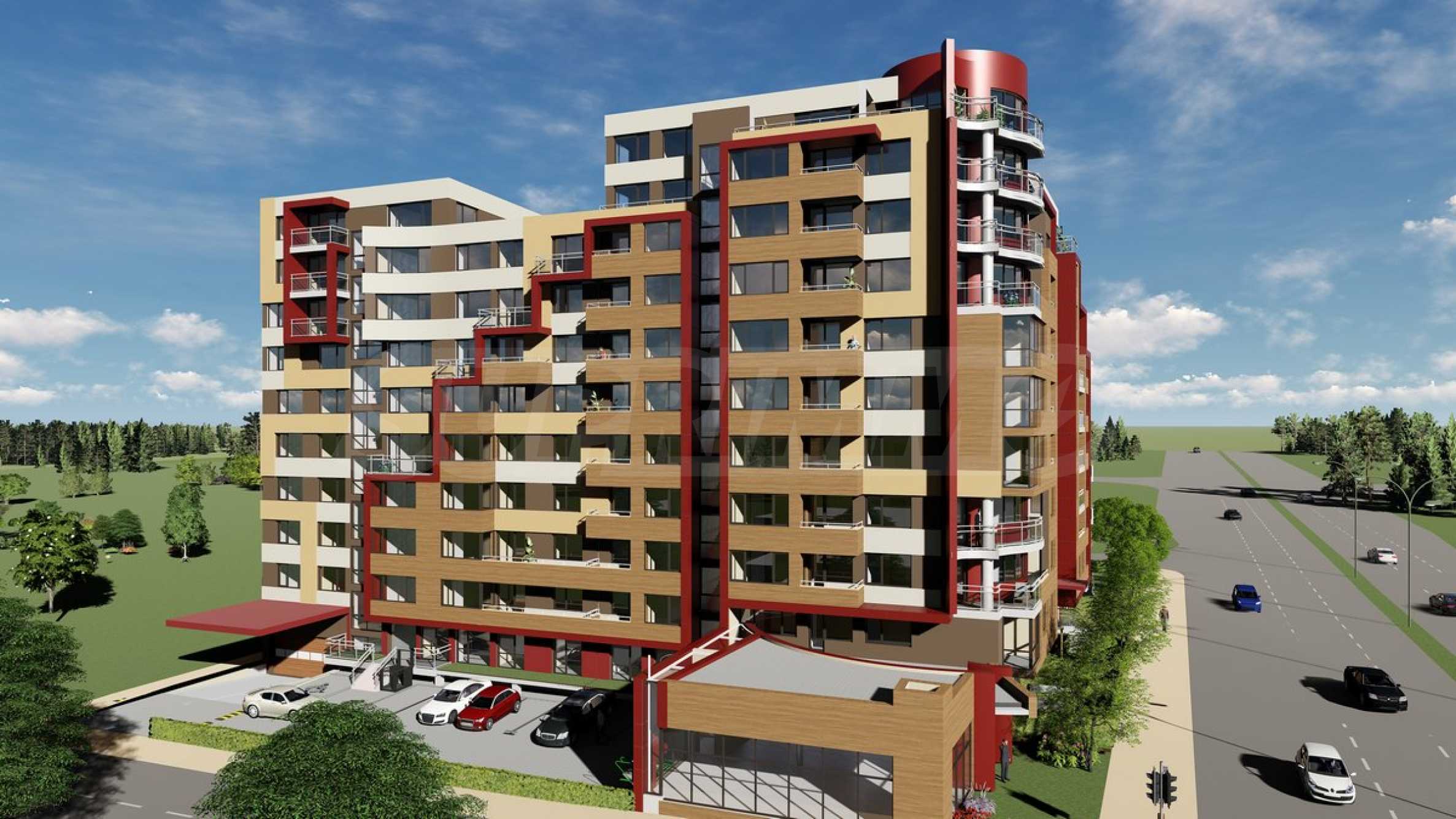 The building is located on a plot of 3788 square meters, and according to the project, over 40% of the plot area is for landscaping. The structure is a terraced L-shaped structure that rises from four stories to ten. Stage-1 is designed by four entrances with a total of 129 nos. residences and studios, with provided amenities: reception, beautiful private park with paths, swimming pool, gym and sauna, dentist's office, office and shop.
