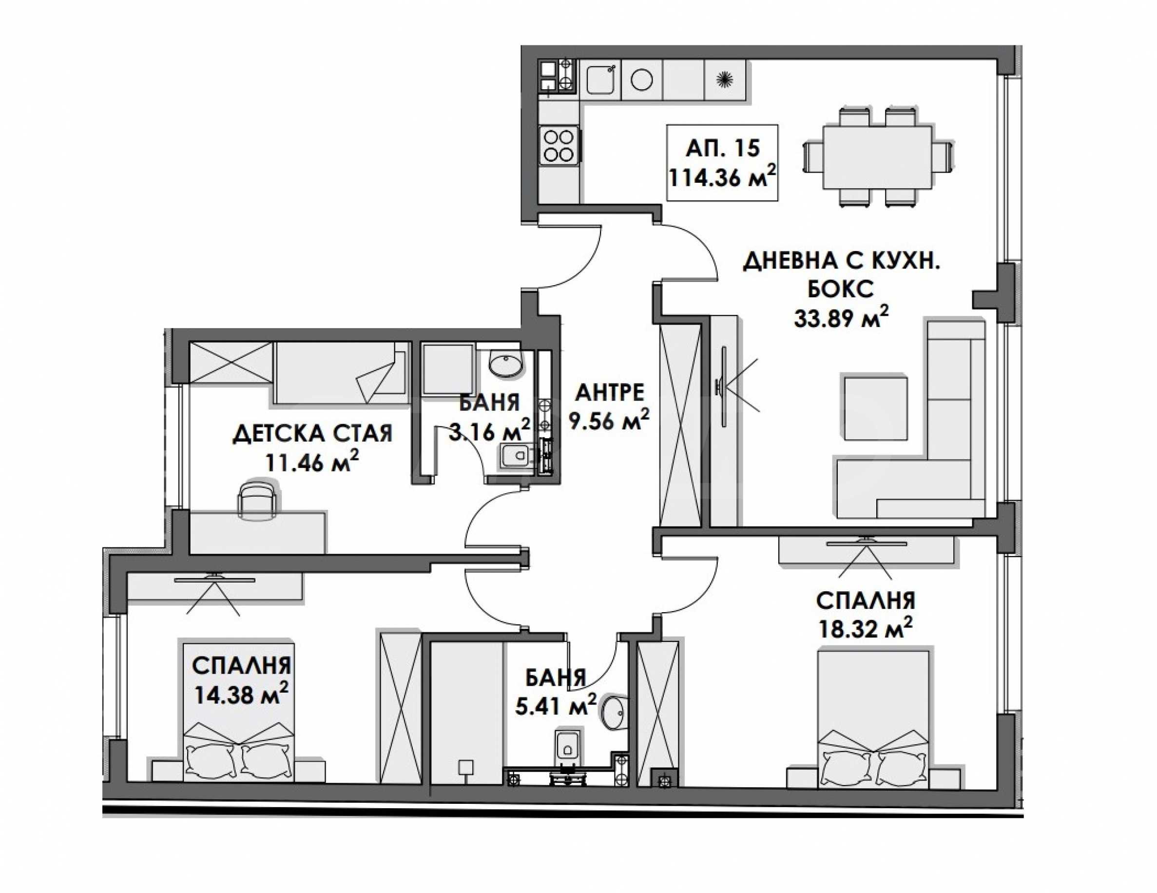 We present a four-room apartment in a newly built residential complex with a modern look and a landscaped yard in the city of Grdova Glava. The area provides a peaceful residential atmosphere, beautiful natural views and an ecological environment due to its proximity to the mountain, making it a preferred place to live. The location is close to public transport stops and with quick and easy access to Tsar Boris III Blvd. and the Ring Road.