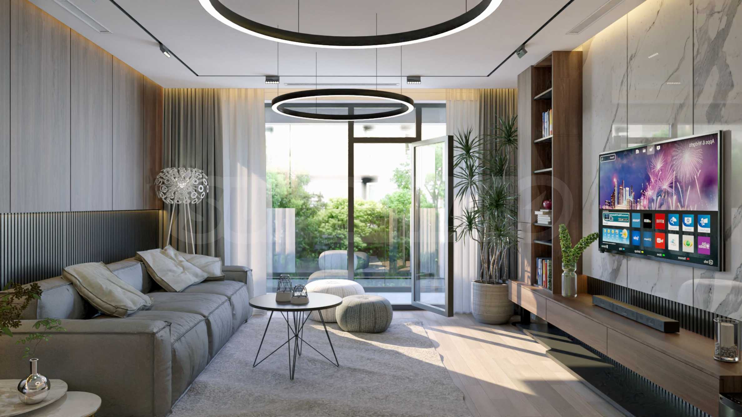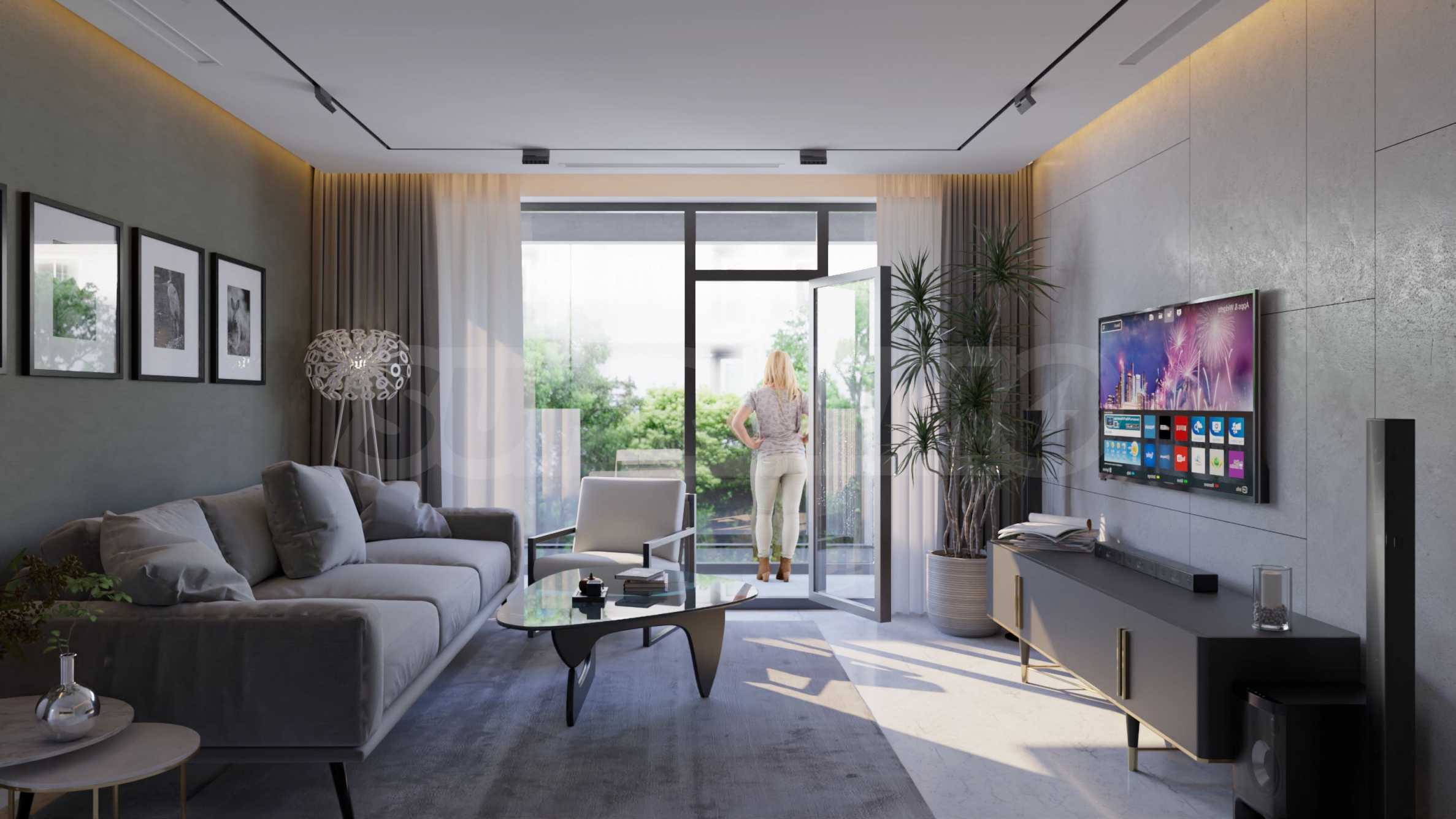 • The apartments, completed "turnkey" are issued with high-class materials - flooring made of granite tiles or laminated parquet, finely plastered and painted latex walls and ceilings, installed keys and sockets, installed interior doors, fully finished bathrooms and toilets with faience and all accessories including shower cabins, toilet bowls with built-in structure, sinks, etc. Lighting fixtures and furniture are not included.