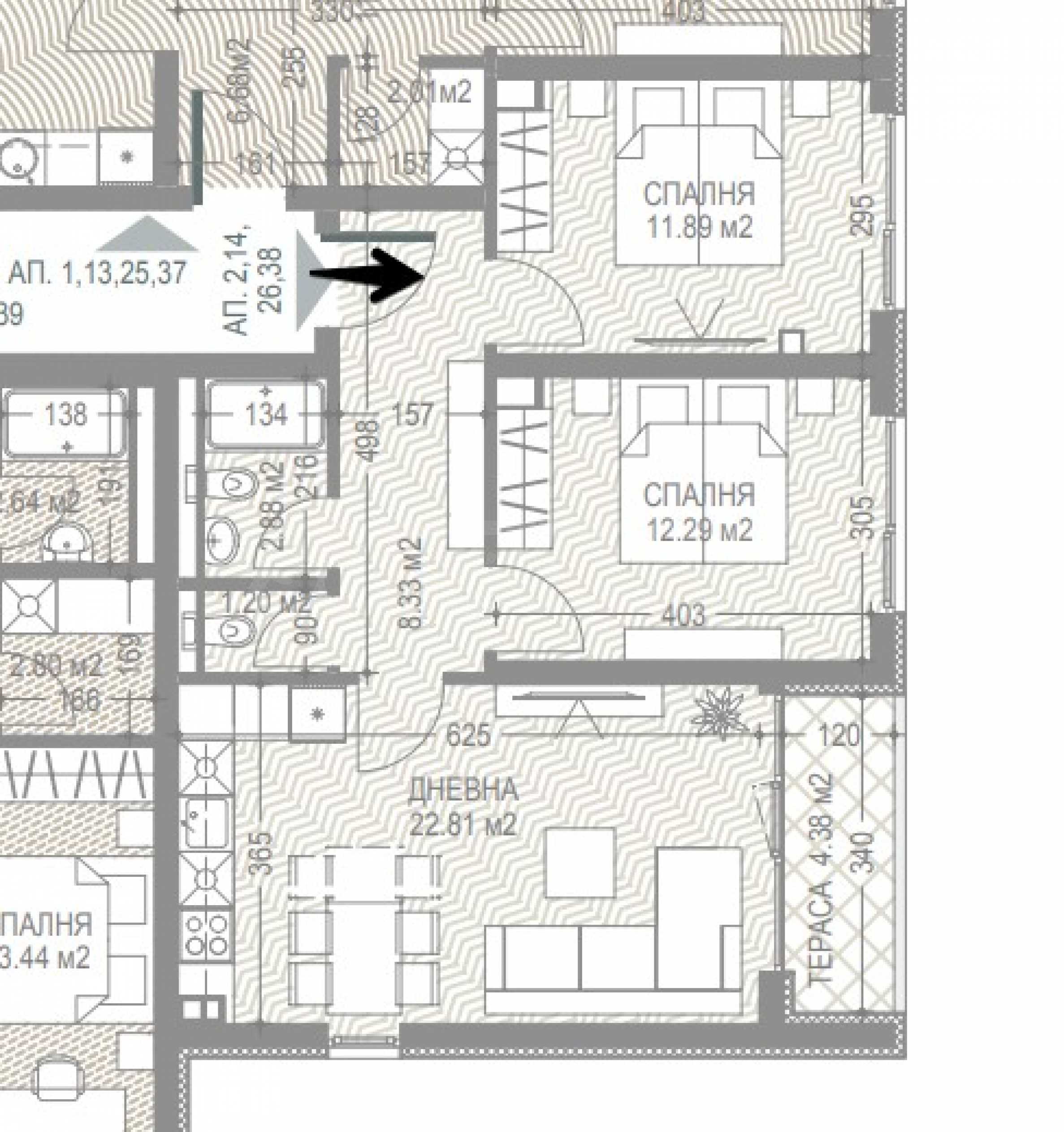 Apartment #26 is located on the 3rd floor and consists of two bedrooms, a living room, a terrace, a bathroom/toilet, a toilet and an entrance hall.