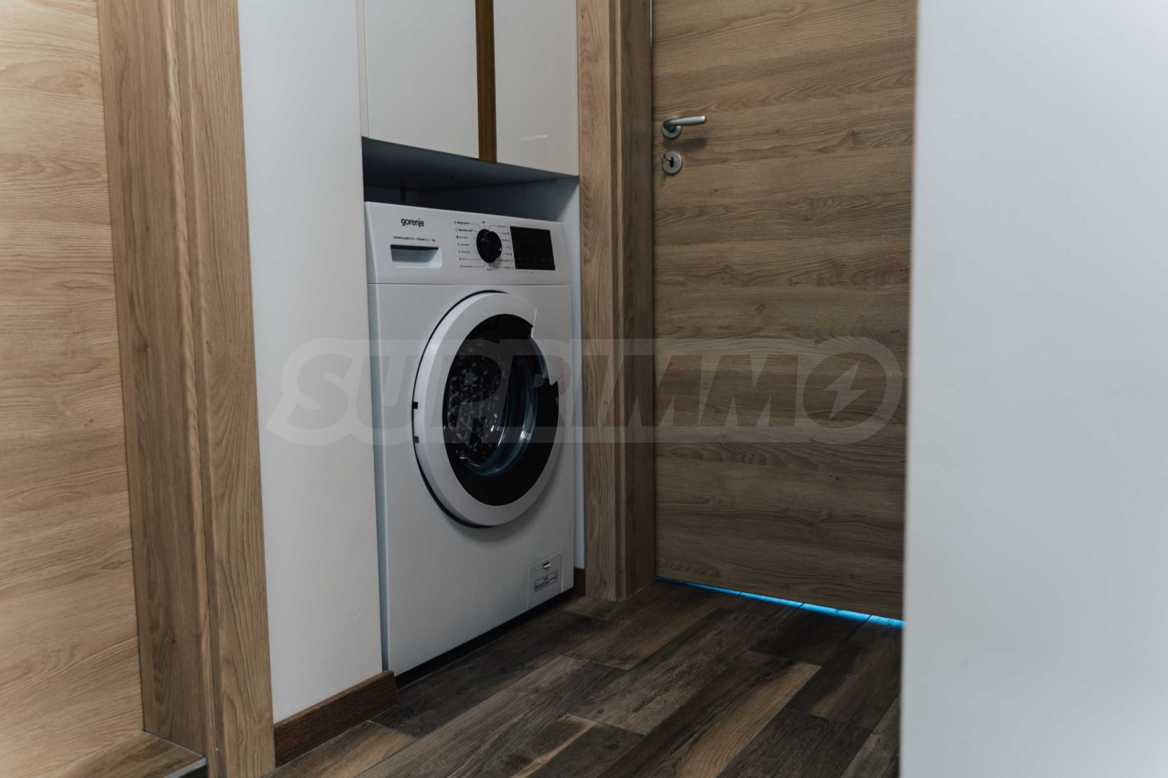 Each room is air-conditioned and has a TV. The living room has a comfortable seating area and a dining area. The kitchen is well-equipped with a dishwasher, stove and refrigerator. There is a washing machine and a safe.