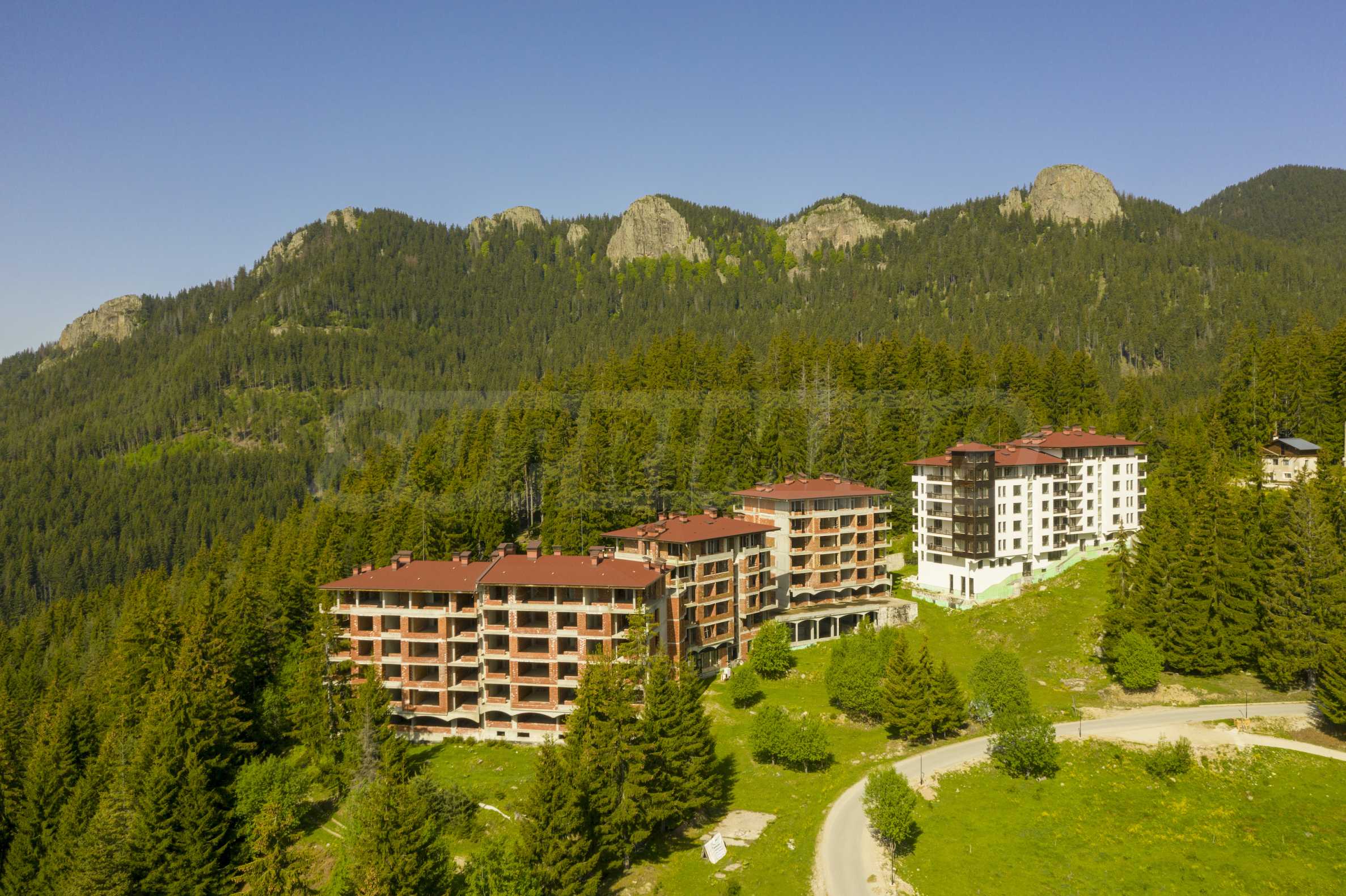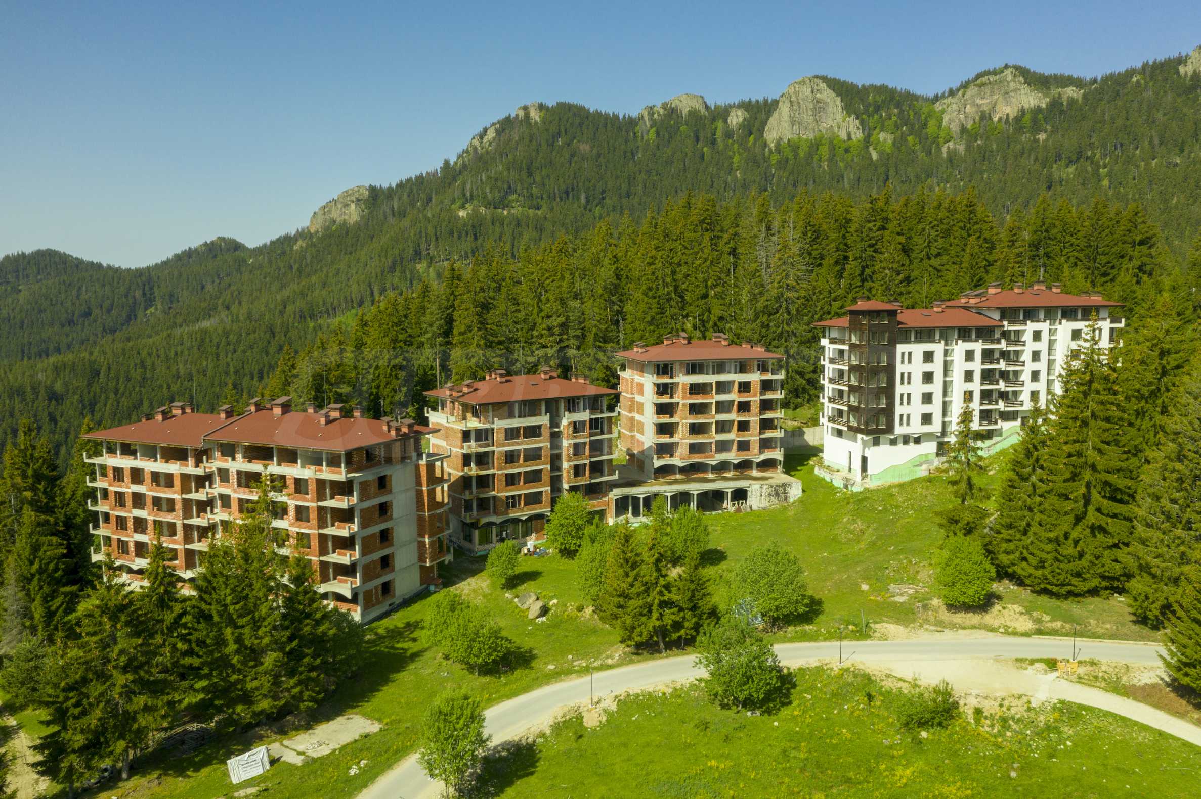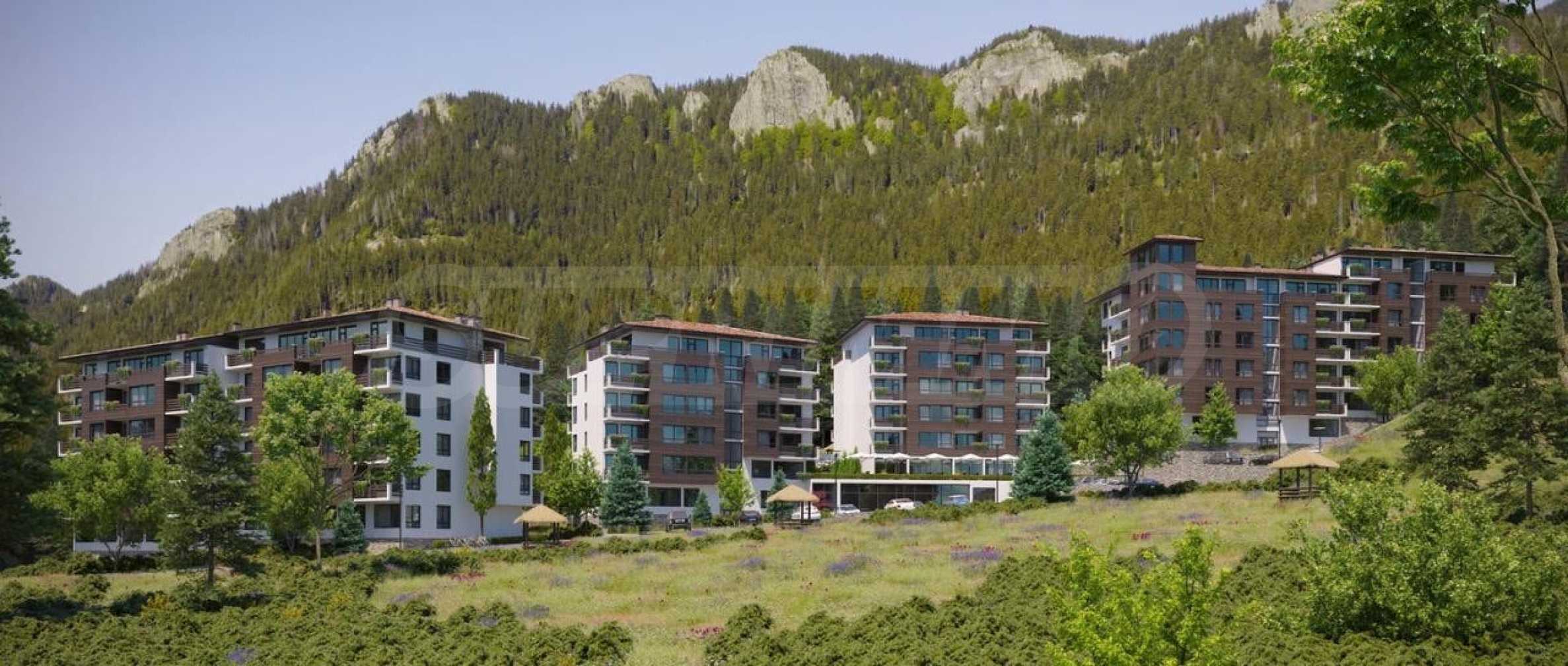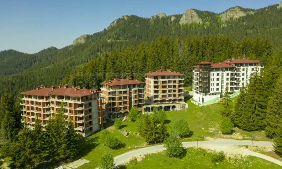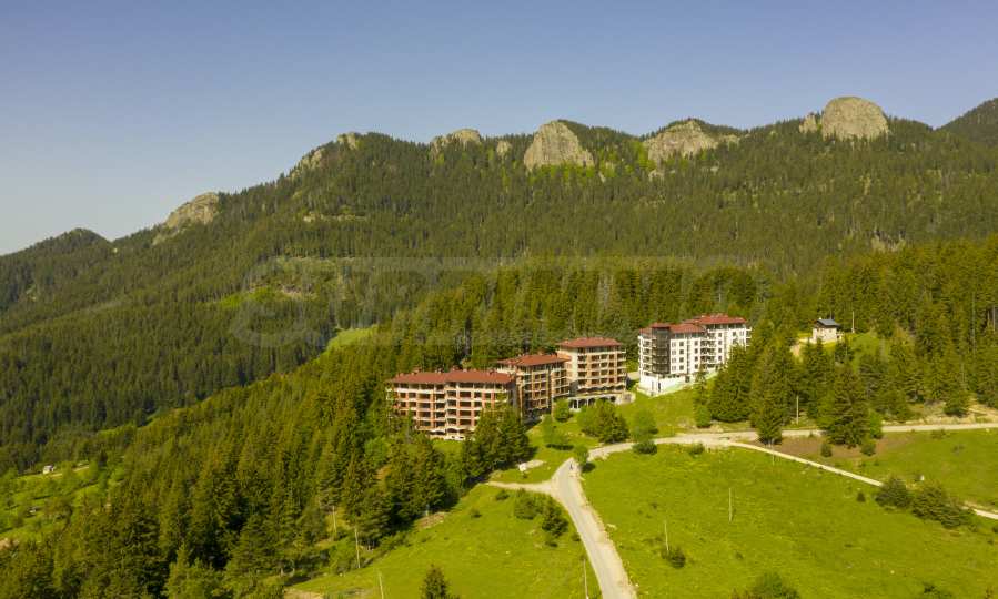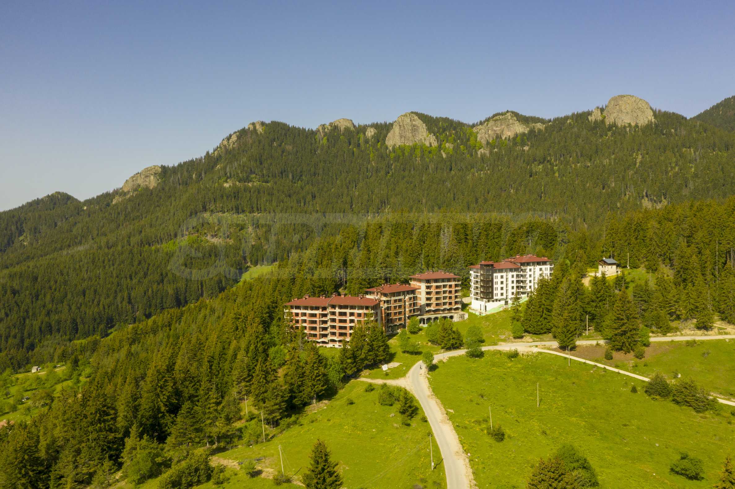 The complex consists of three sections - two buildings with apartments, each with two entrances, and another building - a hotel with a swimming pool and spa, with service and service rooms. The buildings are excellently located on a 10-acre plot. Close to villa villages and dozens of independent private villas, the complex fits magnificently into the unique nature of the Rhodopes.
