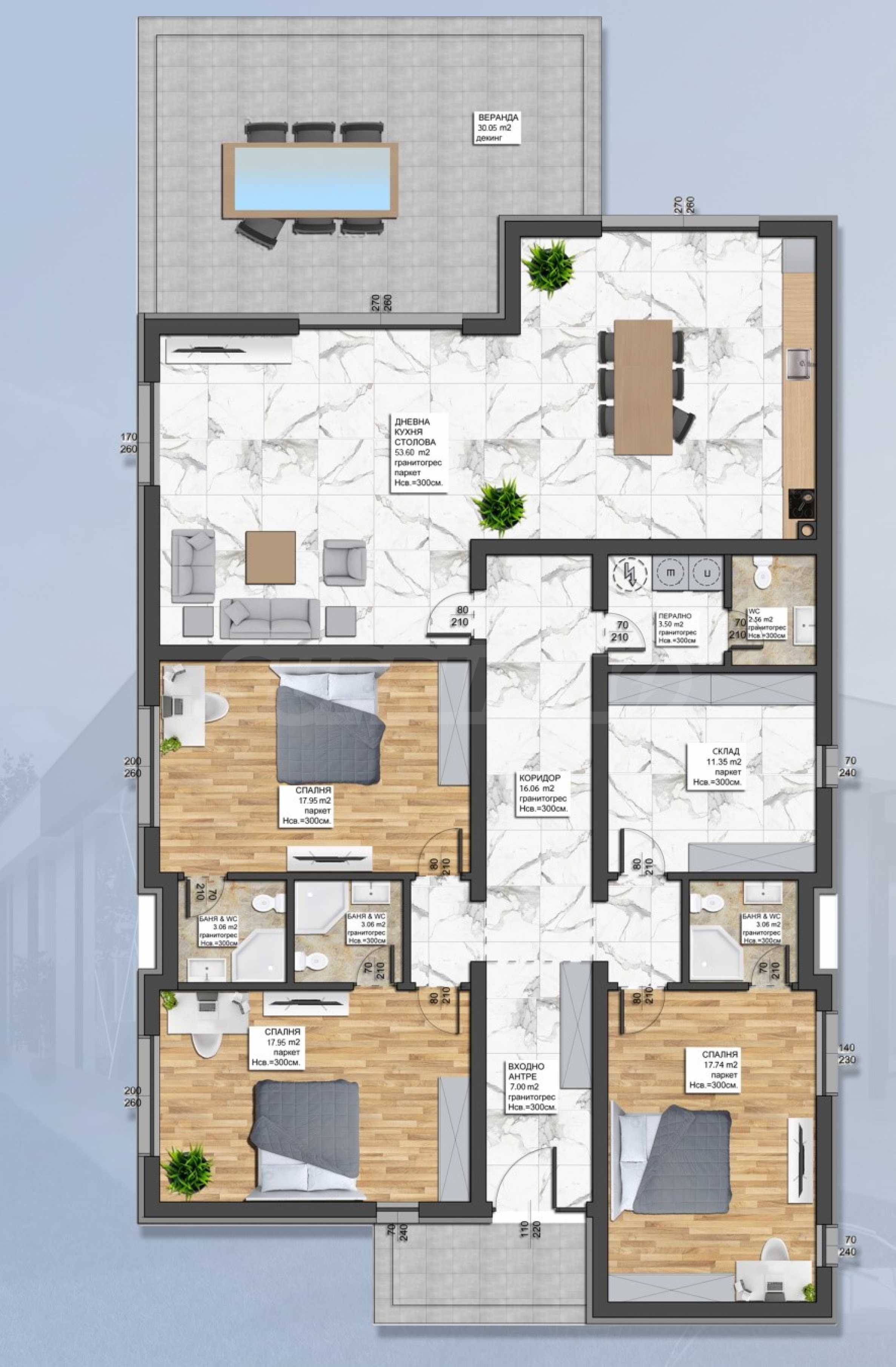 The property has a built-up area of 202 sq.m and has a yard of 533 sq.m. It consists of an entrance hall, a corridor, a spacious living room with a kitchenette and a dining room, three bedrooms, three bathrooms with a toilet, a separate toilet, a laundry room and a veranda.
