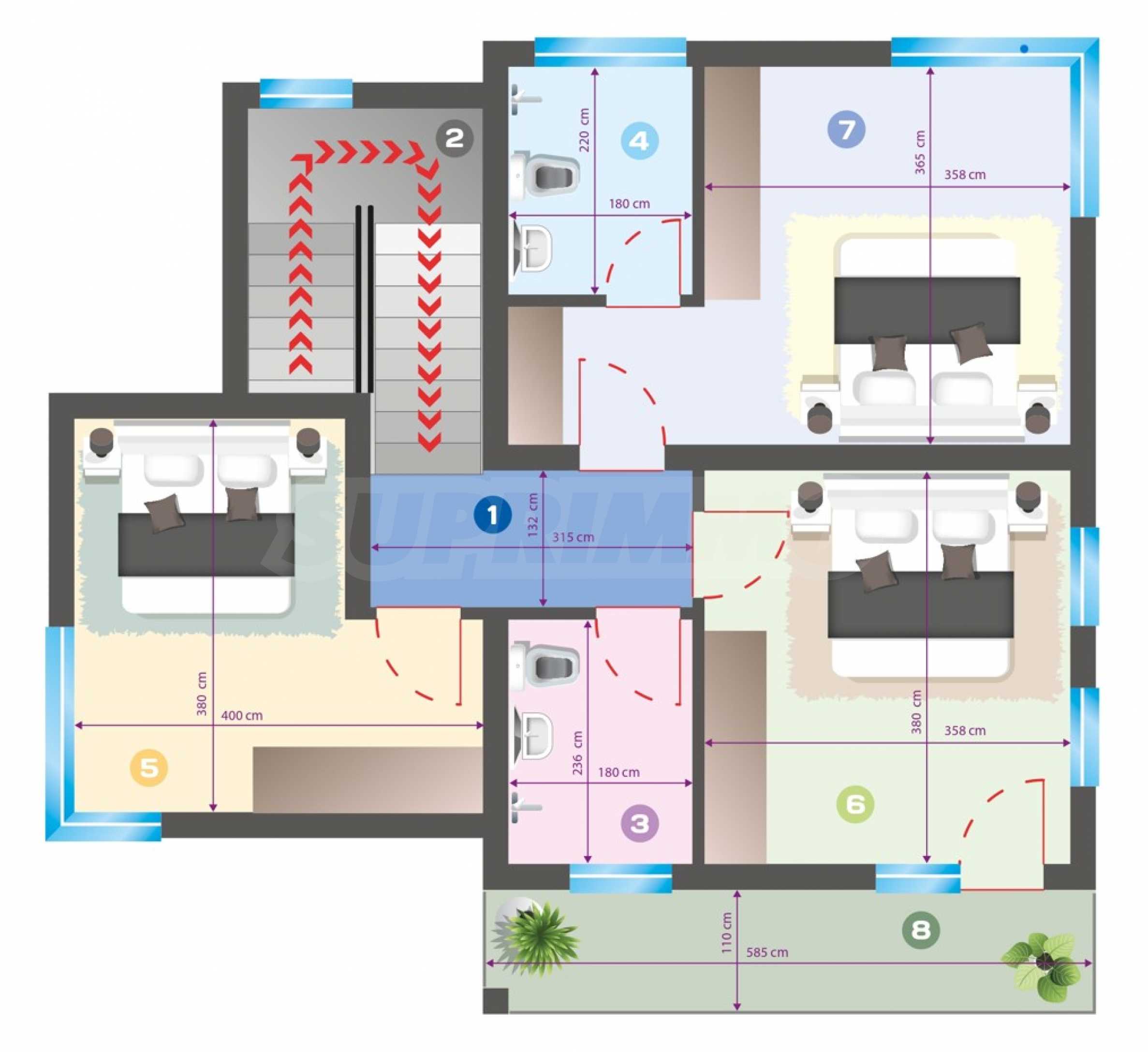 - second floor - three bedrooms, two bathrooms with toilet, entrance hall and terrace. The master bedroom has a private bathroom with a toilet.