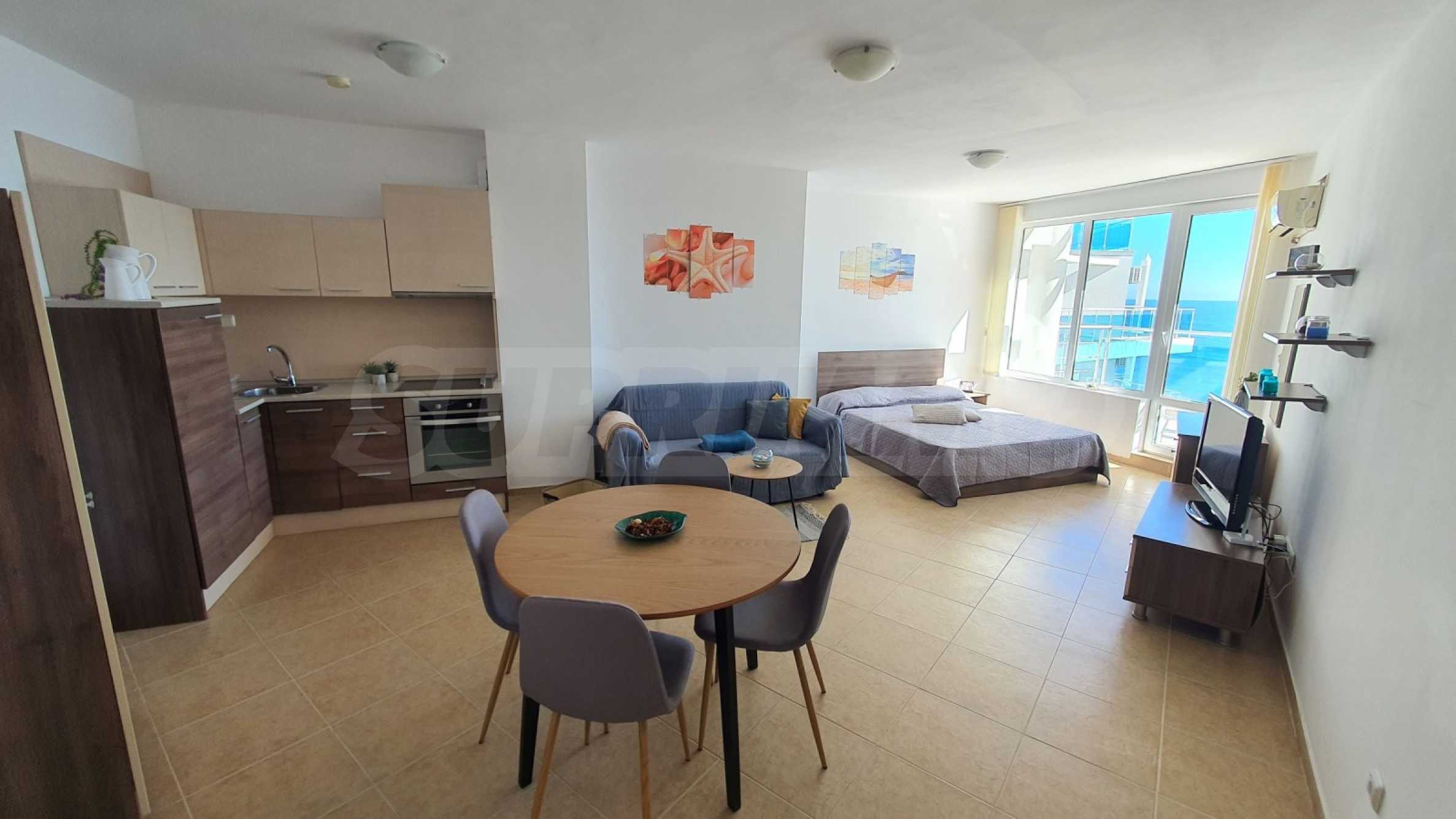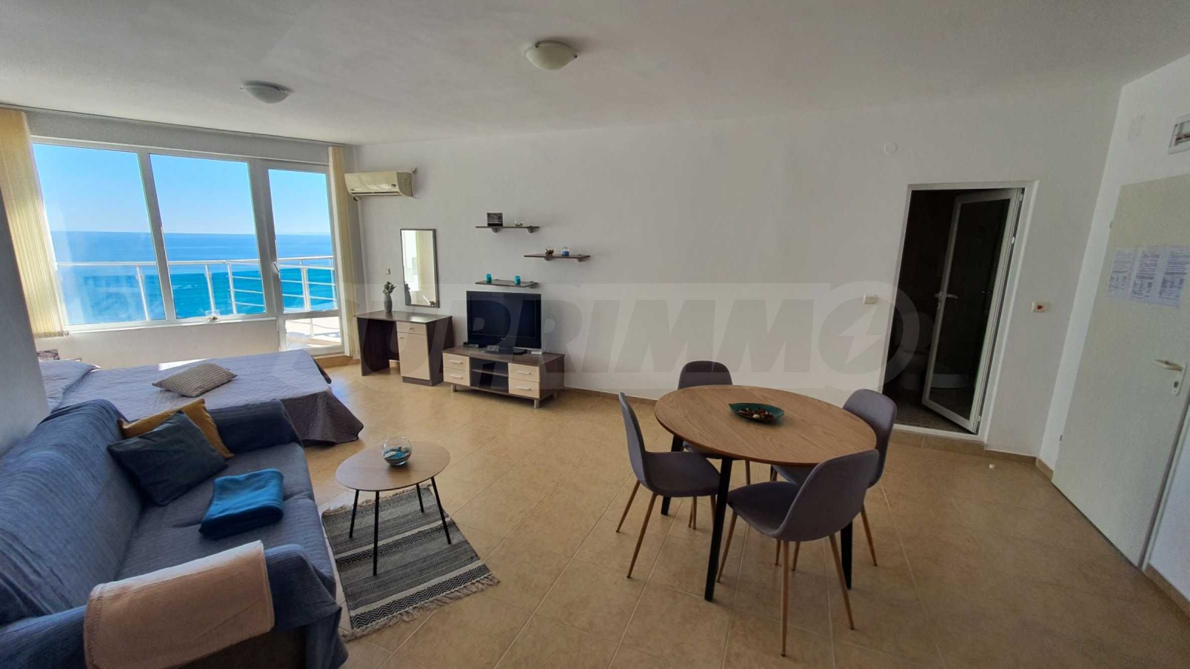 The property is located on the 5th floor and offers a frontal sea view from a spacious terrace. The apartment is comfortably furnished and excellently equipped, it is sold with furniture and appliances, it is a suitable option for both personal use and investment.