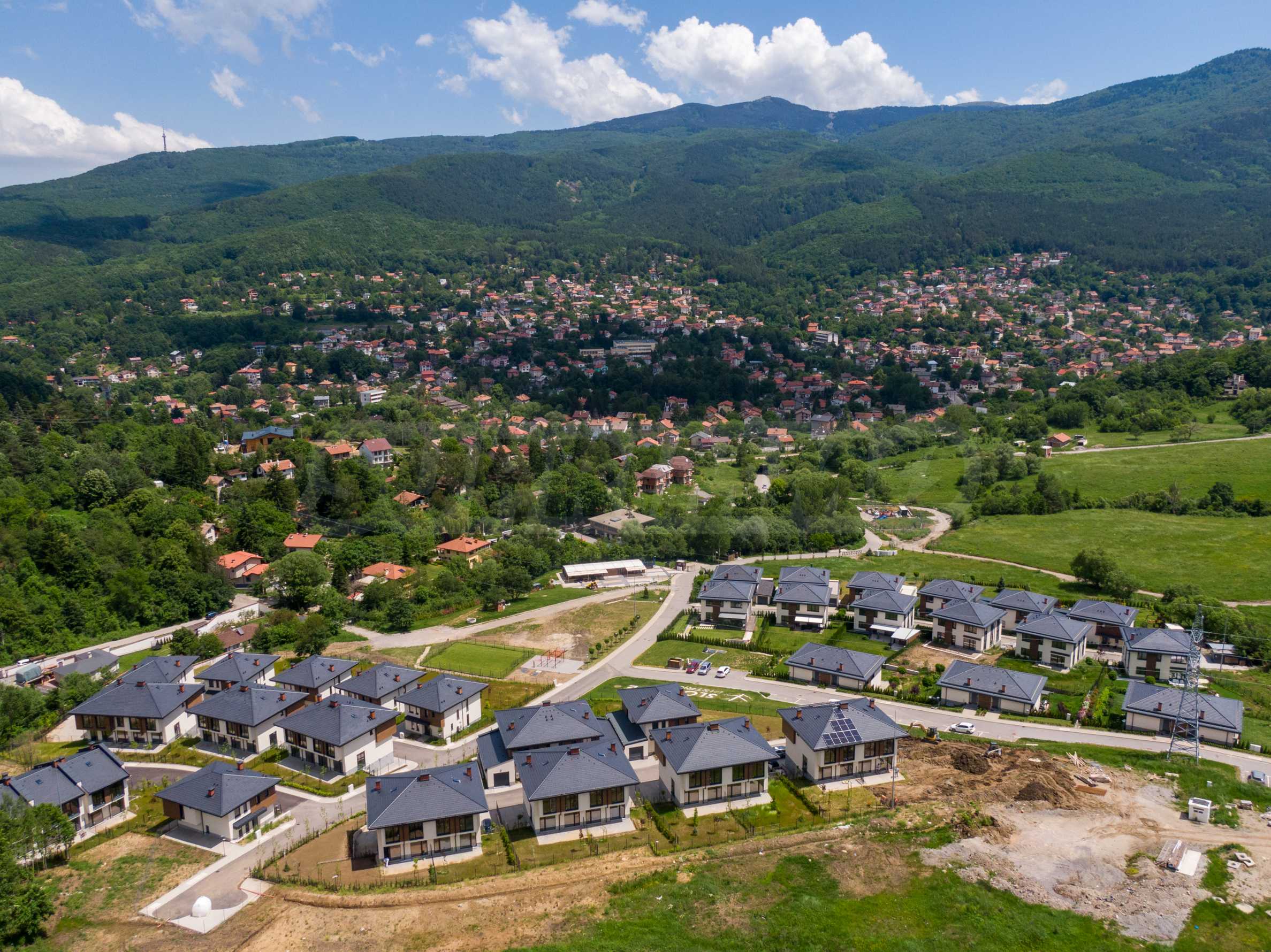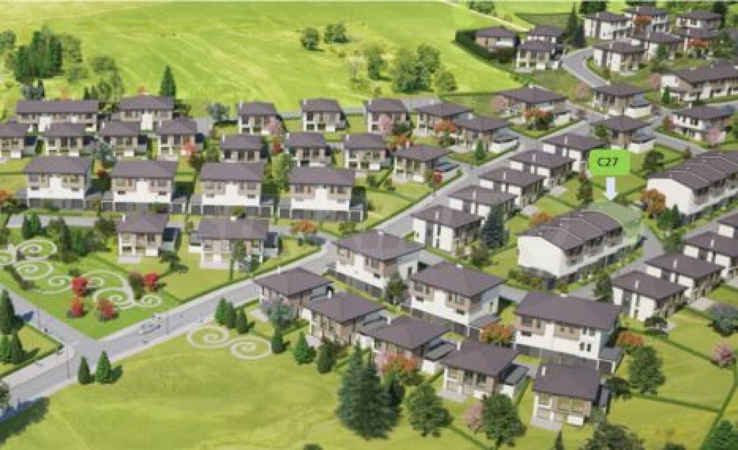 The houses are spread out in a fan-shaped manner, each with all living spaces facing and open to the panorama of Vitosha.