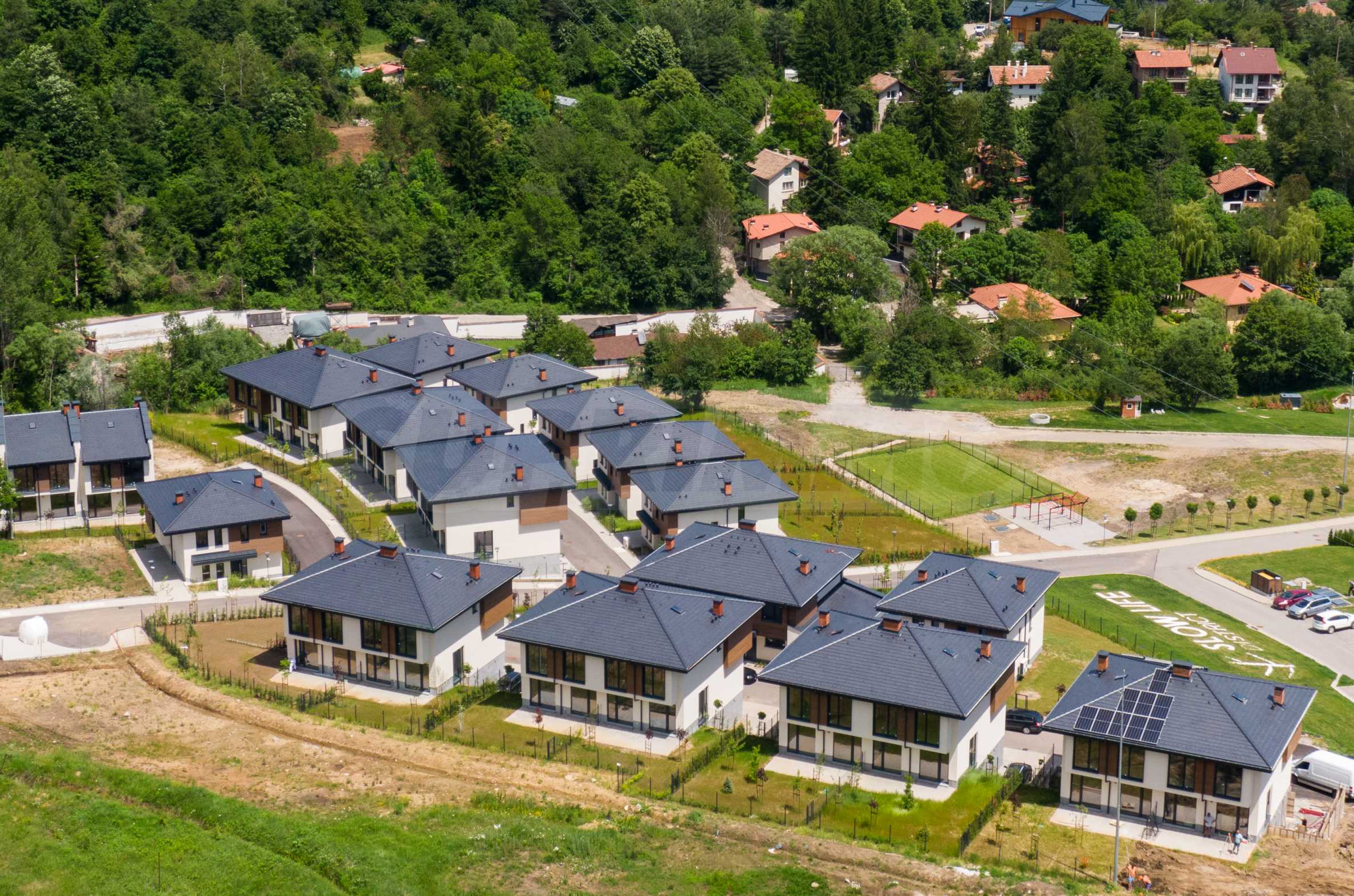 Slow Life can be reached on the road from Sofia to Pernik and Kulata, turning left at the village of Vladaya. The complex is located at an altitude of 950 meters and consists of 45 houses. The complex offers its residents spacious green areas, an outdoor barbecue area, a football field, as well as an outdoor gym.