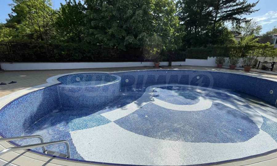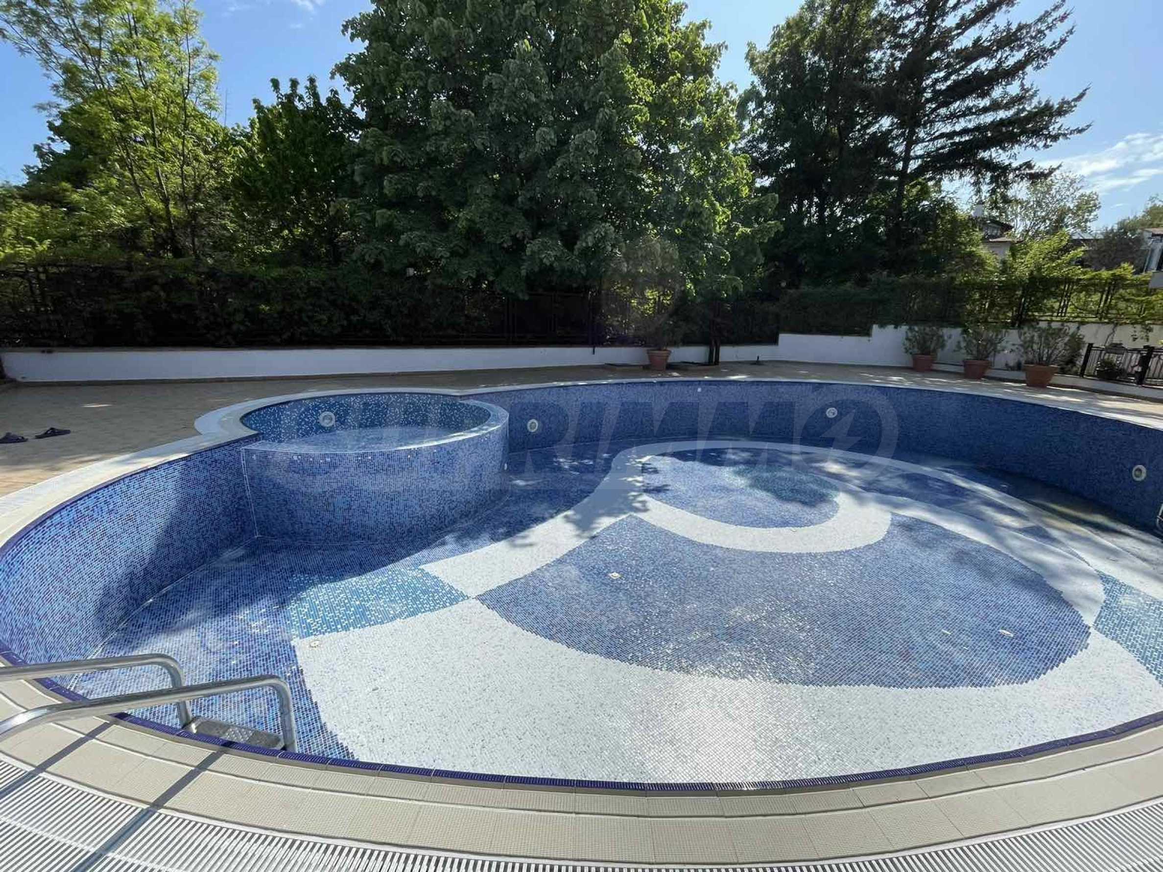 The complex has an outdoor swimming pool and a garden.