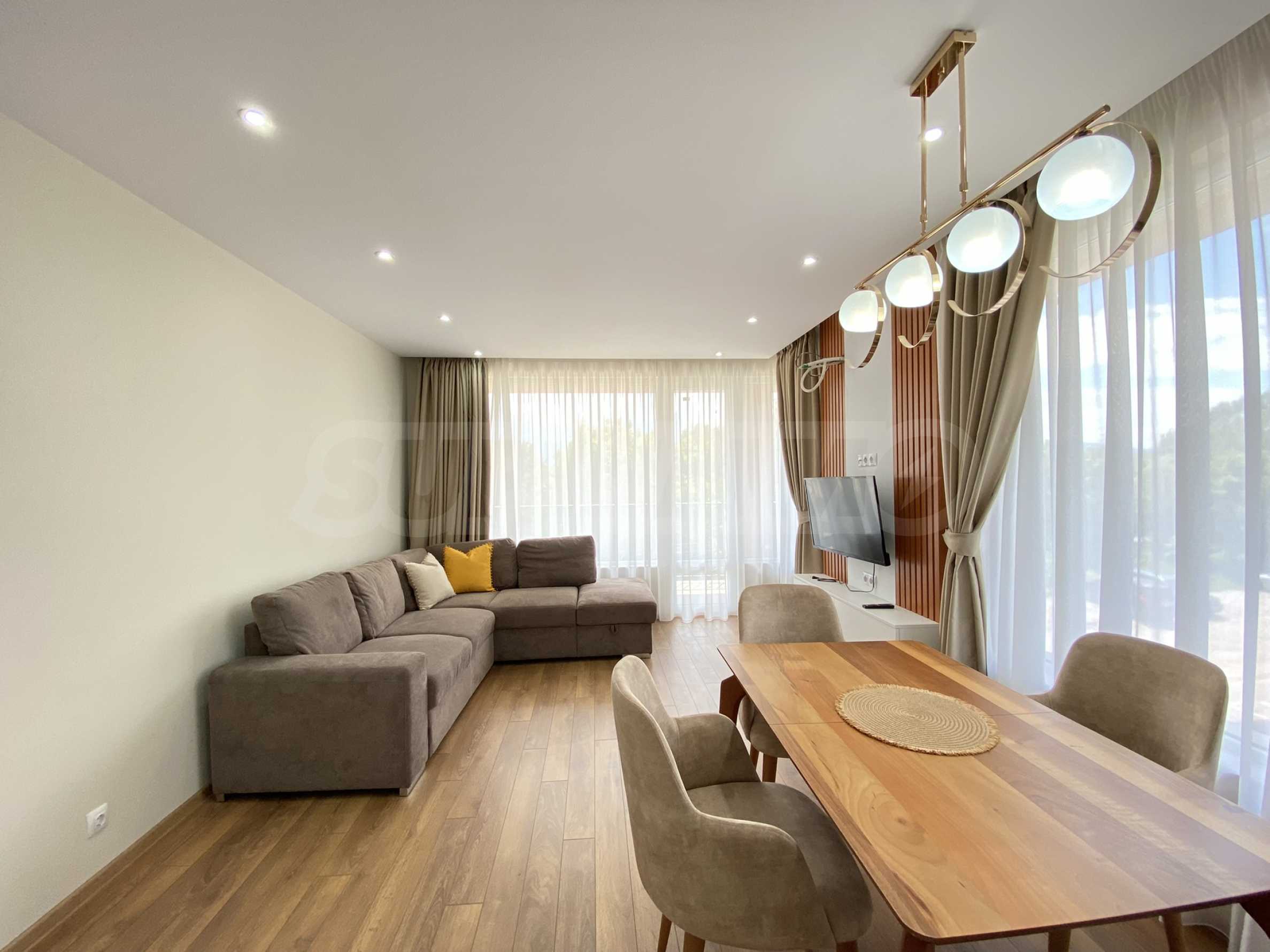 - a spacious and bright living room with a southeast-facing kitchen corner and access to a terrace, from where you will enjoy a wonderful view of a small river and lots of greenery;