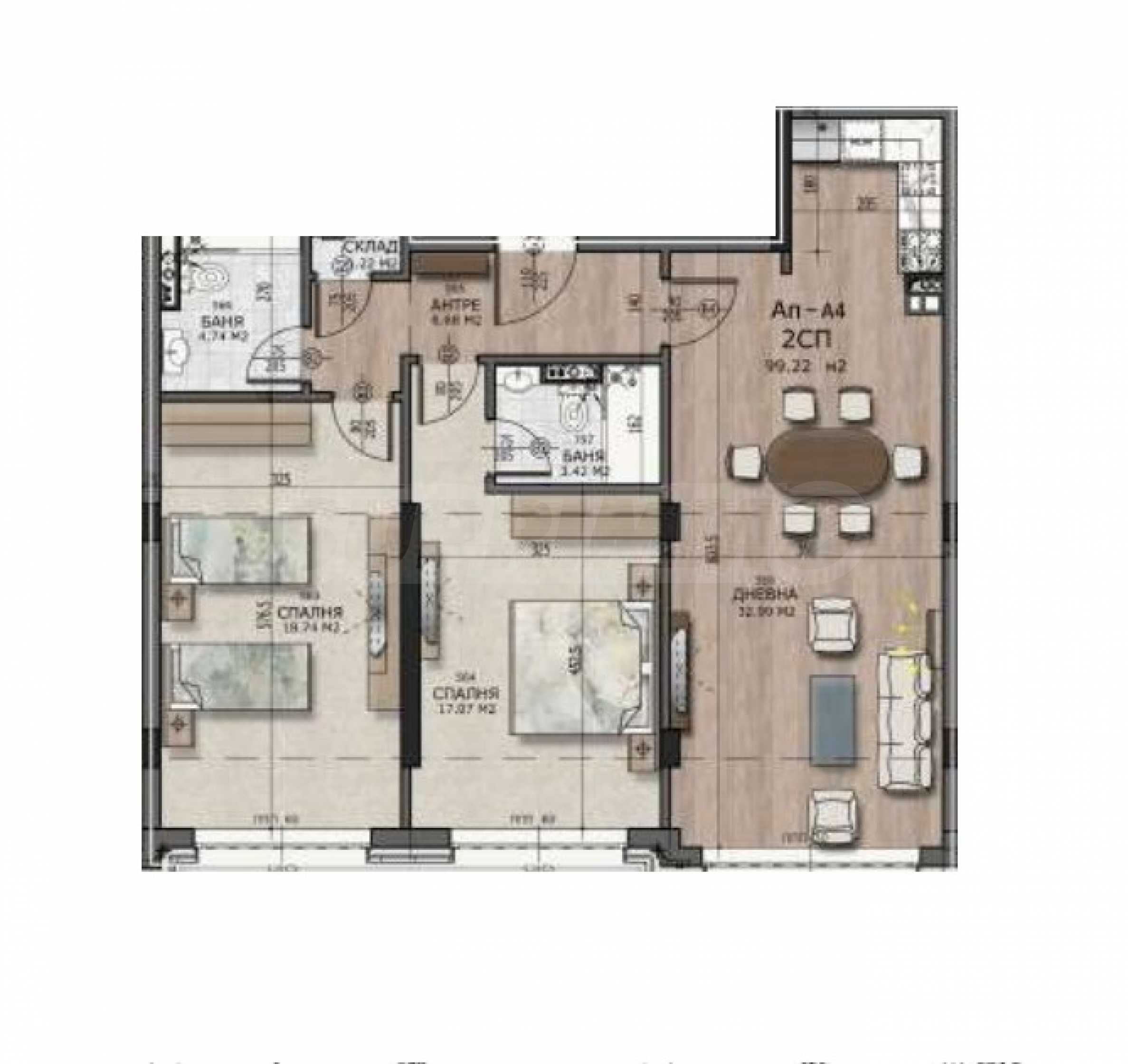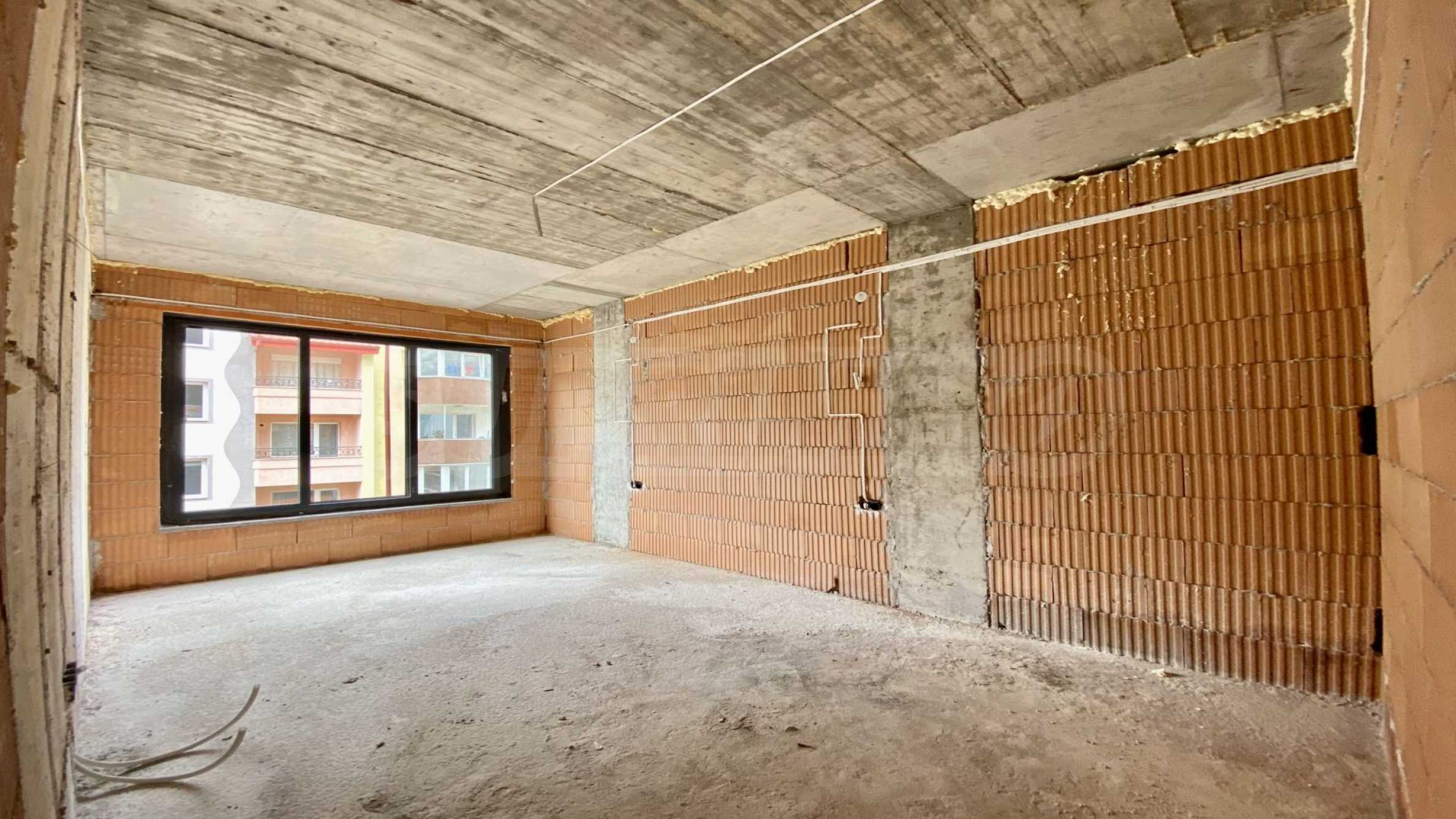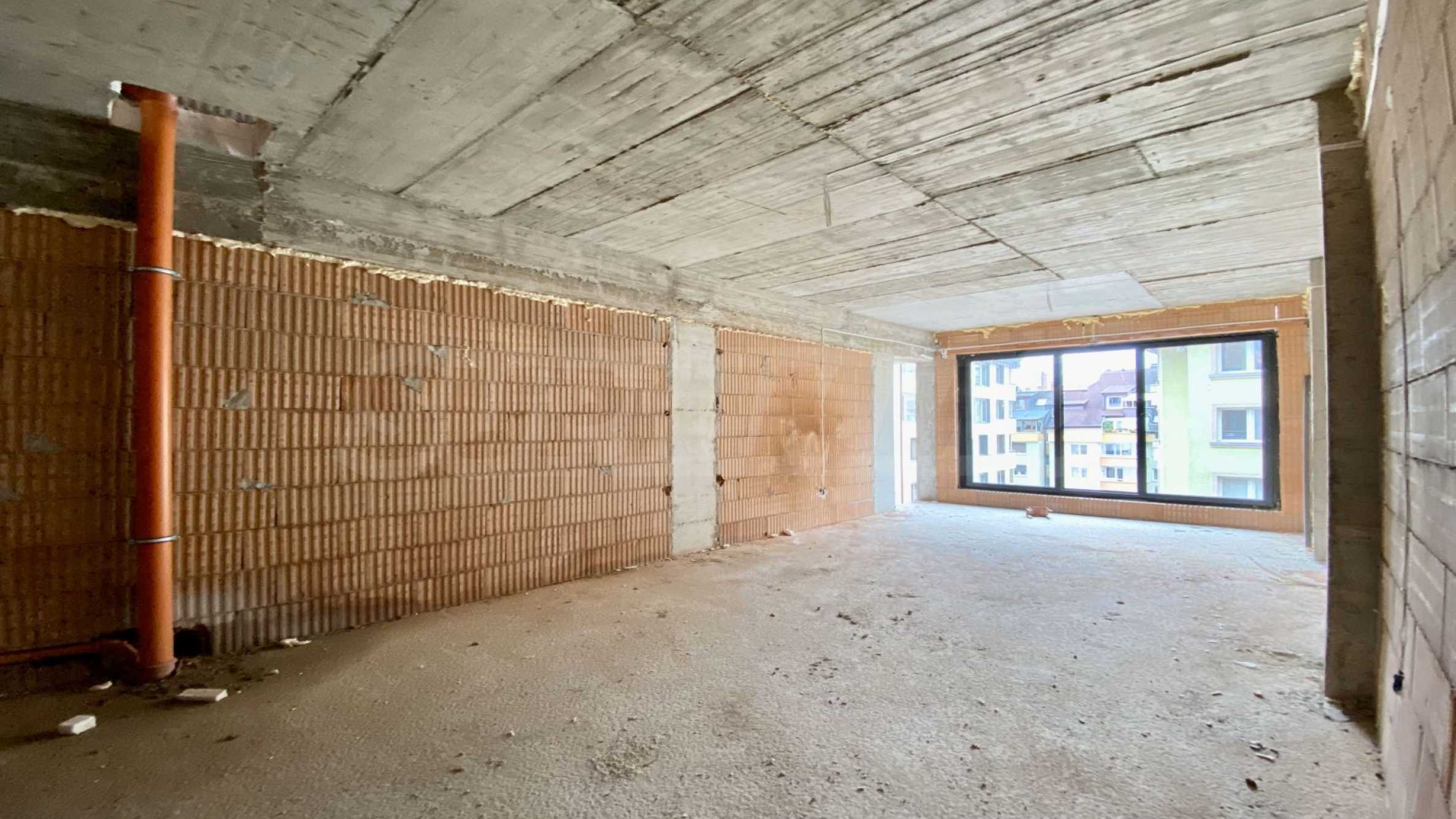 The apartment is located on the 4th floor and offers an area of 117.88 square meters, functionally divided into an entrance hall, a living room with a kitchen area, two bedrooms, two bathrooms with a toilet and a storage room. It is offered qualitatively finished according to the Bulgarian State Standard.