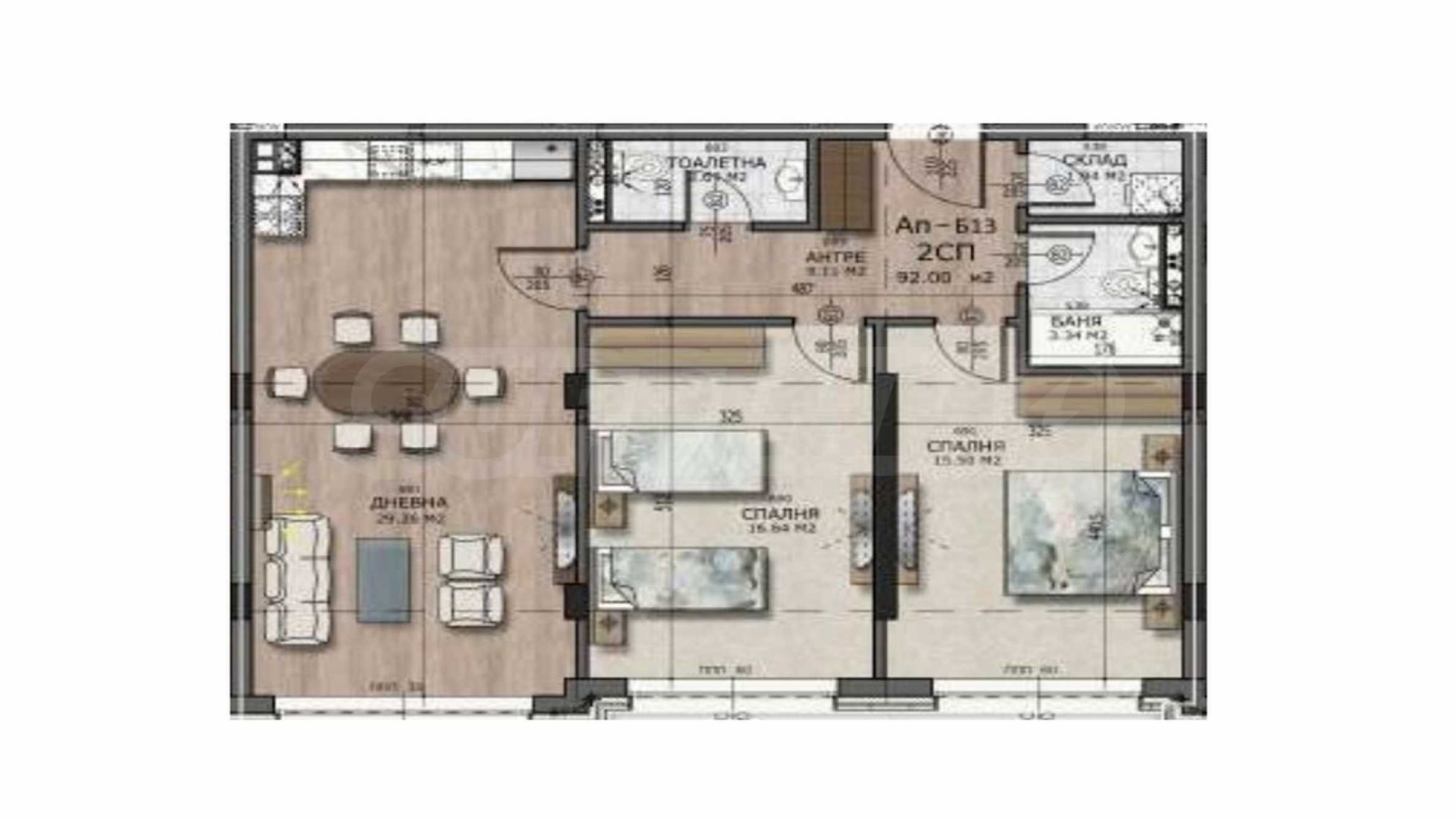 The apartment is located on the 6th floor and offers an area of 109.31 m2., functionally distributed in an entrance hall, living room with kitchenette, two bedrooms, bathroom with toilet, toilet, storage room. It is offered qualitatively finished according to the Bulgarian State Standard.