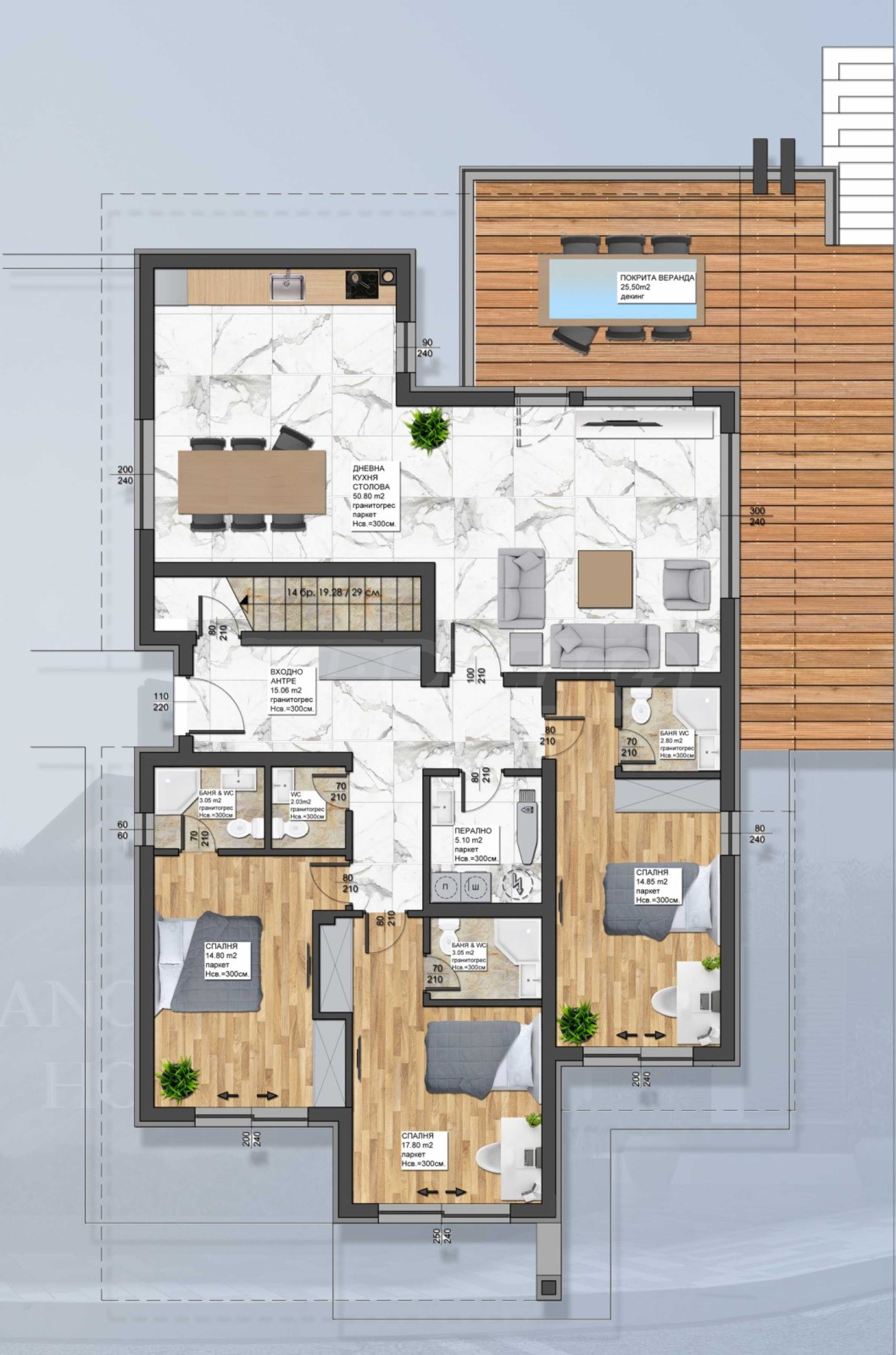 - first floor - entrance hall, corridor, spacious living room with kitchenette and dining area, three bedrooms, three bathrooms with toilet, laundry room and veranda.