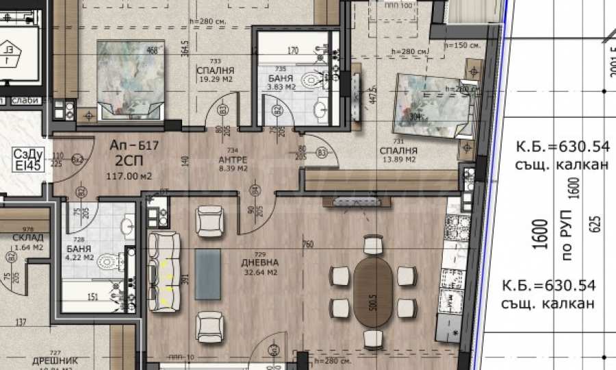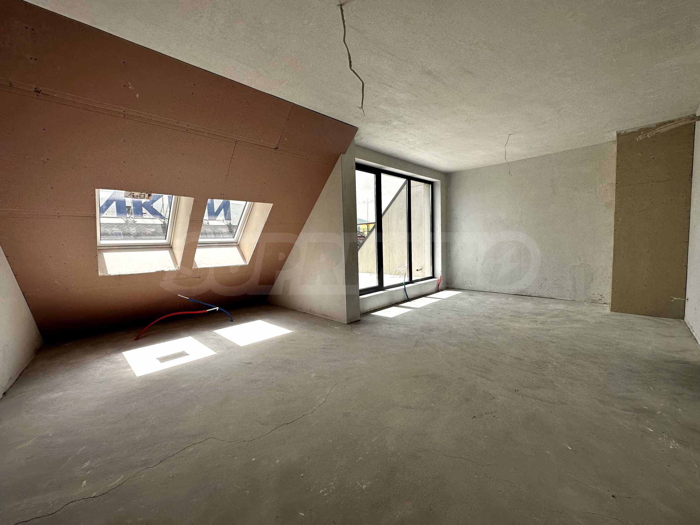 The apartment is located on the 7th floor and offers an area of 139.01 square meters, functionally divided into an entrance hall, a living room with a kitchen area, two bedrooms, two bathrooms with a toilet, a terrace. It is offered qualitatively finished according to the Bulgarian State Standard.