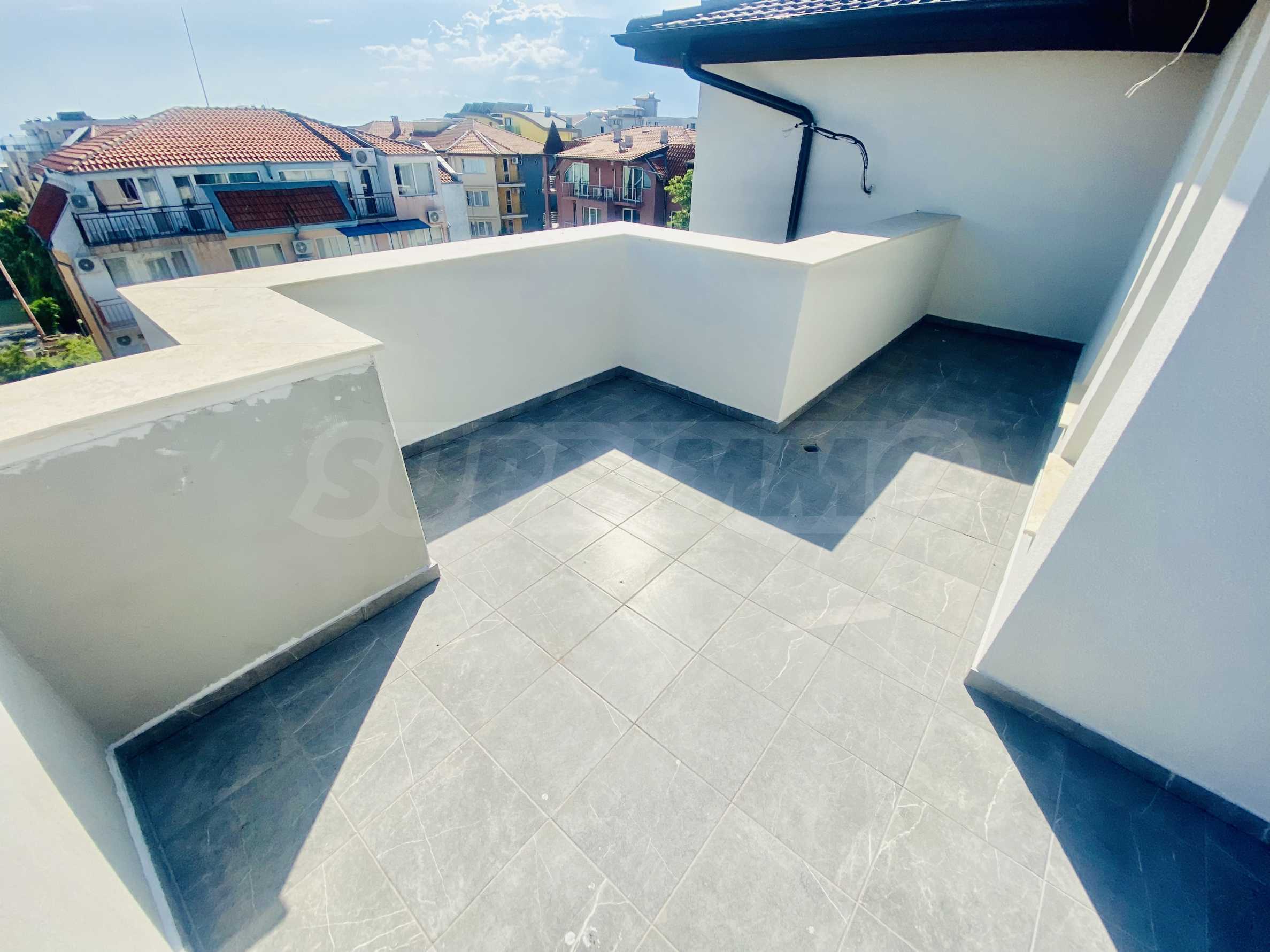 The property is located on the 5th attic floor, with a total area of 66.21 m2 (22.50 m2 terrace and 6.16 m2 common areas). It is offered in a "turnkey" level of completion with doors, equipped bathroom, lighting, flooring - laminate in all rooms and tiles in the kitchen, air conditioning.