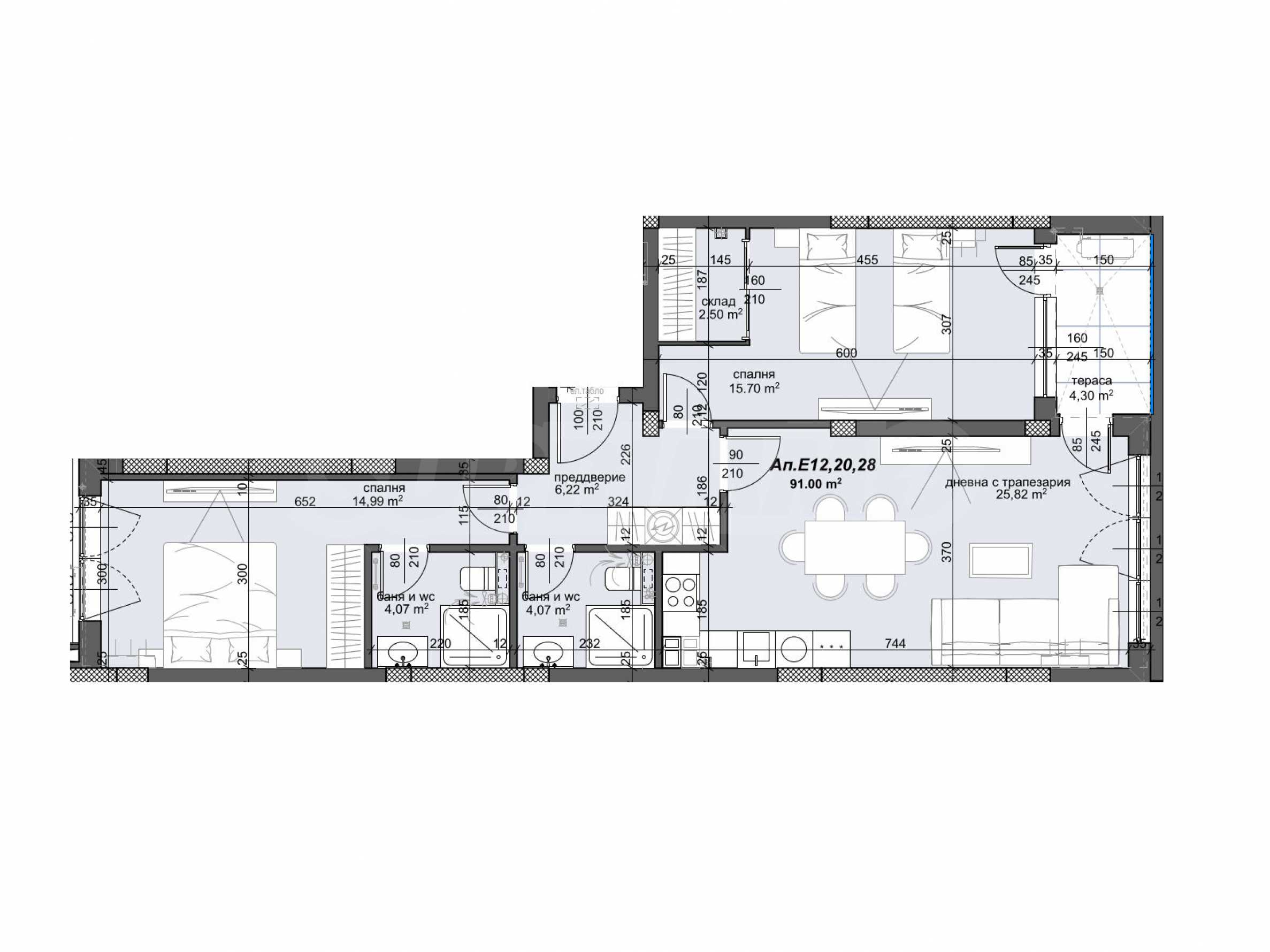 The property with a total area of 107.61 sq.m is located on the 4th floor of 10. It consists of an entrance hall, living room with dining area and kitchen, corridor, two bedrooms, storage room, two bathrooms with toilet and a terrace.