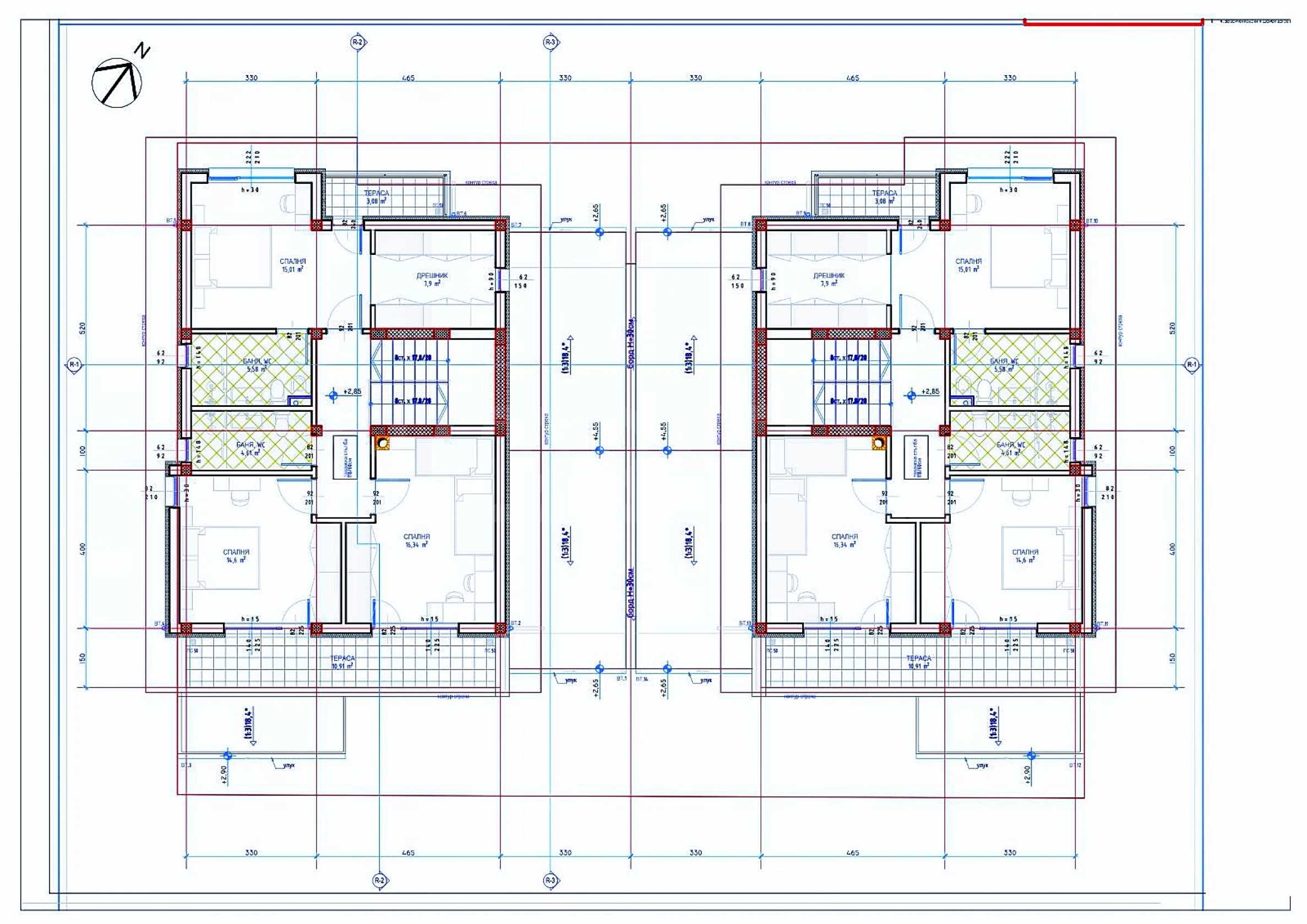 - second floor - corridor, bedroom 1 (16 m2), bedroom 2 (15 m2) with shared terrace (11 m2) and shared bathroom with toilet (5 m2), bedroom 3 (15 m2 ) with a wardrobe (8 m2.), a terrace (3 m2.) and a bathroom with a toilet (6 m2.).