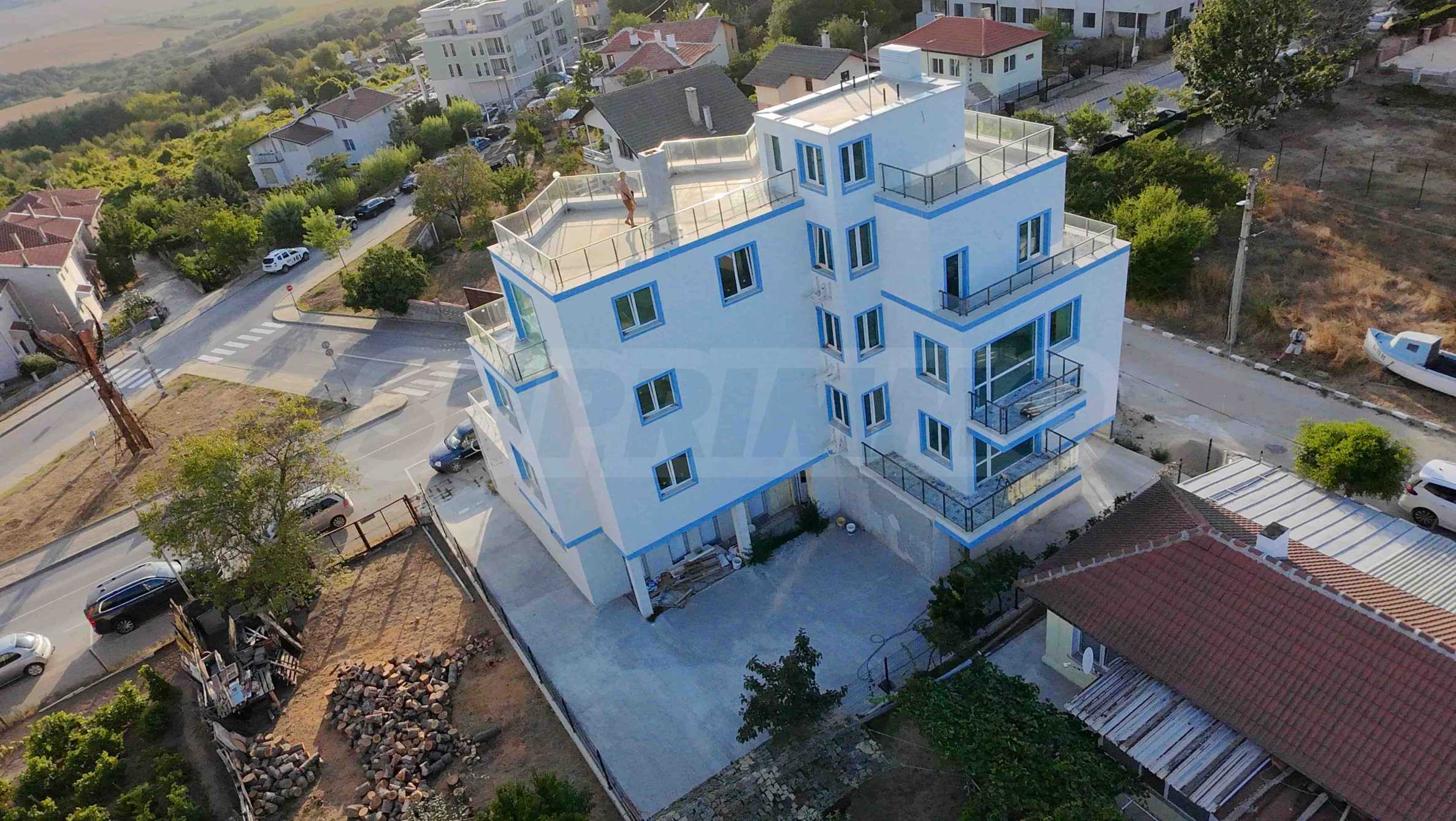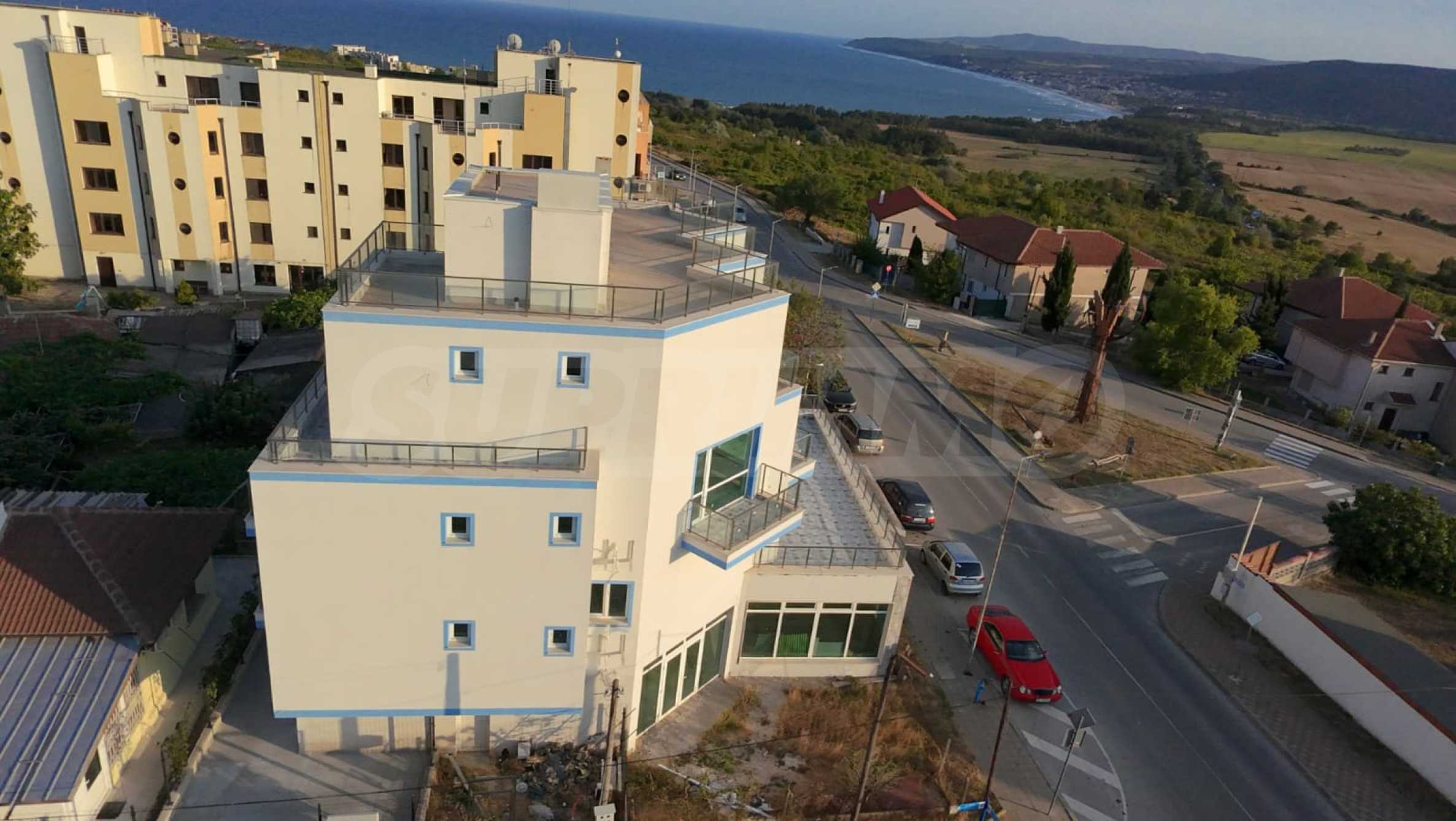 The complex offers two-bedroom apartments, a three-bedroom penthouse, a pharmacy and a cafe on the ground floor, and a roof terrace with a jacuzzi - a convenient place for sunbathing and relaxing with a good view.