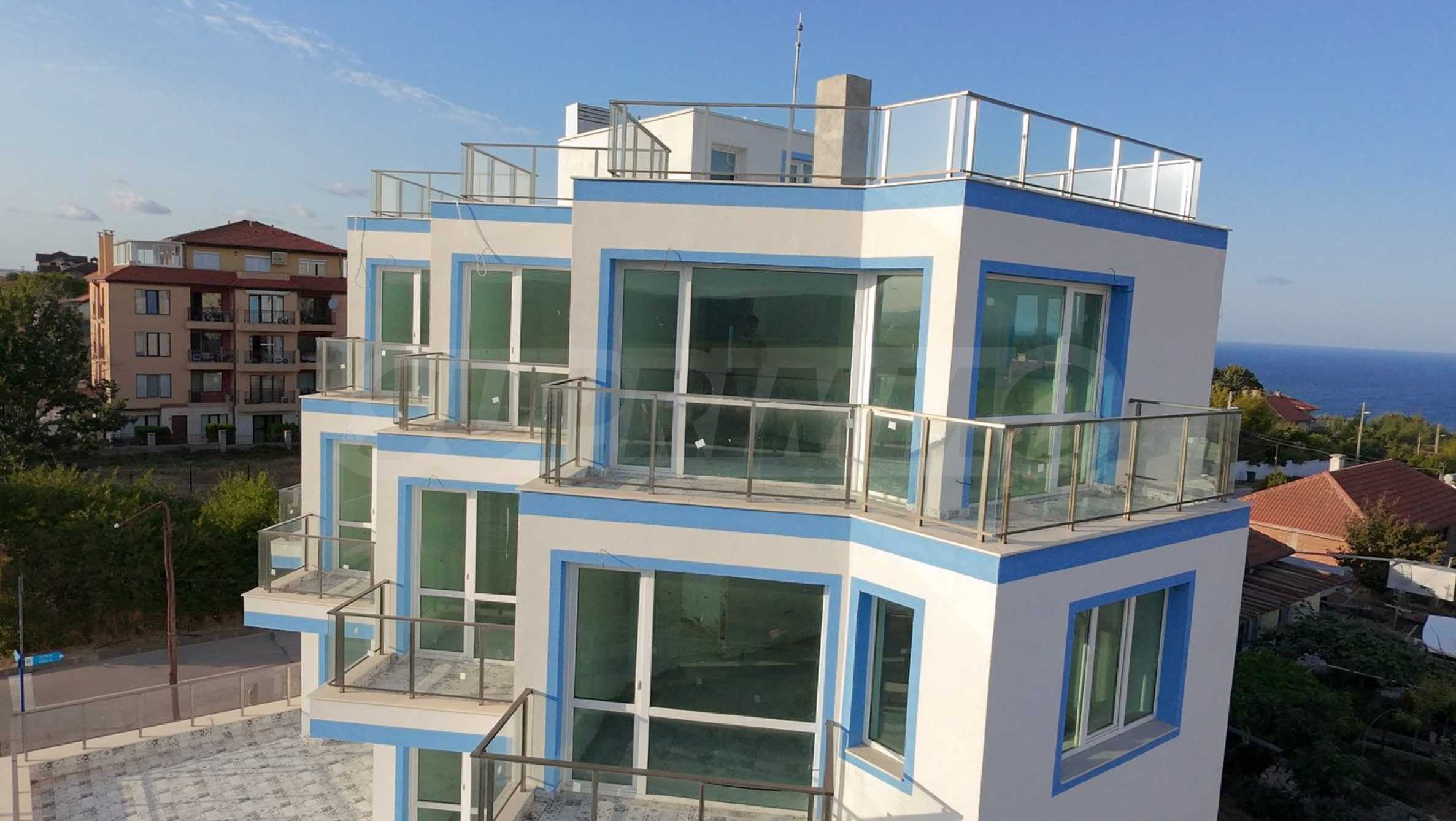 There are two apartments per floor and each apartment has a closet, a terrace and a sea view.