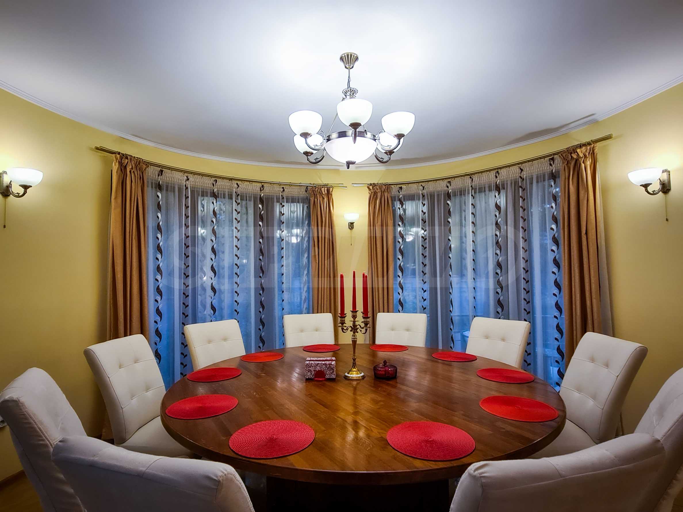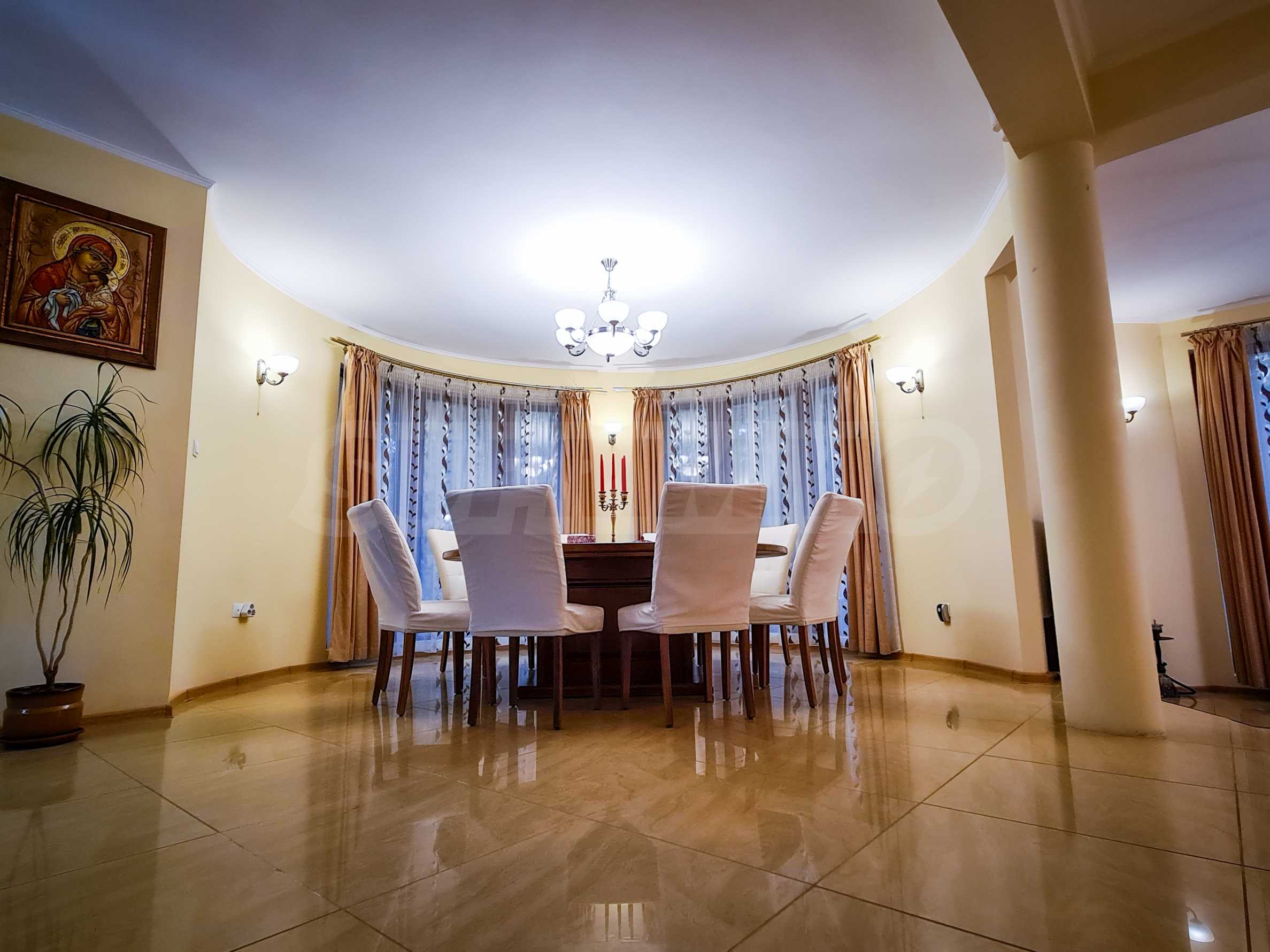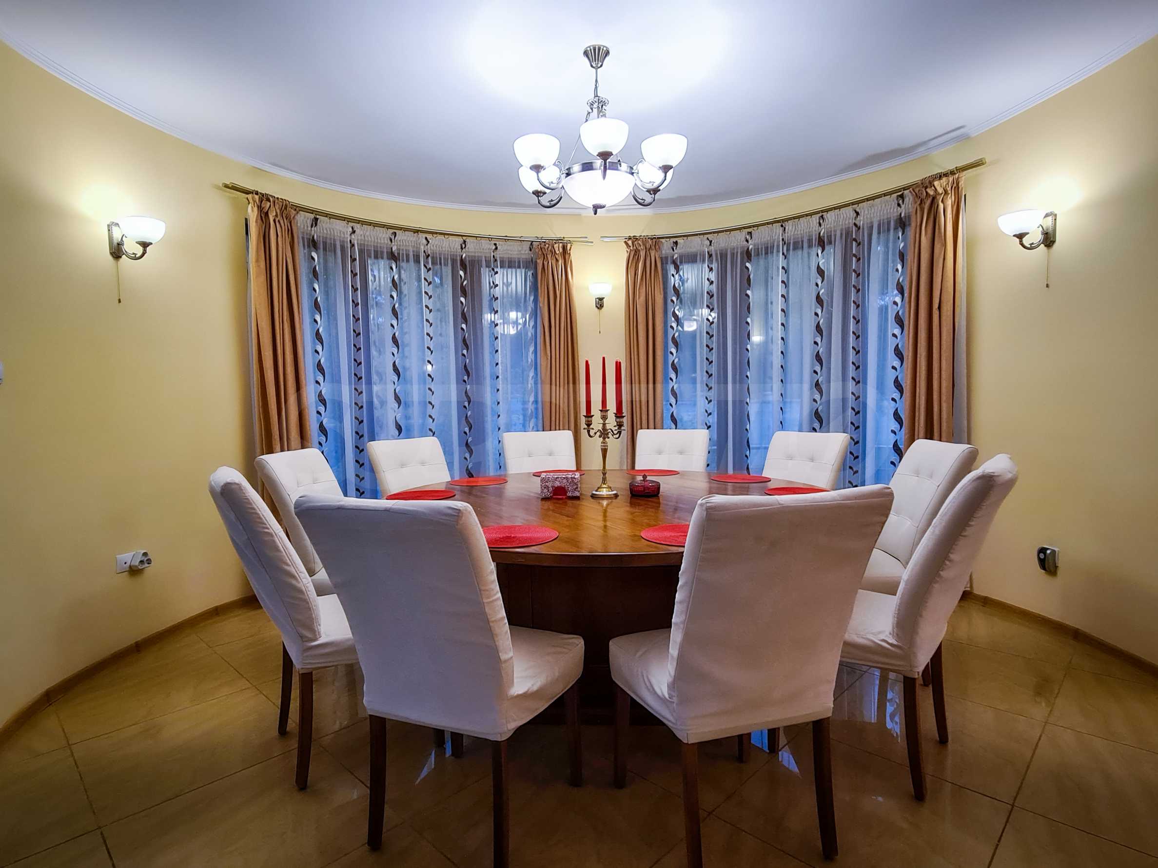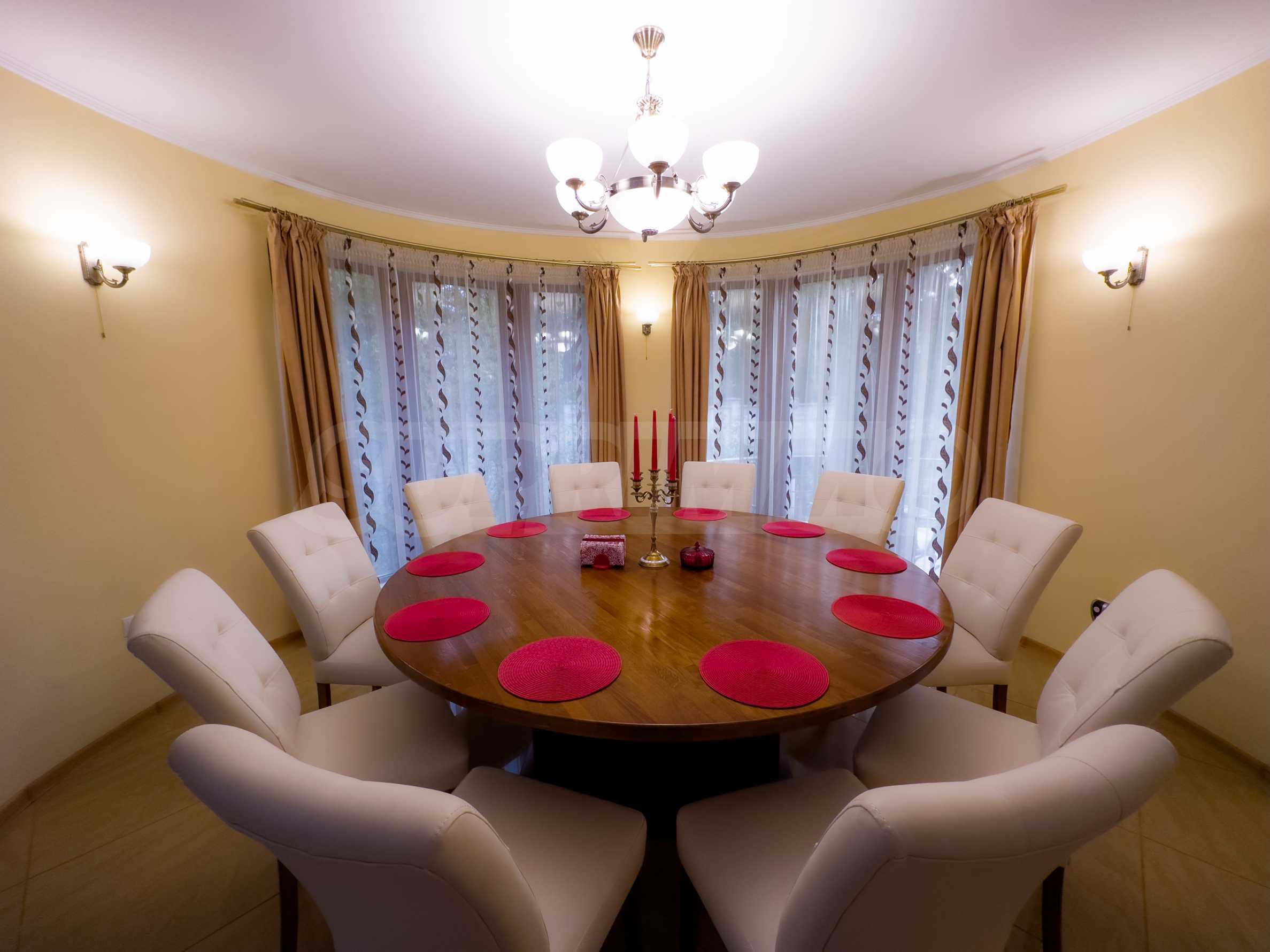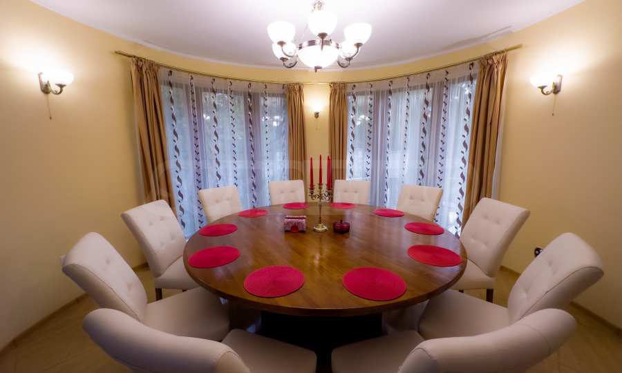 The dining room has a capacity of 12 seats, furnished with a massive round oak table and leather-covered chairs. The comfortable sofas in the living room are an excellent area for relaxation.