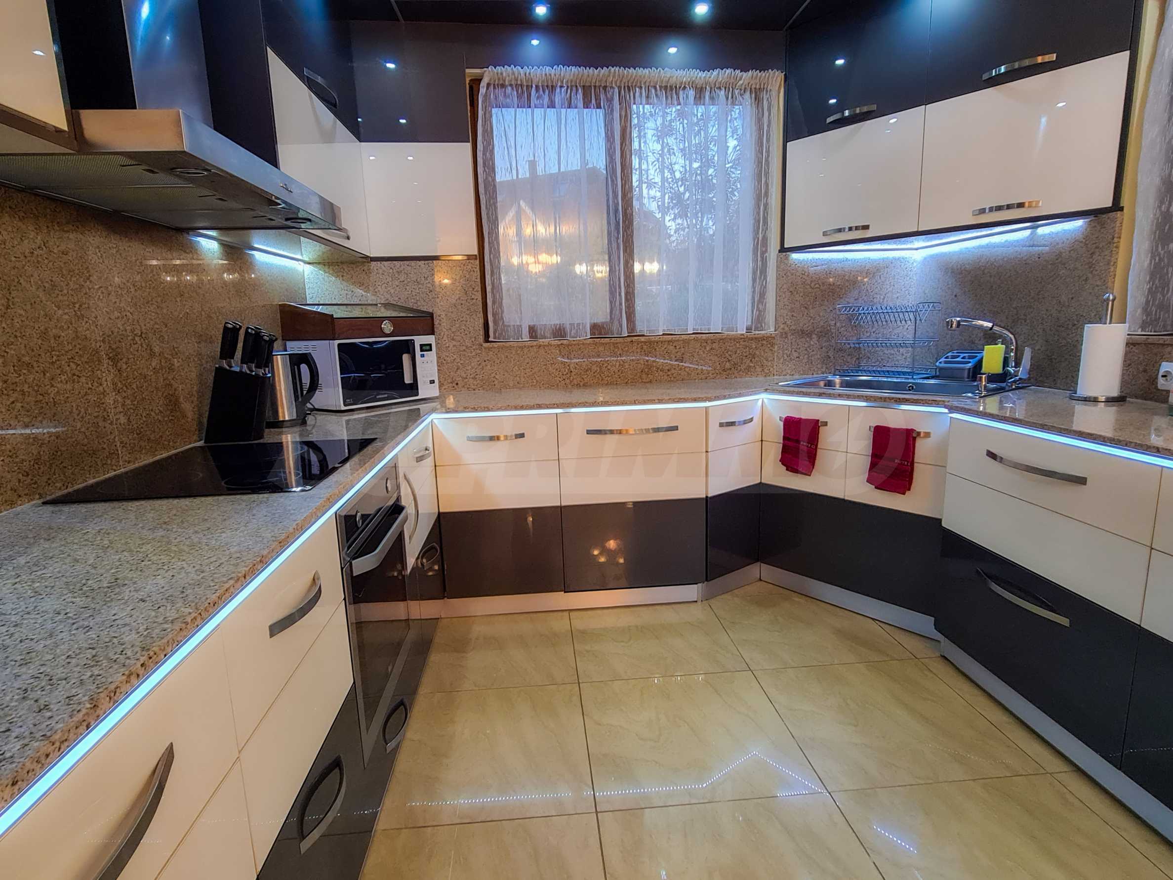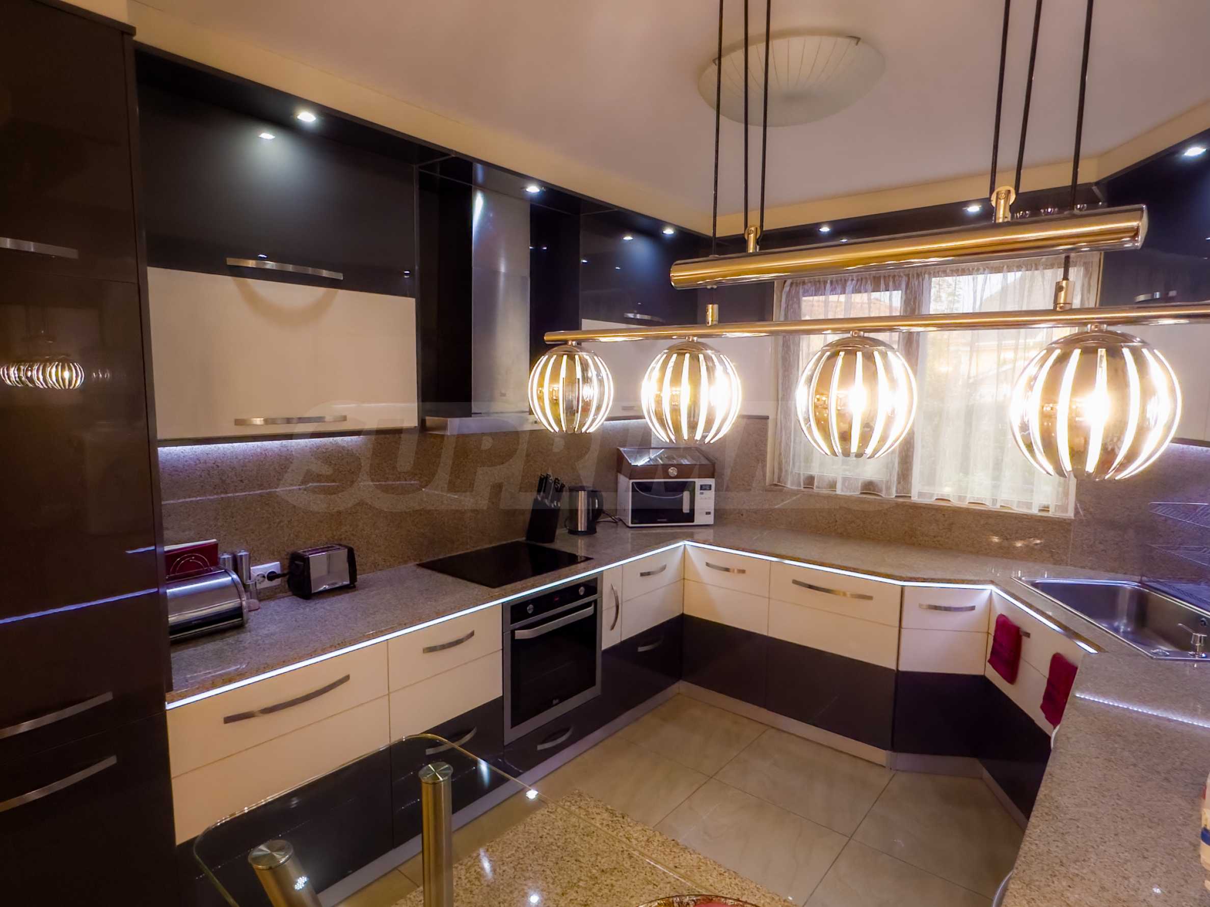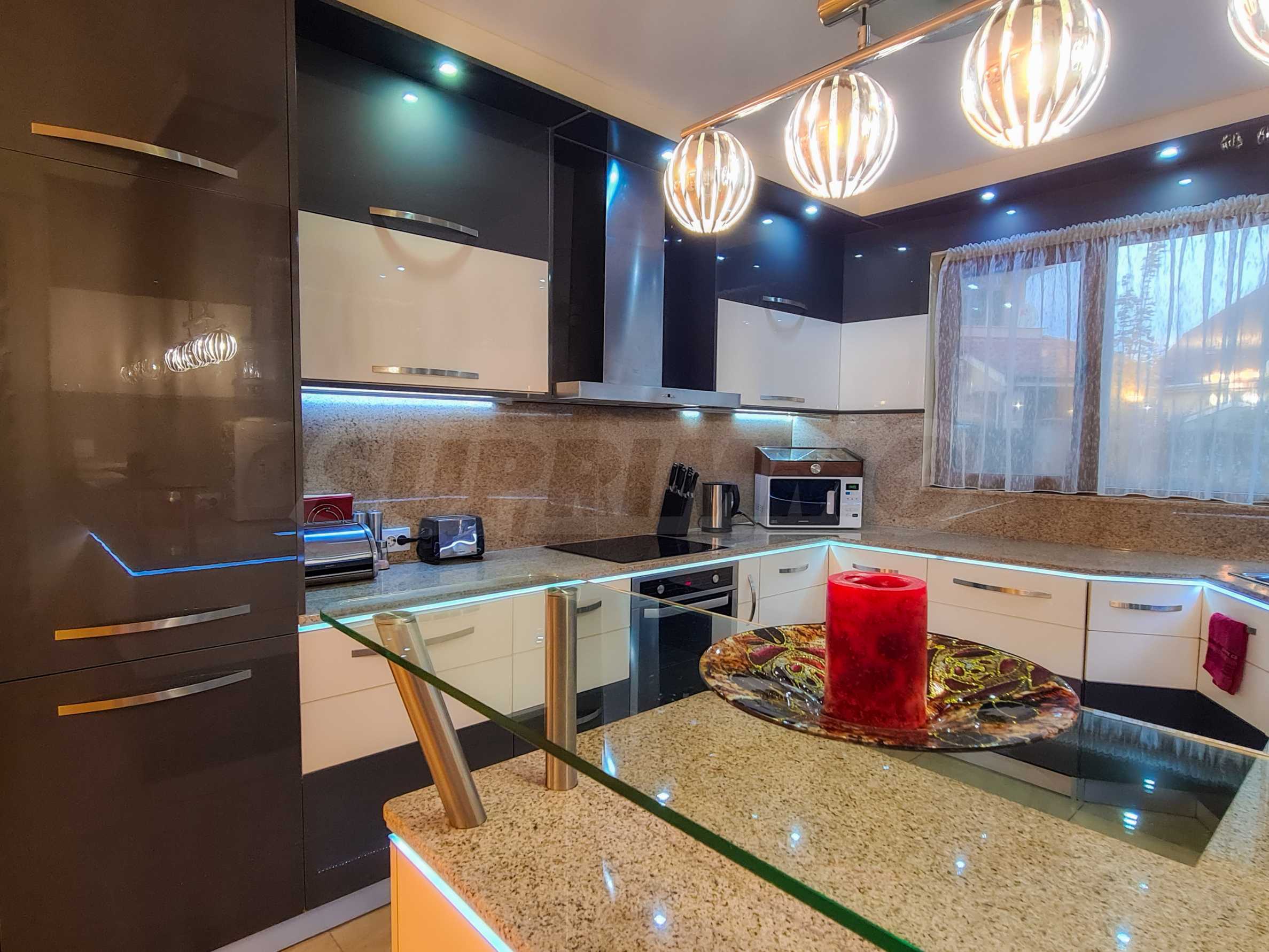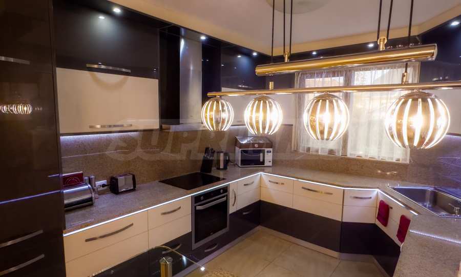 The kitchen is custom-made, in a modern style, fully equipped with everything needed for a household.
