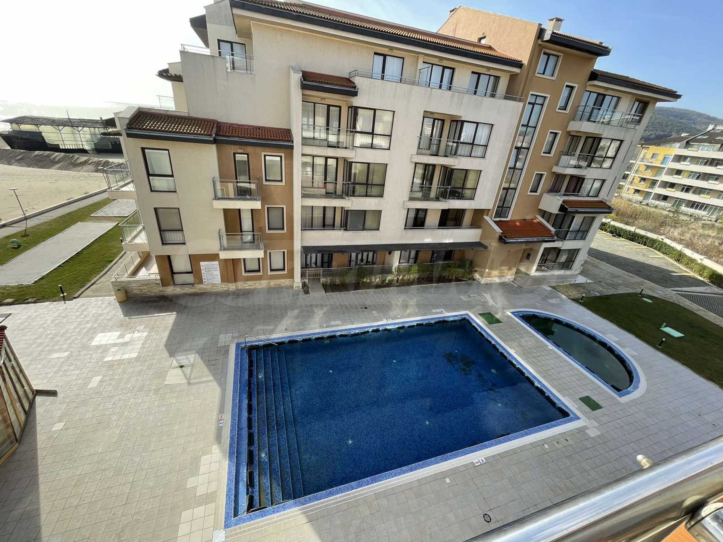 The complex offers a reception, 13 elevators in the individual buildings, various shops, a supermarket, a buffet, and two a la carte restaurants with wonderful outdoor terraces and a view of the Black Sea. The outdoor areas of the resort consist of 5 large swimming pools (one of which is heated), 4 children's pools, a poolside bar with snacks, a sun terrace, and 24-hour security. The pool and beach areas include sunbeds and umbrellas opposite payment.