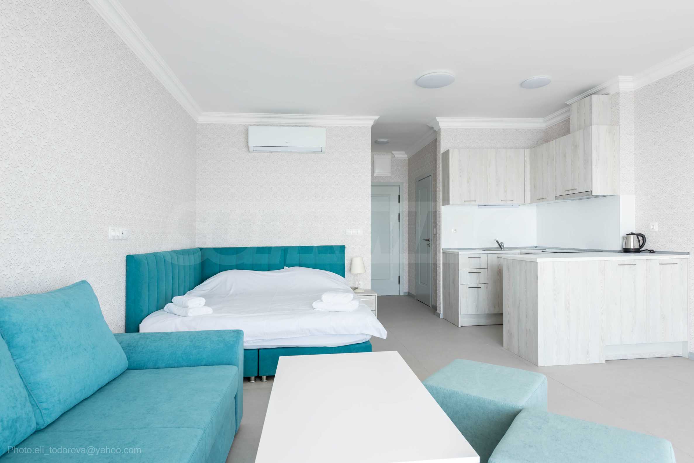 The one-room apartment is brand new, located on the first floor of a boutique building with a pool and amenities, right on the beach.