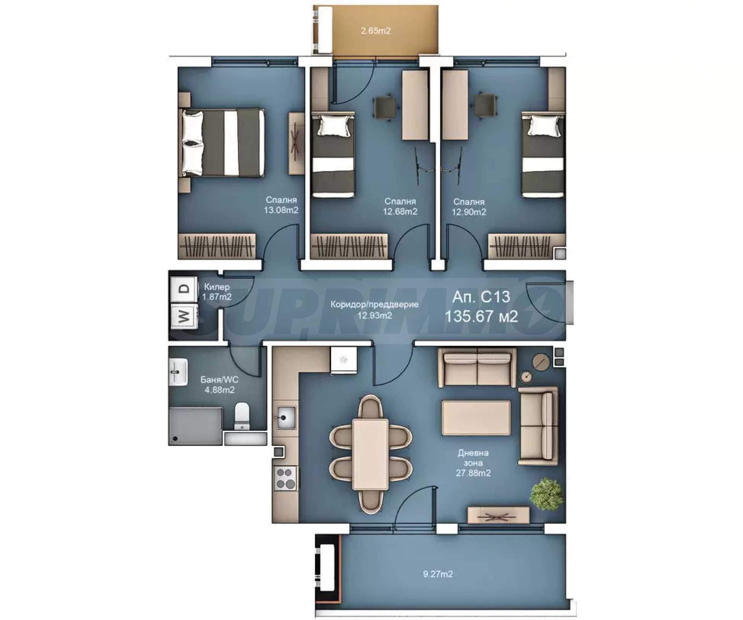 - terrace - 9.27 m2 + 2.65 m2.