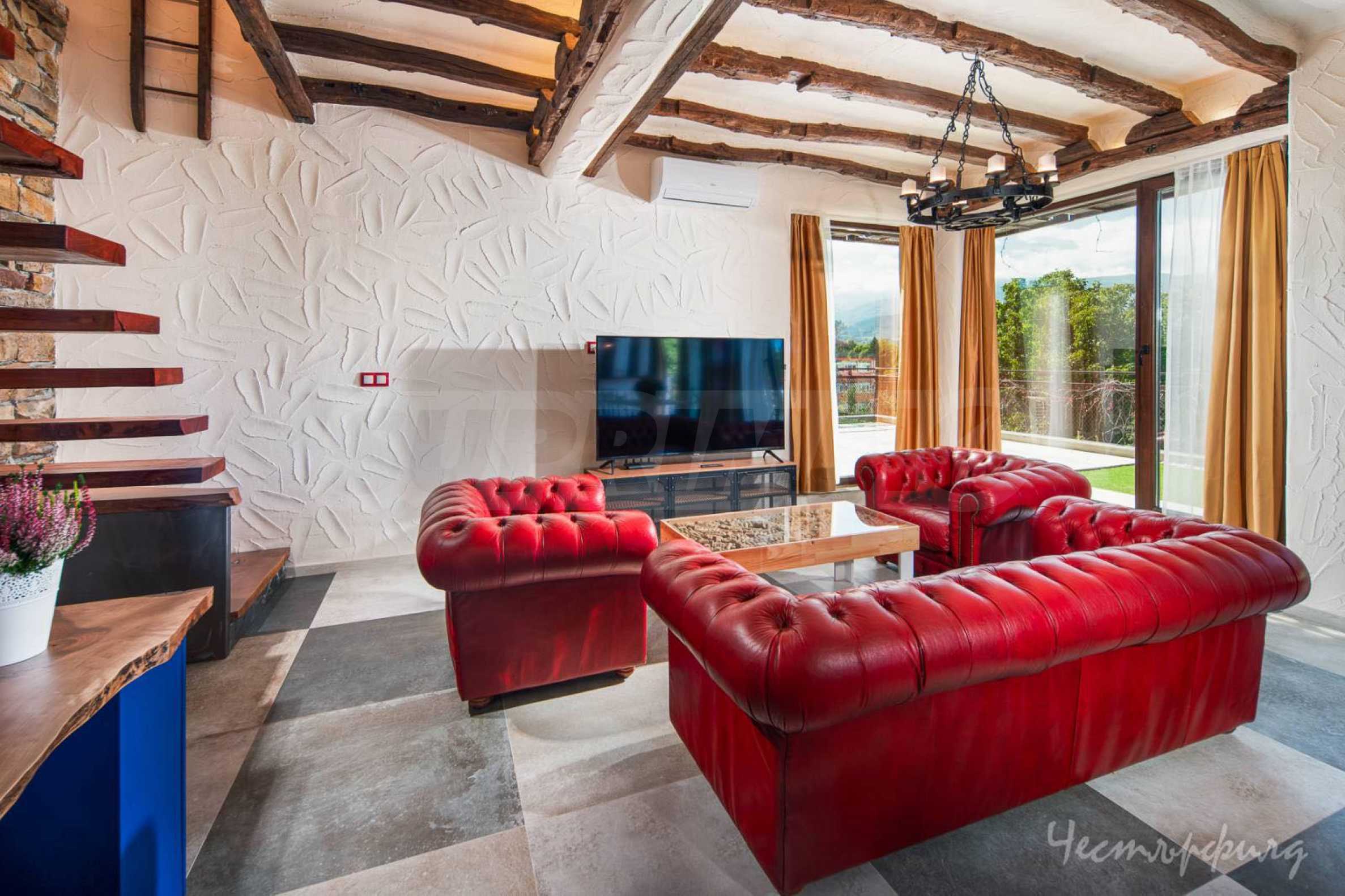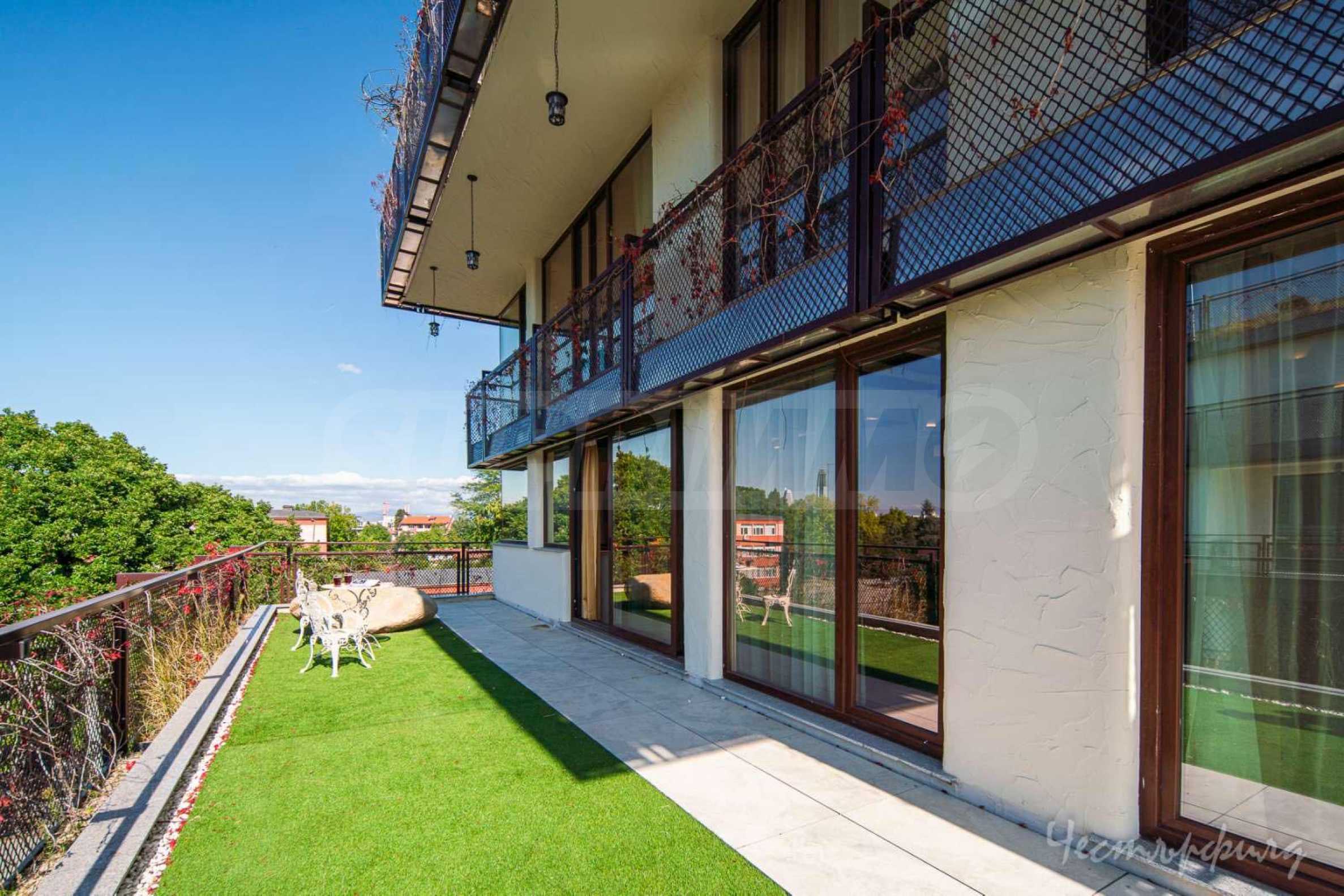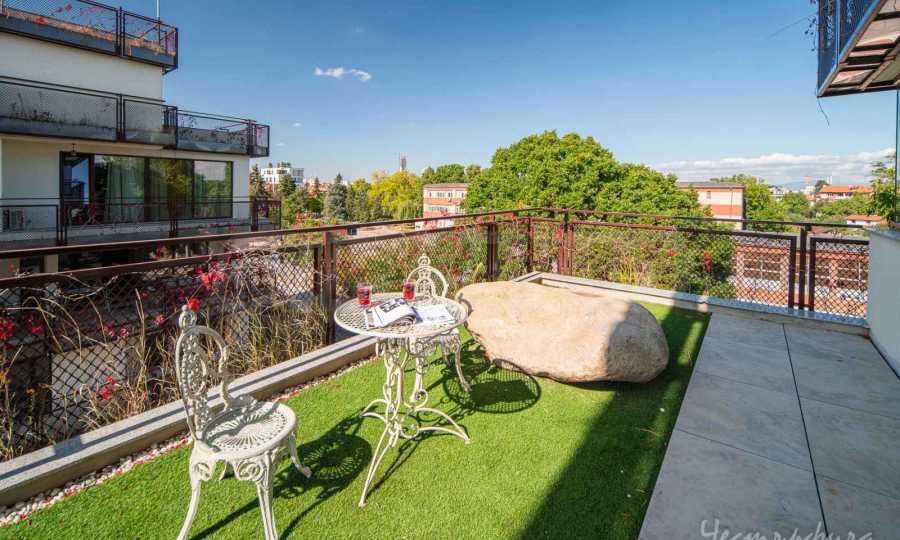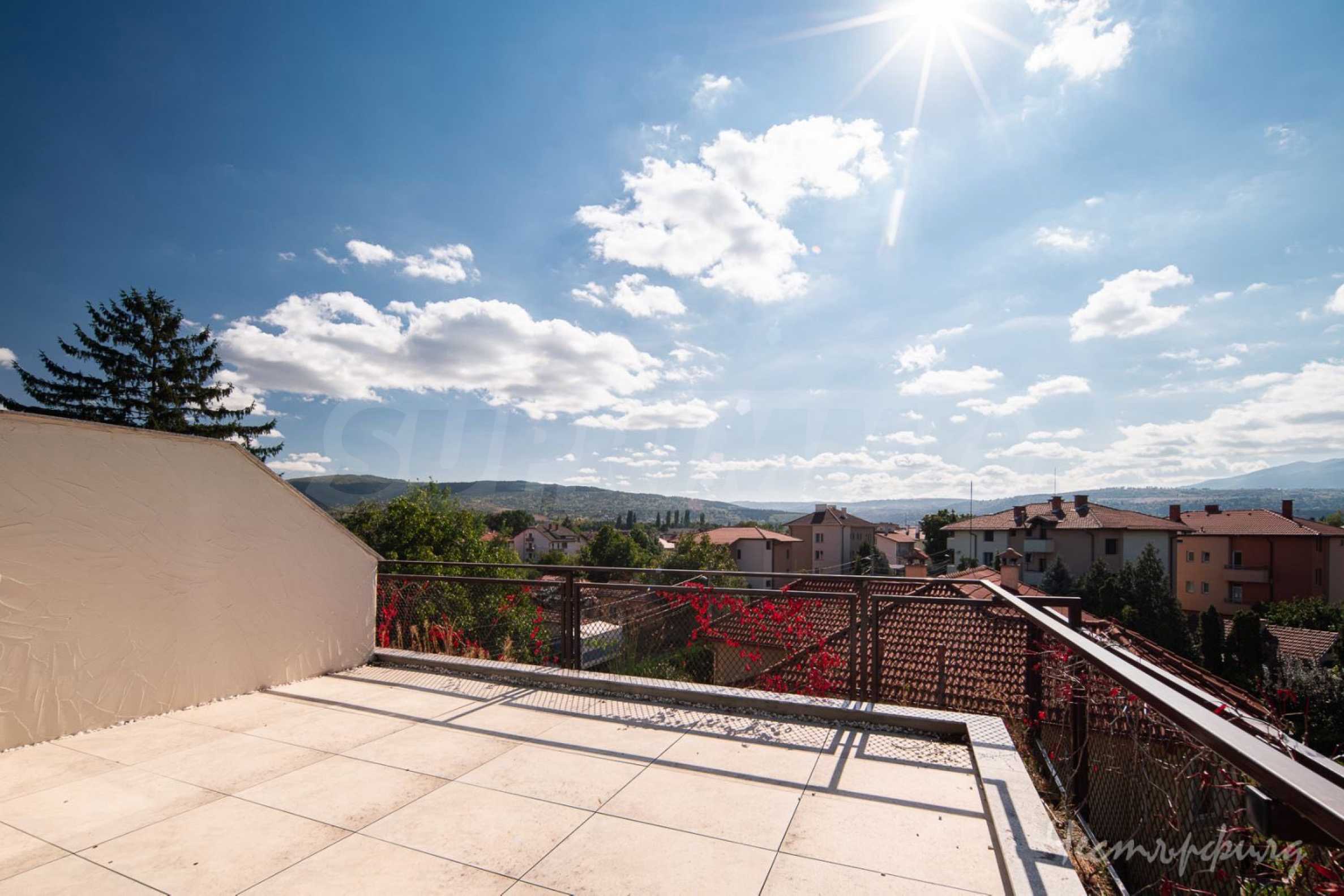The apartment is spread over two levels, with the first level offering a spacious, light-filled living room with an open kitchen. Here you will also find a functionally separated home office space, ideal for working from home, a stylish guest toilet, as well as a hidden laundry room. An exceptional advantage of this level is the impressive terrace with panoramic views of Vitosha and the Lozen Mountains - a place that will win you over both for your morning coffee and evening relaxation.