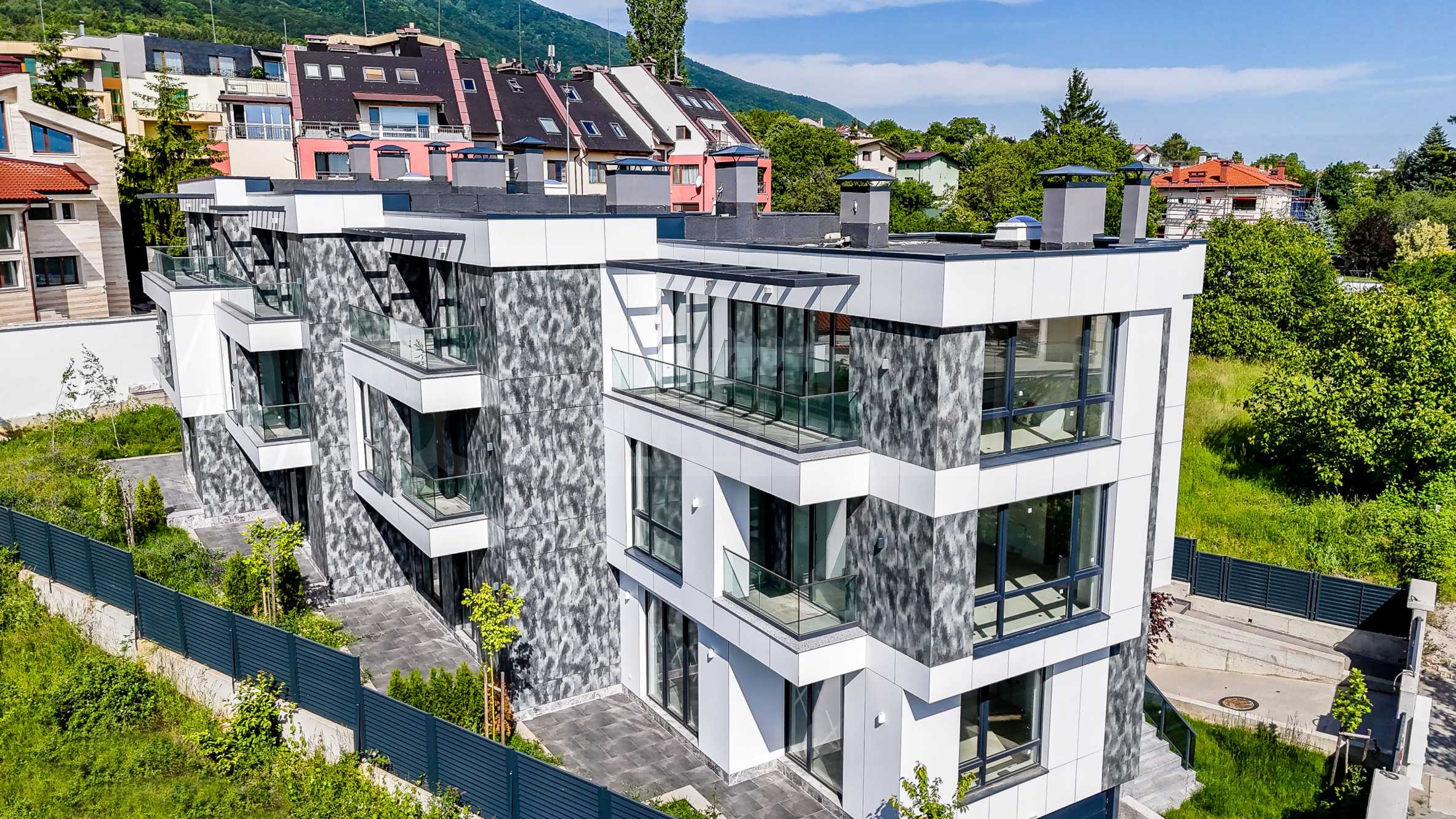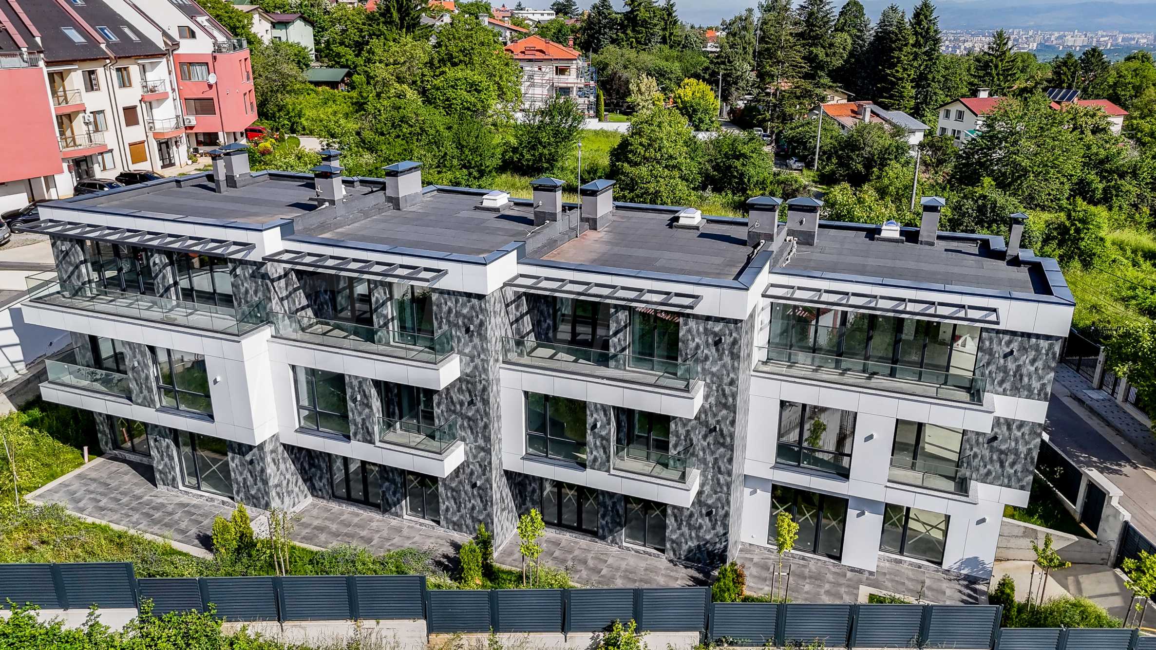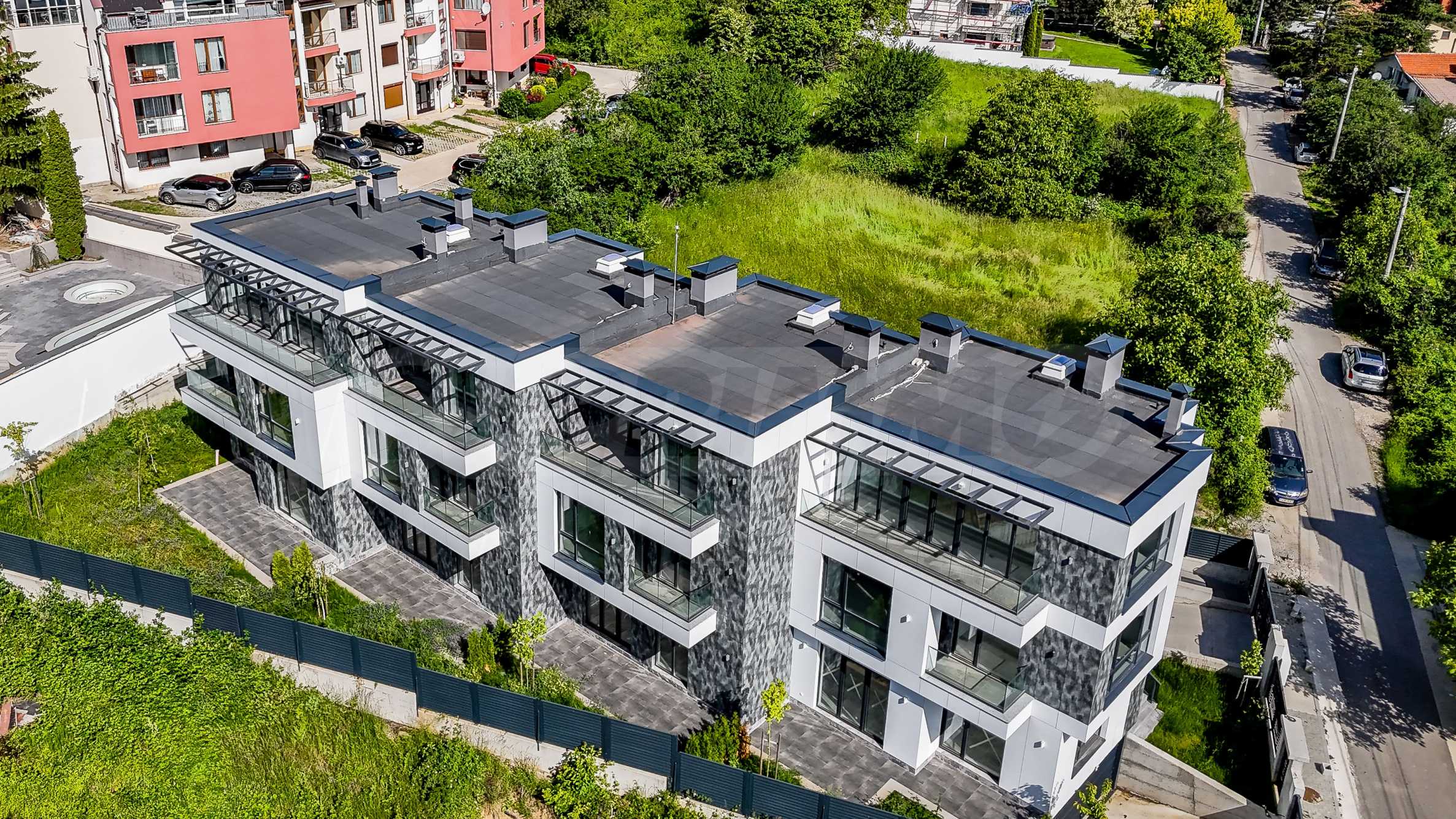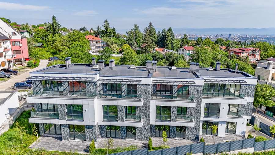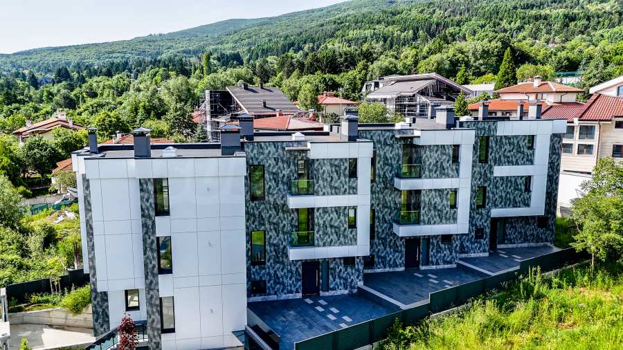 The complex is organized in four buildings designed as a row development, with a modern architectural vision and high-class materials and techniques used in the construction. Each house consists of three above ground levels and one basement level with a double garage with individual garage door and storage space. The houses have functional and spacious rooms with floor-to-ceiling windows that provide plenty of natural light and views of Vitosha, they also have a veranda, and access is controlled to ensure comfort and security.