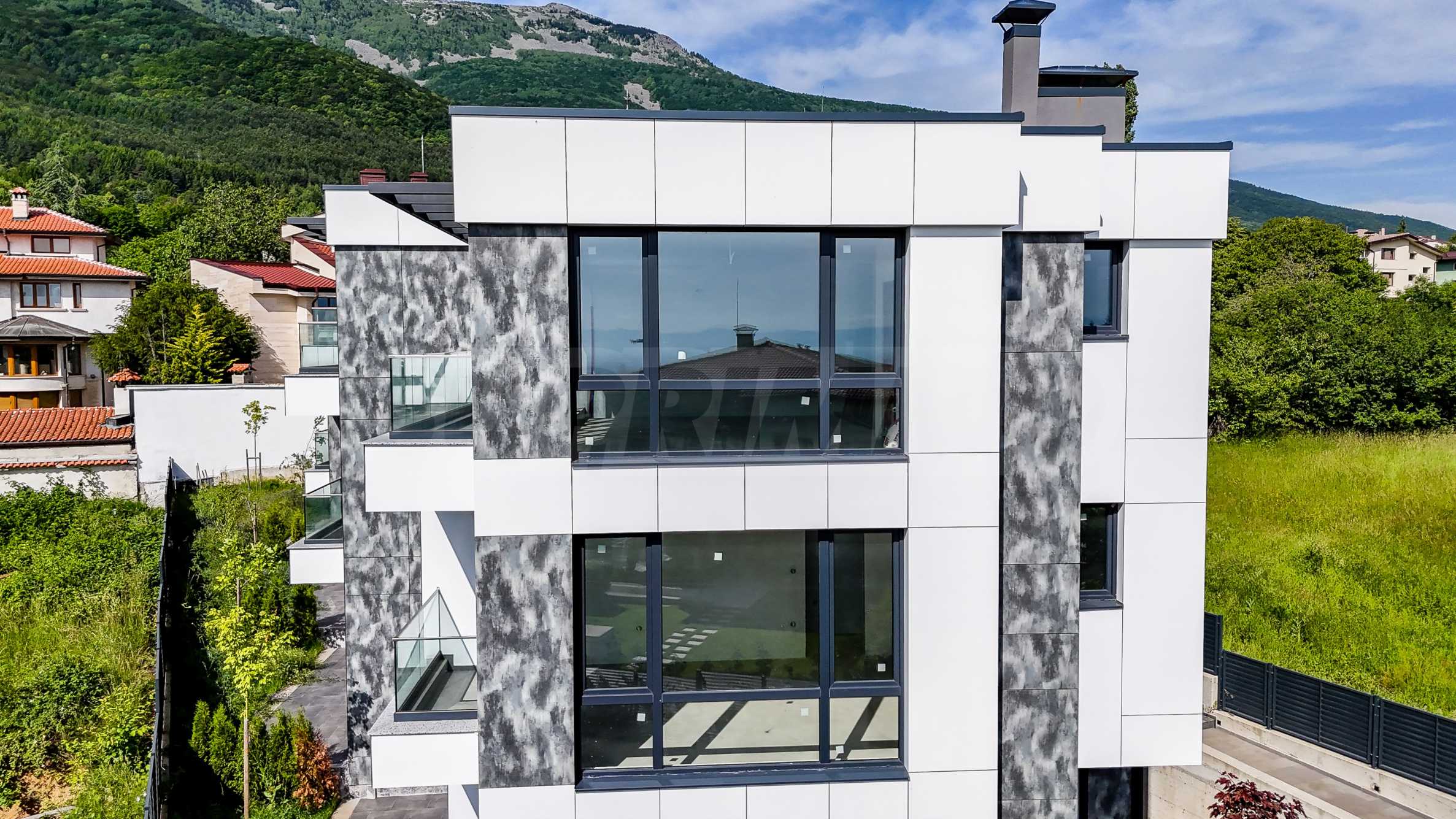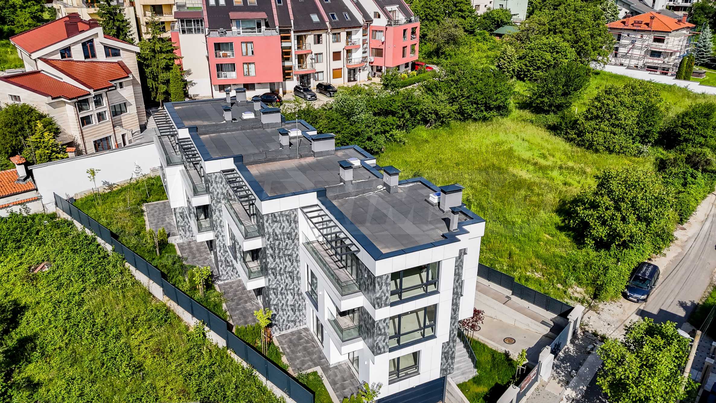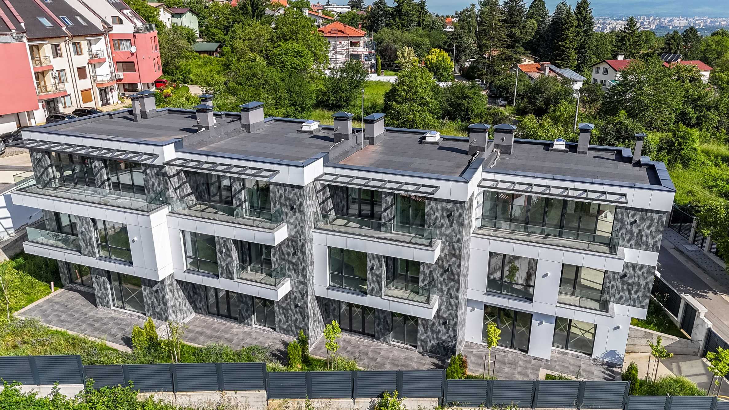 The complex is organized in four buildings designed as a row development, with a modern architectural vision and high-class materials and techniques used in the construction. Each house consists of three above ground levels and one basement level with a double garage with individual garage door and storage space. The houses have functional and spacious rooms with floor-to-ceiling windows that provide plenty of natural light and views of Vitosha, they also have a veranda, and access is controlled to ensure comfort and security.