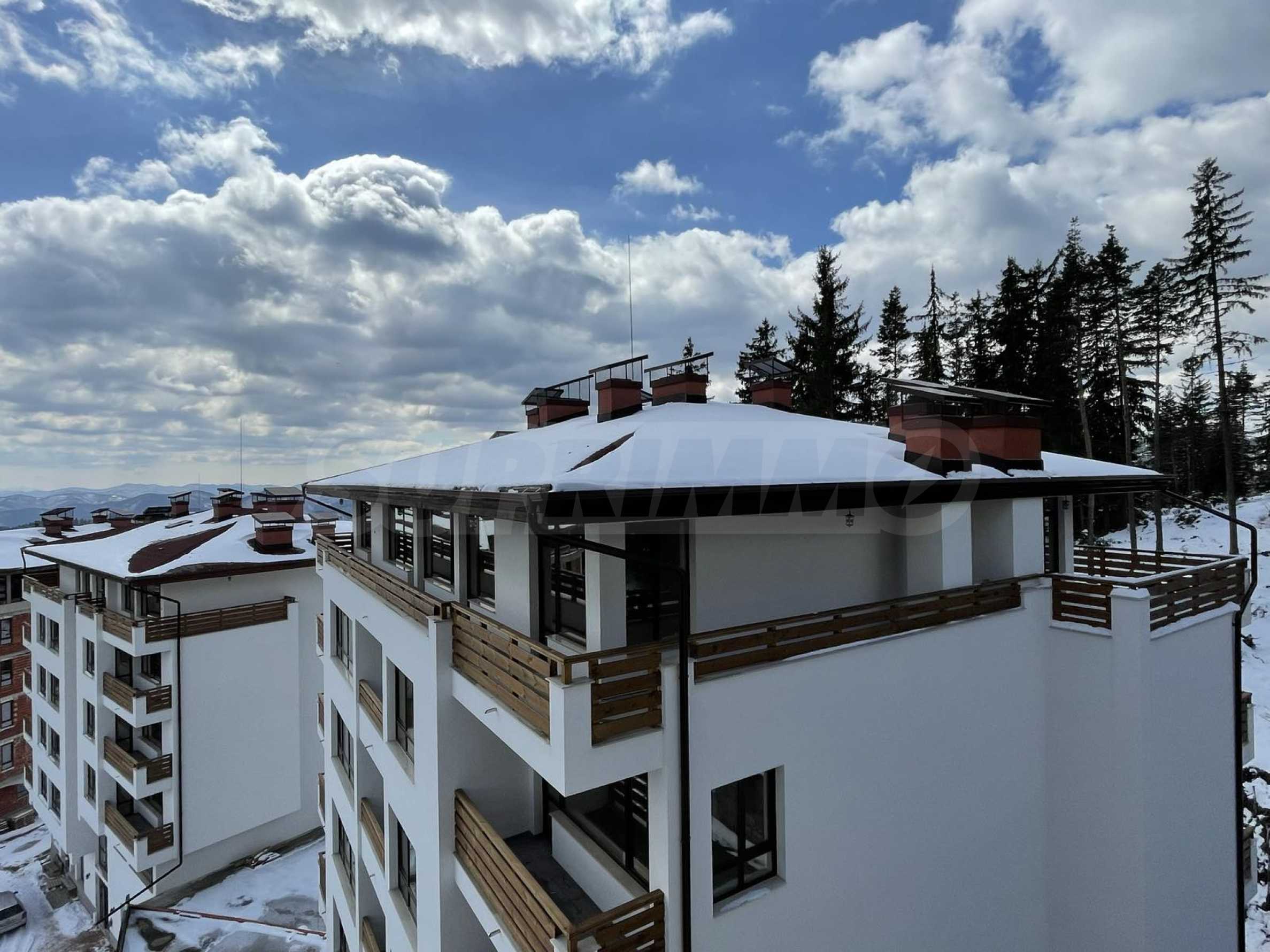 The buildings are in an architectural style characteristic of the area, with wooden cladding on the facade and stone cladding in the lower part of the buildings. Each entrance has an elevator and stylishly finished common areas. The properties are in dark PVC windows with high thermal insulation quality, in a wood tone in harmony with nature and in contrast with the white facade covered with silicone structural plaster.