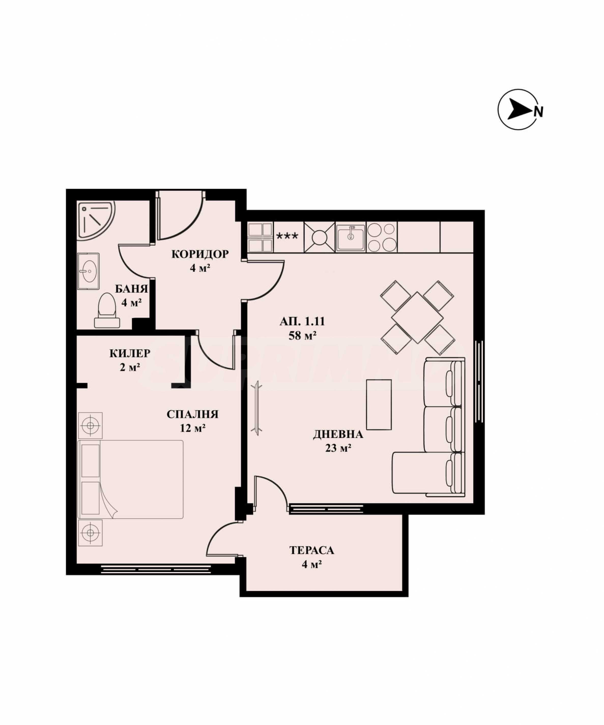 The apartment is located on the 3rd floor out of a total of 4, offers an east/south exposure and a total area of 65.47 m2 (net residential - 58.06 m2, common parts - 6.51 m2). It consists of a living room with a kitchenette, a bedroom, a bathroom with a toilet, a terrace.