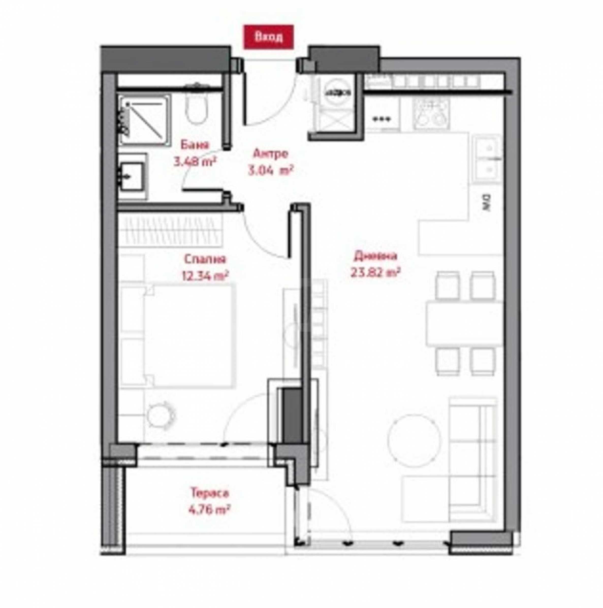 • bedroom - 12.34 m2;