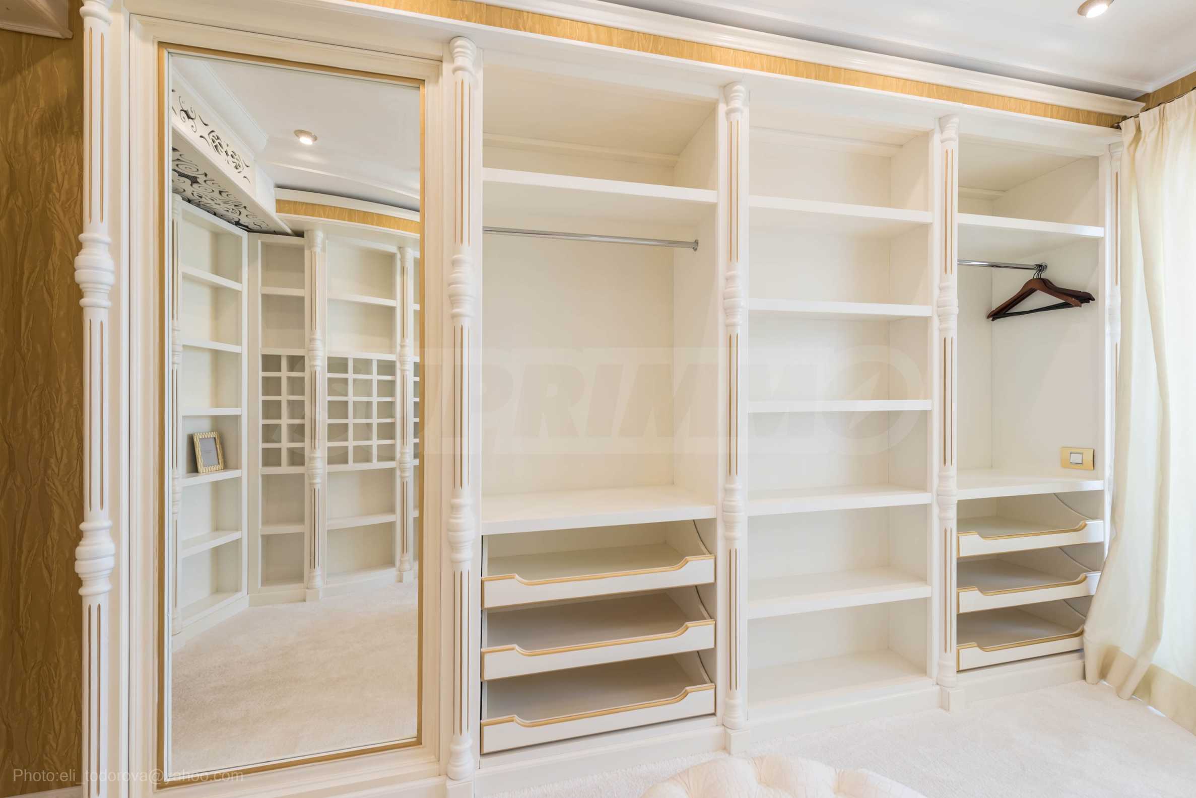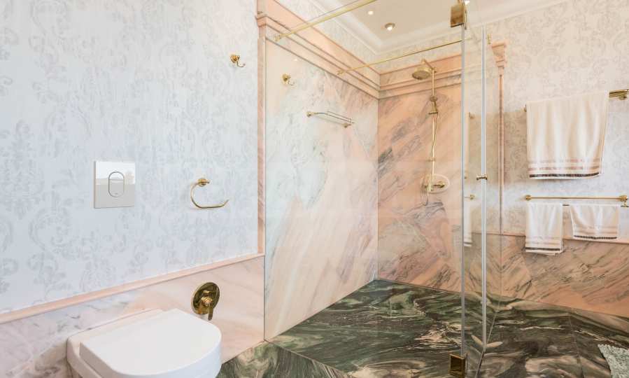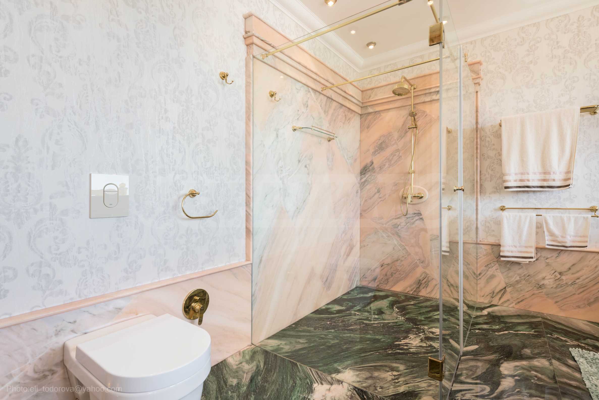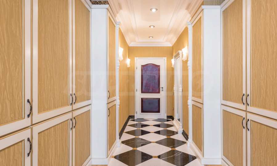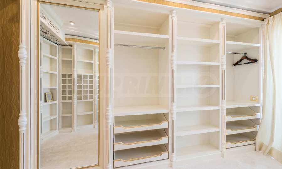 Stylized ceilings, a unique floor in the living room with gold accents, growing into the columns and the kitchen backsplash, sumptuous wardrobes with elegant elements, everything here is thought out to the smallest detail, carrying a timeless spirit and the exact proportions of the classics and its own character.