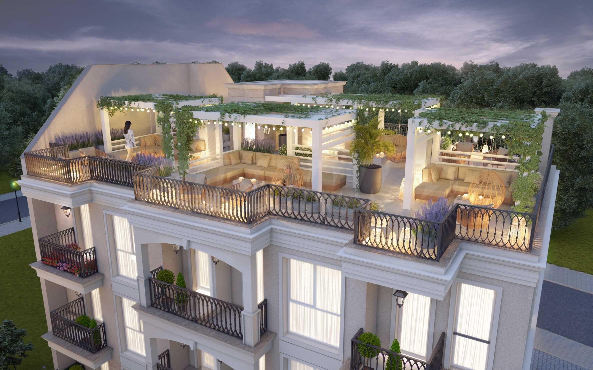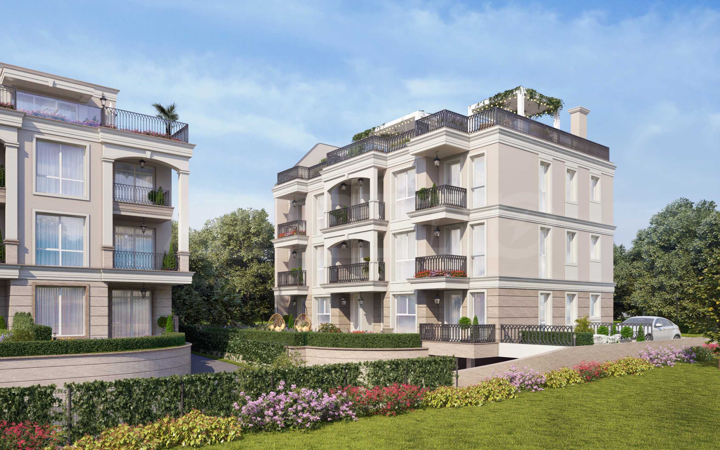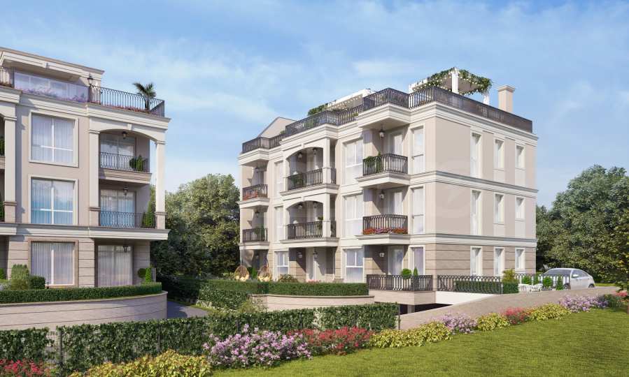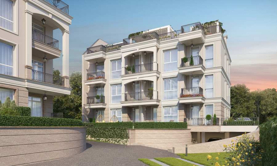 The building is distributed over three residential floors with an underground garage, an elevator, with private courtyards for the apartments on the first floor and spacious roof terraces on the 4th level, especially for the apartments on the third floor. The facade is selected in the style of the already built, neighboring building of the investor. It is distinguished by a stylish architectural design in neoclassical style, with beautiful arches and elements characteristic of the Mediterranean regions from the period of classical antiquity.